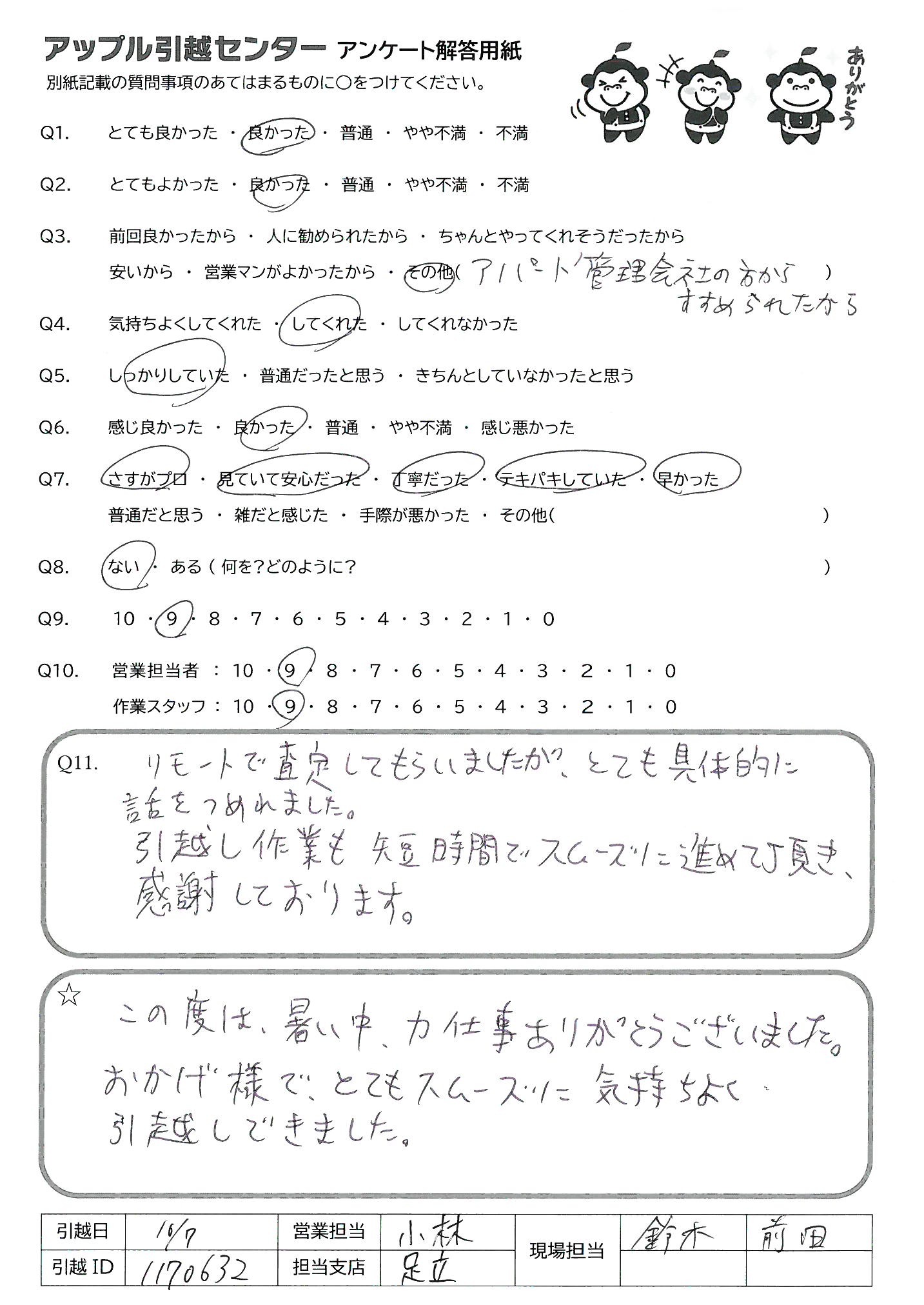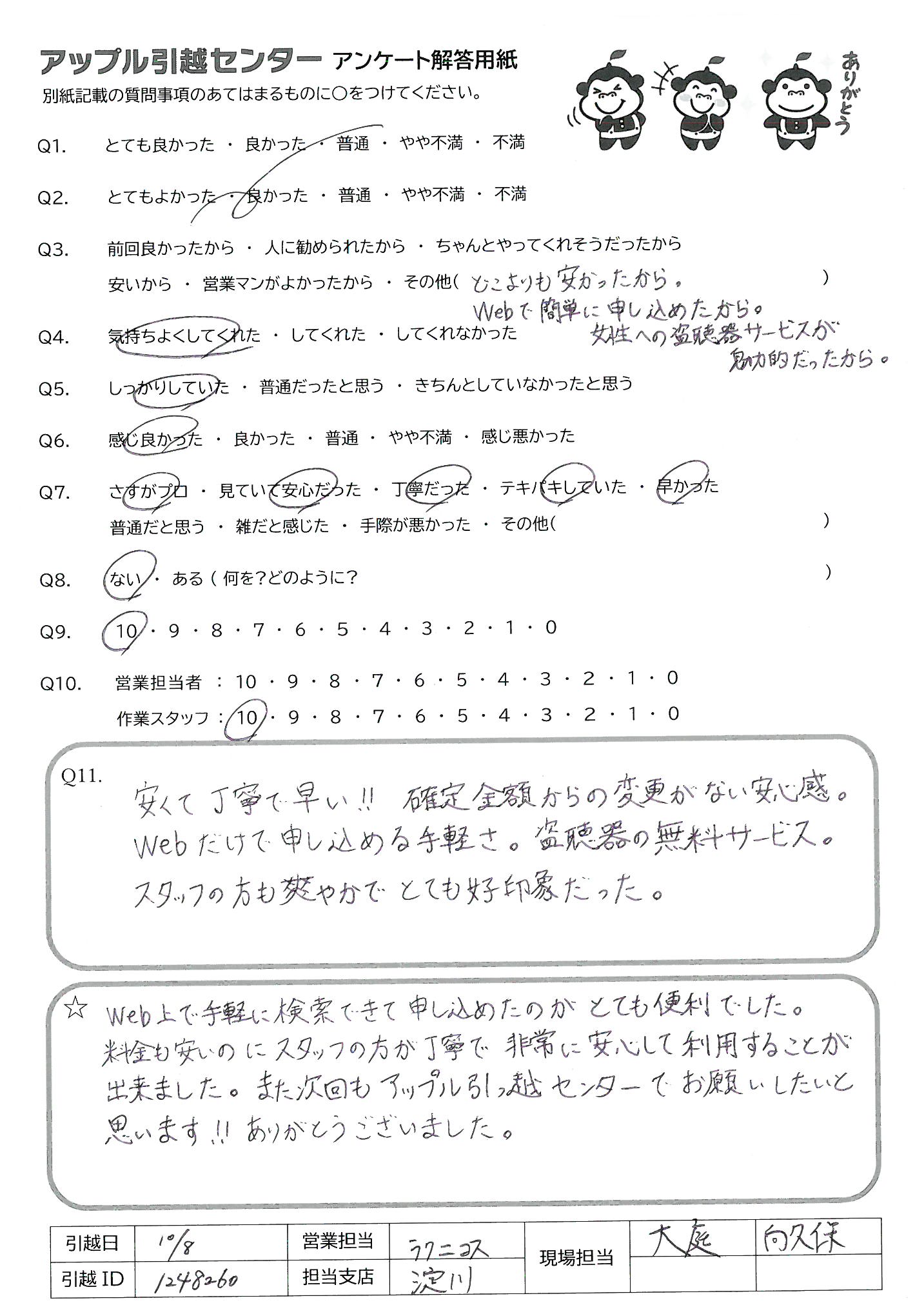 A.離婚をして、初めて、1人で引越し業者さんを手配したり準備をしたので、とても緊張していましたが、本当に親切にして頂きました。いろいろとご迷惑をおかけしてしまったのに丁寧に応対して下さり感謝しています。 本当にどうもありがとうございました。