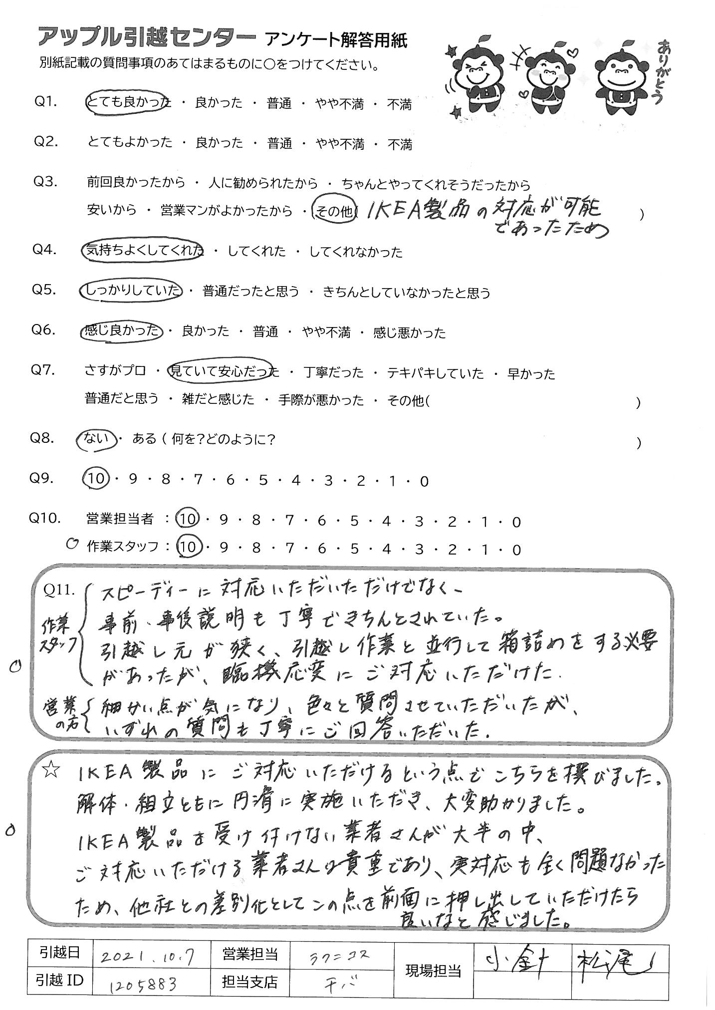 A.IKEA製品にご対応いただけるという点でこちらを選びました。 解体・組立ともに円滑に実施いただき、大変助かりました。 IKEA製品をお受け付けない業者さんが大半の中、 ご対応いただける業者さんは貴重であり、実対応も全く問題なかったため、他社との差別化としてこの点を前面に押し出していただけたら良いなと感じました。
