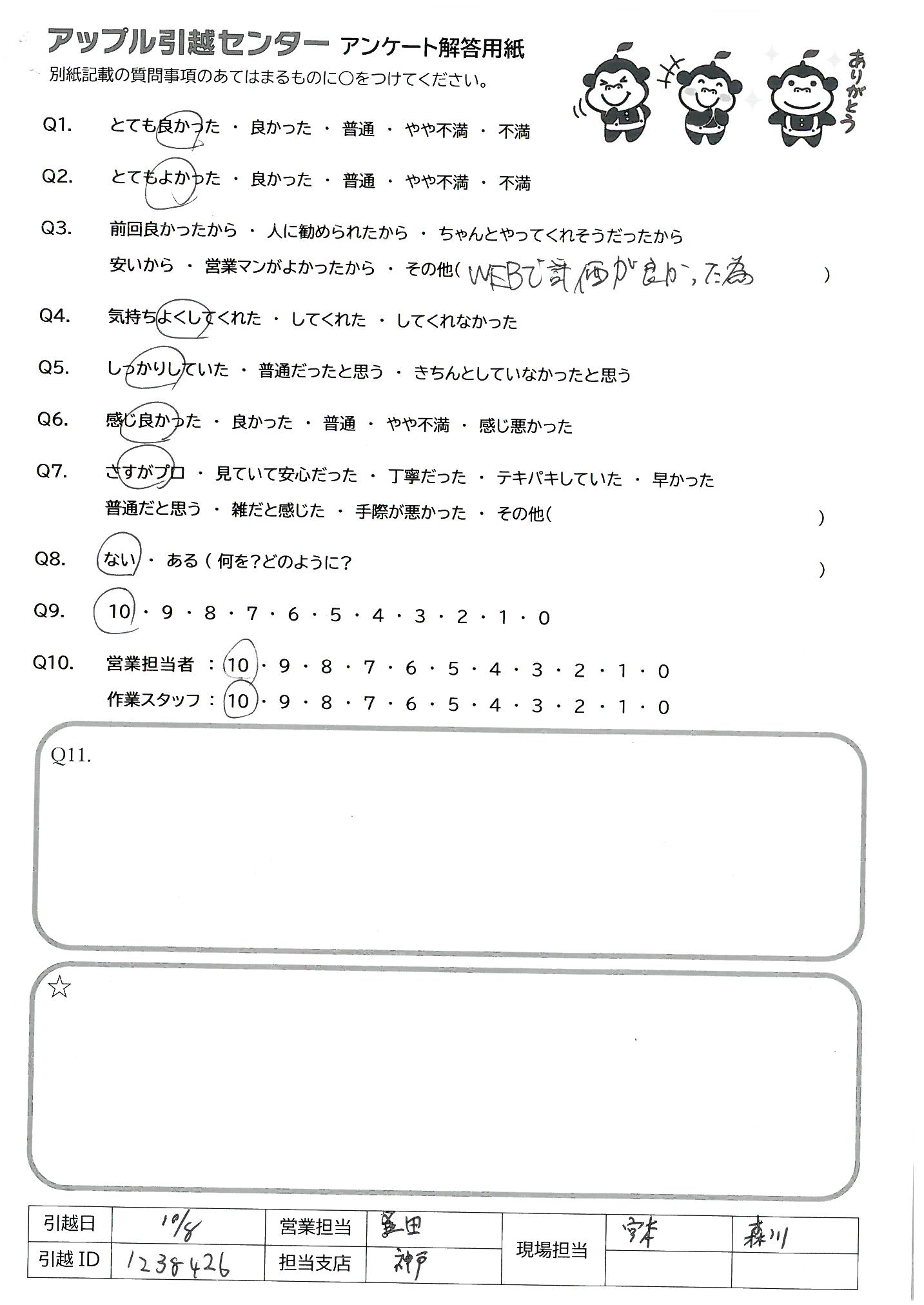 A.Q9.最安値で、大物家具をどれだけ運べるか、丁寧に対応頂けた Q10.引っ越し当日、予定より多くの荷物を運んで頂いた。 「御客様」第一の精神が全面に出て、とても感謝しています。
