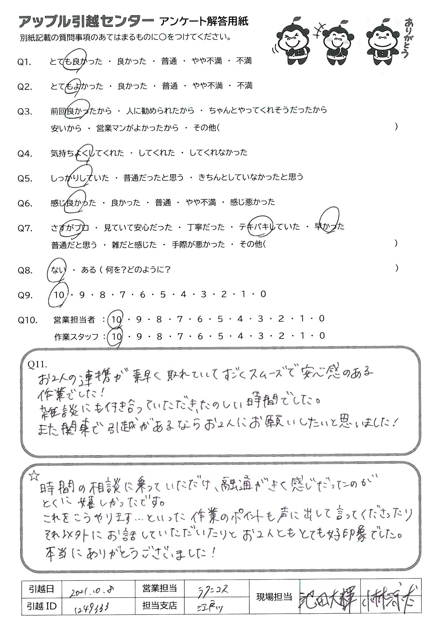 A.見積もりをしてくださった吉川さんは、LINEでの見積もりでしたが、わかりやすく丁寧に見積もりをしてくださいました。 いくつか質問を投げさせて頂きまして、当日の担当者の方に接続頂いたので、話がスムーズでした。 一方で、LINEへの質問は回答が無かったので少し不安になりましたが、タイミングの問題だったかと思います。 当日の引っ越しスタッフの皆さんはとても丁寧な上、近所の方が見学に来るくらいテキパキとした連携プレーをしてくださいました。 荷物を運ぶのも丁寧に素早く対応頂いた上、洗濯機の設置の仕方のアドバイスなど、提案頂いた内容も納得感があるものでした。 また、新築物件ということもありましたが、養生もしっかり行って頂き、荷物の置き方なども整理がしやすいようになど、配慮してくださりありがとうございます。 今回、2度目のアップルさんでしたが、どの方もとても爽やか、丁寧で非常に安心感があります。 本当にありがとうございました。