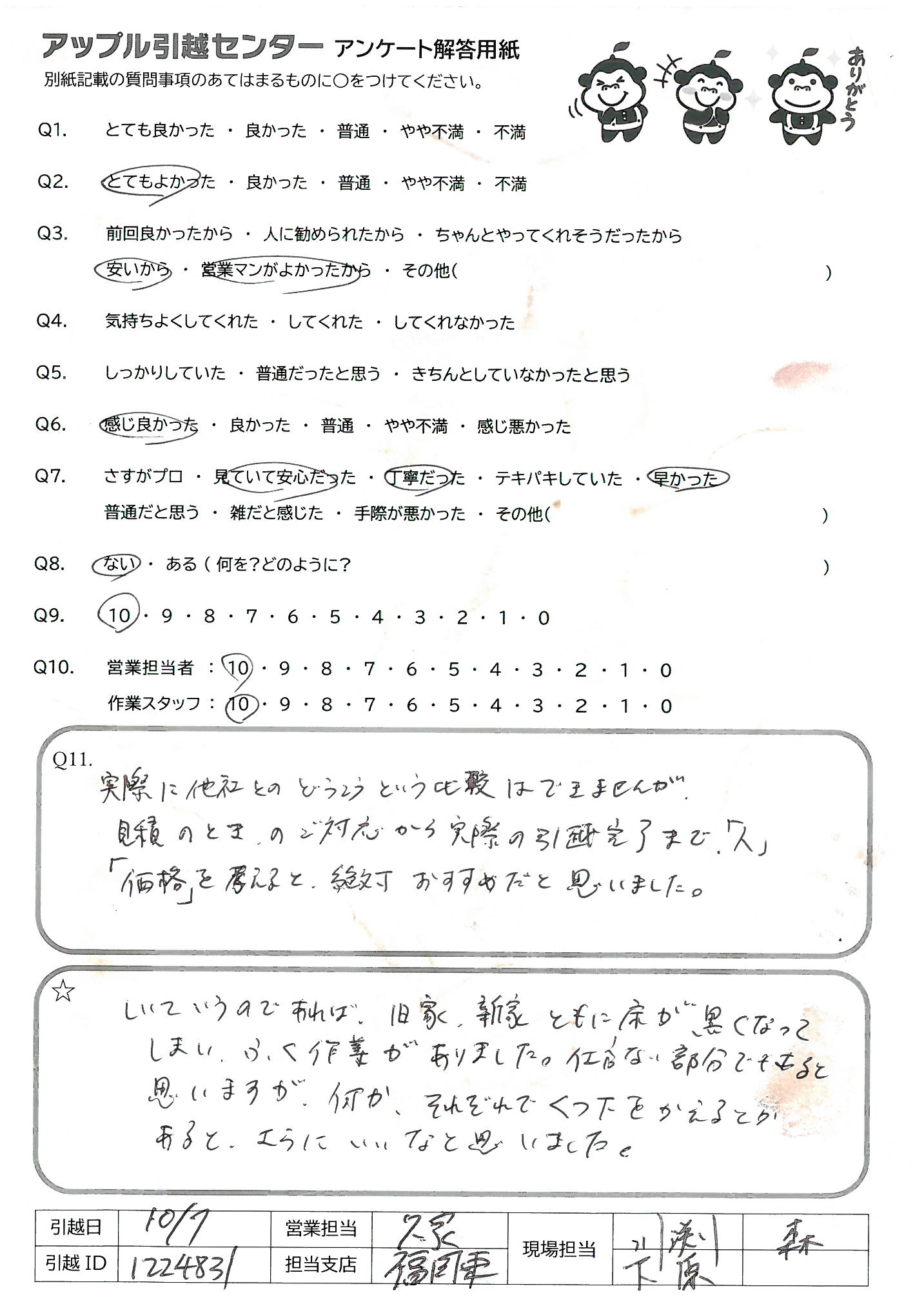 A.今回初めて利用いたしましたが、大変気持ちの良いお引っ越しになりました。他の会社と相見積もりをとり、一番安かった訳ではありませんでしたが、価格以上の仕事をして下さり、大満足です。また是非お願いしたいですし、他の方にも勧めたいです。