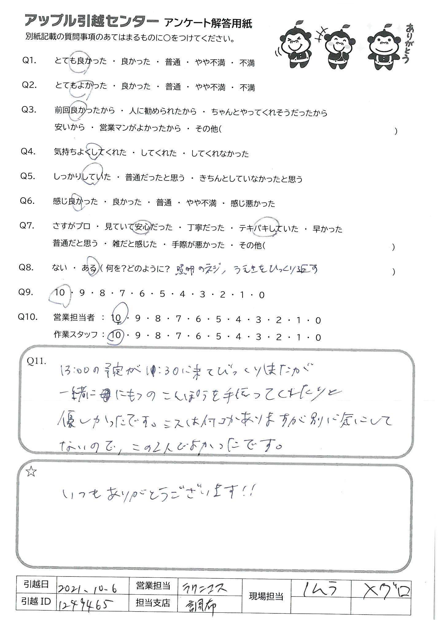 A.13:00の予定が11:30に来てびっくりはしたが 一緒ににもつのこんぽうを手伝ってくれたりと 優しかったです。ミスは何コかありますが別に気にしてないので、この2人でよかったです。