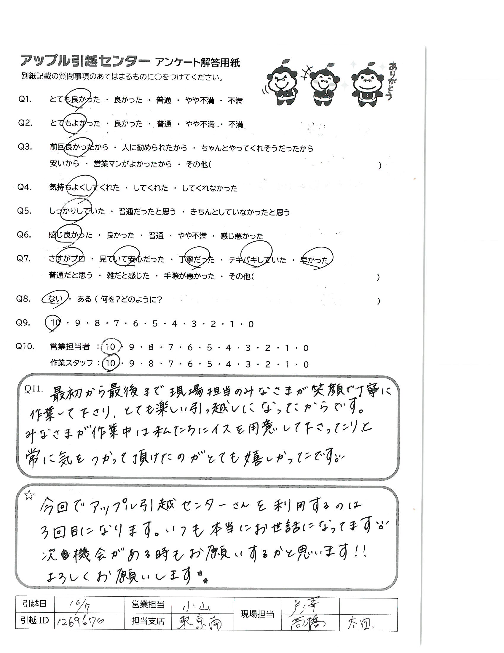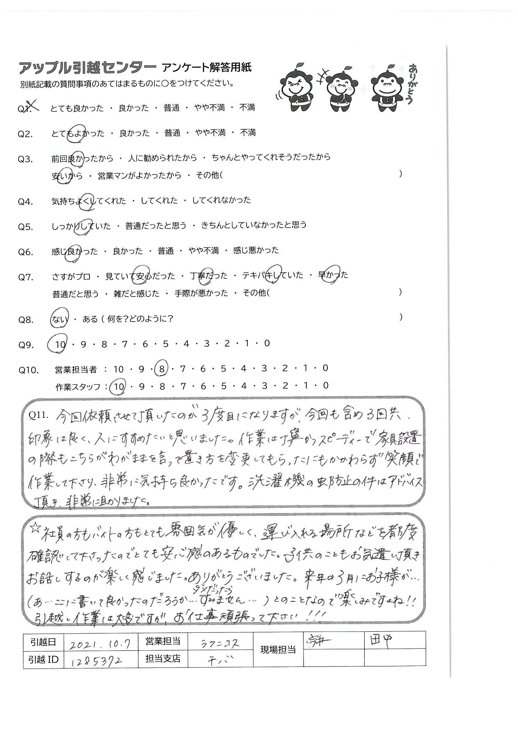 A.今回でアップル引越センターさんを利用するのは3回目になります。いつも本当にお世話になってます 次機会がある時もお願いするかと思います!! よろしくお願いします