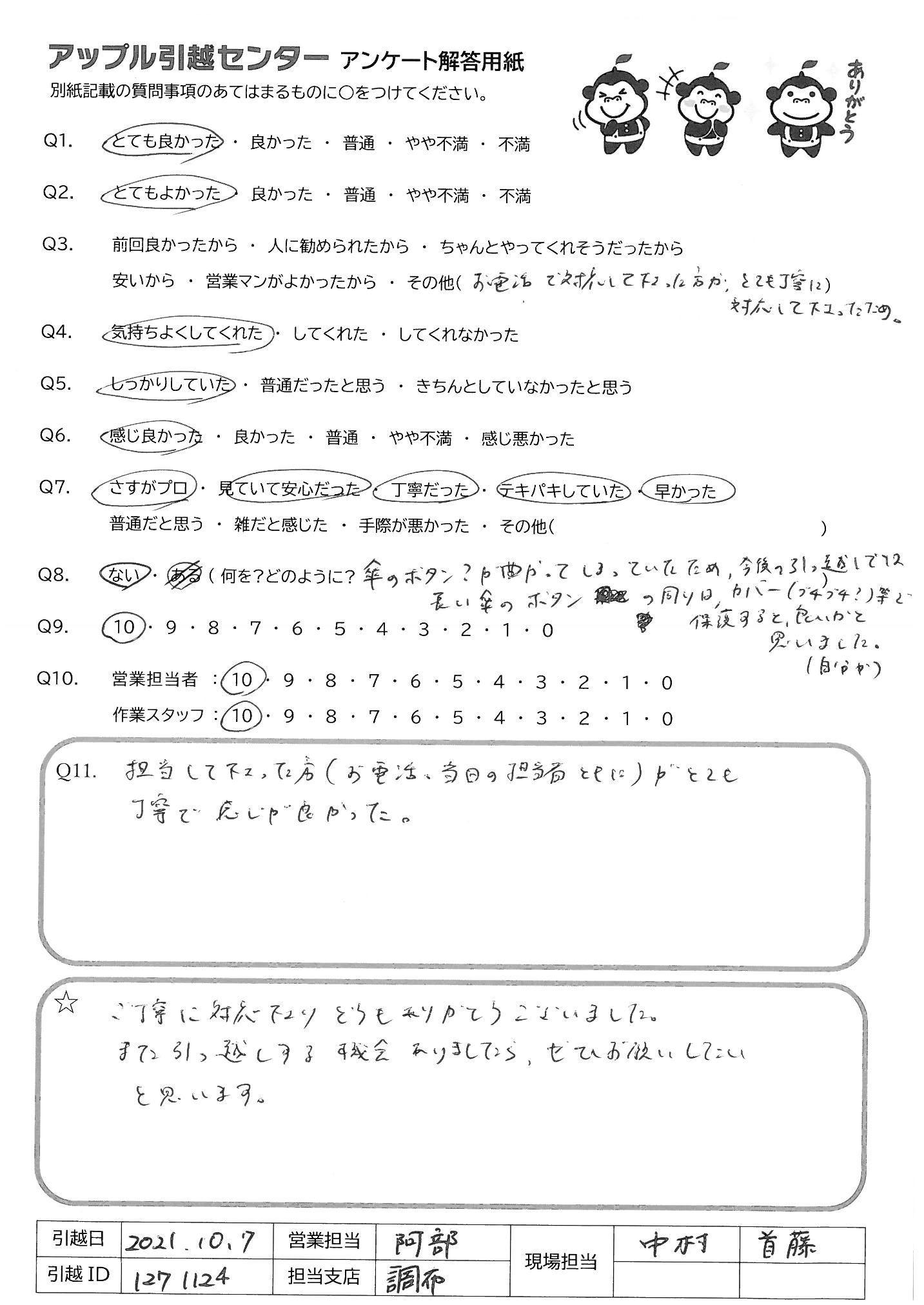 A.ご丁寧に対応下さりどうもありがとうございました。 また引っ越しする機会ありましたら、ぜひお願いしたいと思います。