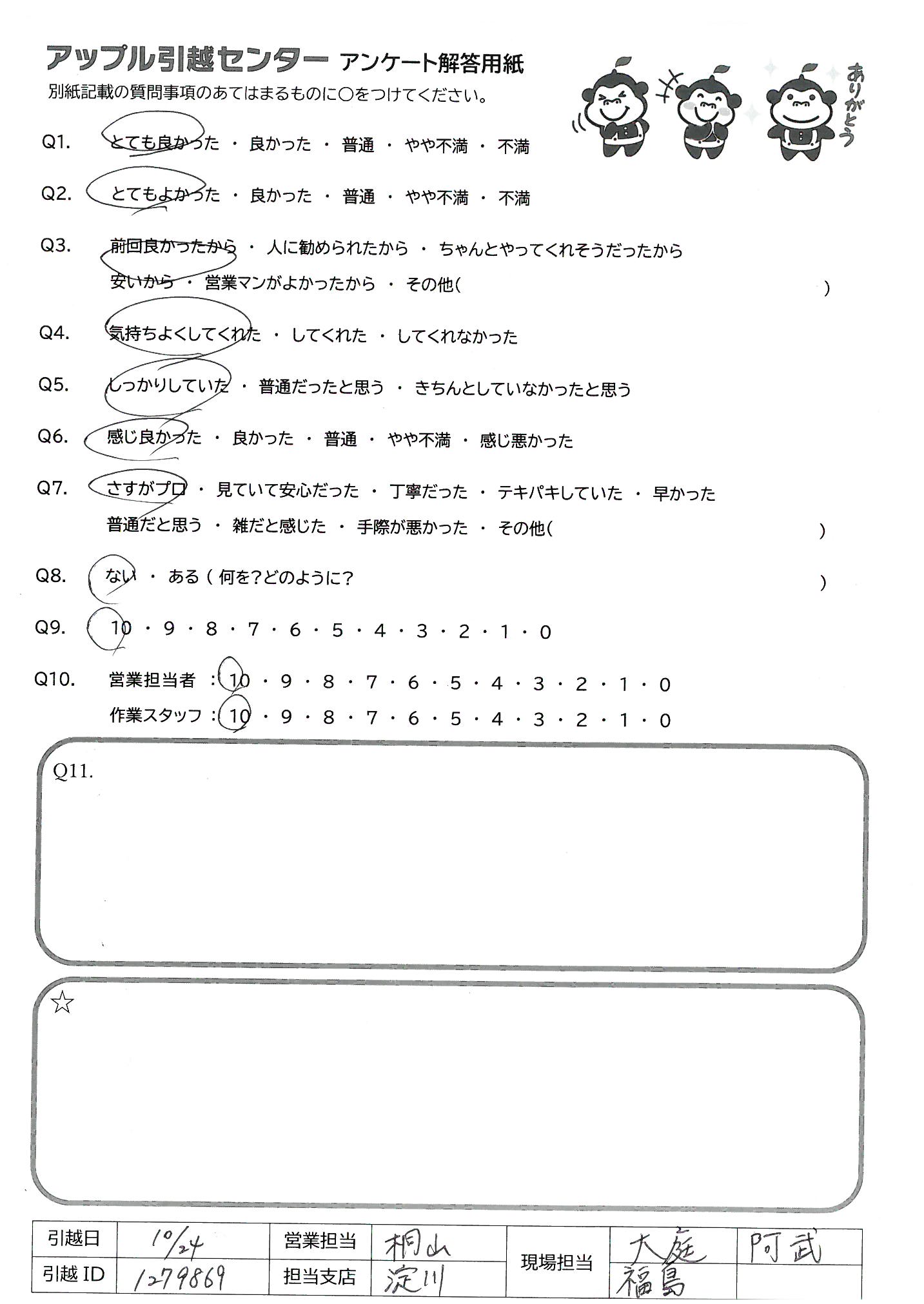 A.電話の受付の方がとても好印象で、安心してお任せ出来そうだと感じました。引っ越し当日も事前の訪問電話から、大変感じがよかったです。作業も早く、大型家電を運びだす作業では壁や床を傷付けないようにと、とても丁寧に対応して下さいました。 現地でも手際良く運びこんで下さり、有難かったです。 お値段以上のお仕事をしていただき、大変満足です。 受付のナカムラ様、作業員のコウジ様、ナオエ様、本当にありがとうございました。 お陰様で気持ちよく、退去と入居ができました。