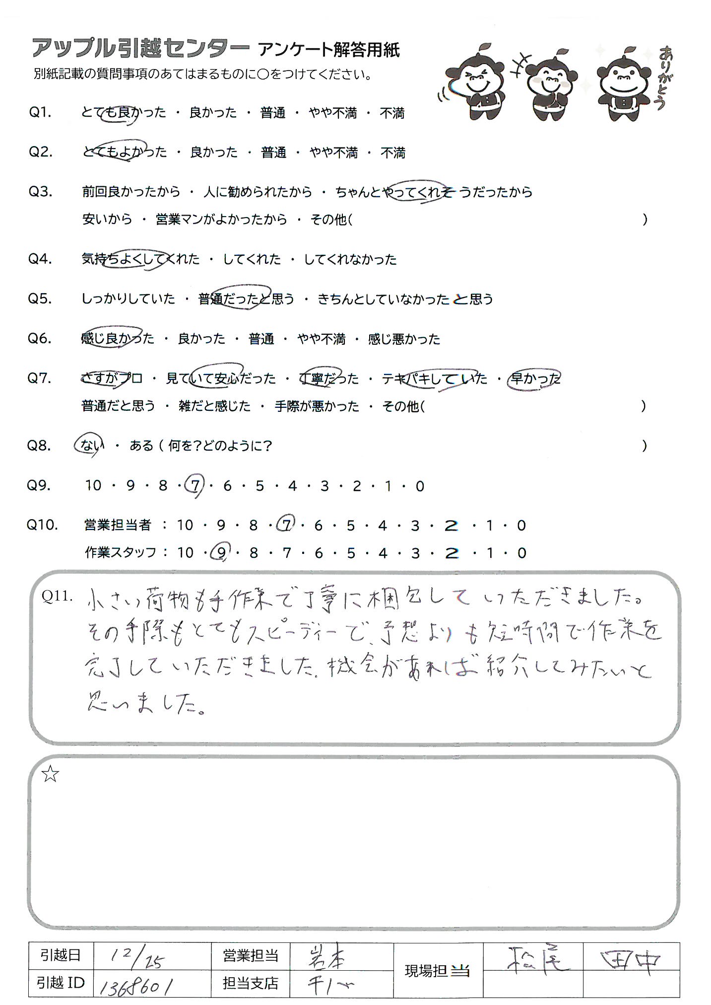 A.到着時間の遅れが気になりましたが、入口の狭い家でも、遅い時間まで頑張ってくださってとても助かりました。
