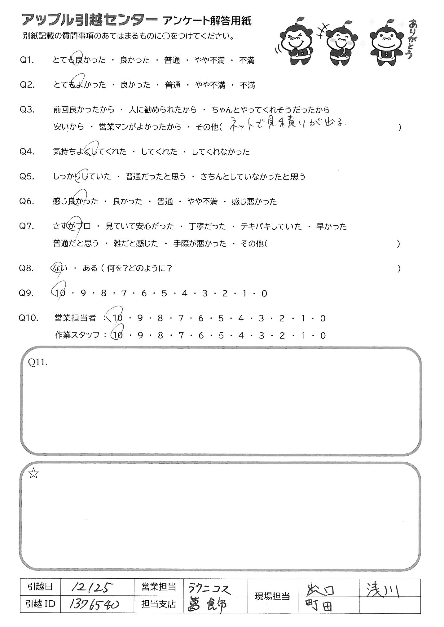 A.エレベーターのない団地でしたが、よくやってくださいました。費用も良心的でした。有り難うございます。