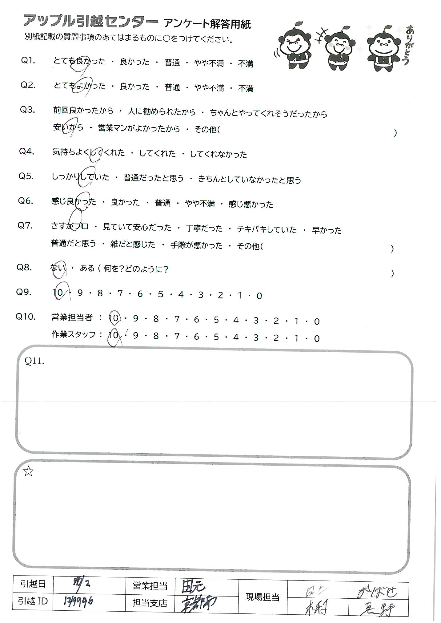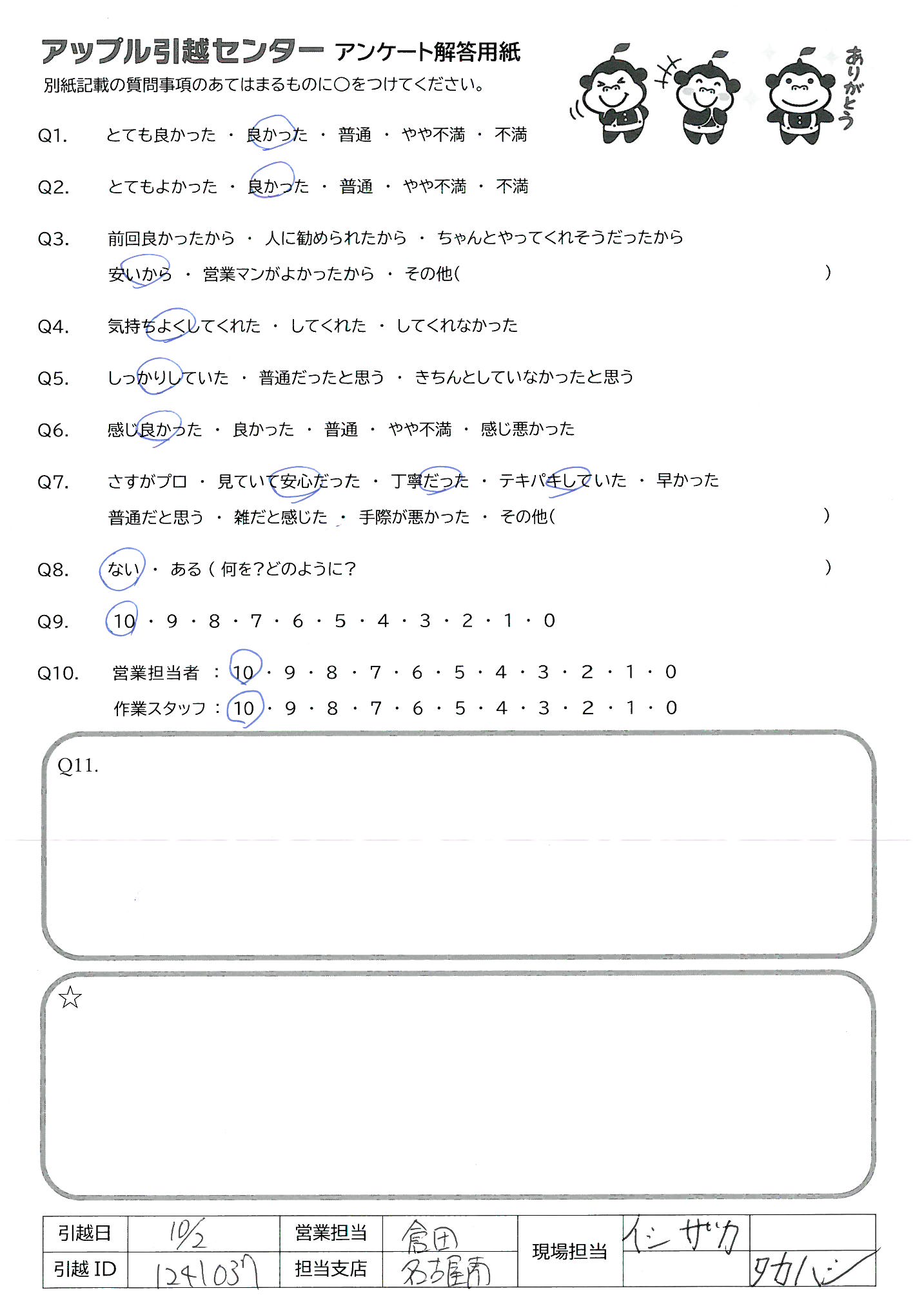 A.丁寧でテキパキと作業していただきました!次回また引越しをする際もアップルさんに任せたいと思います。