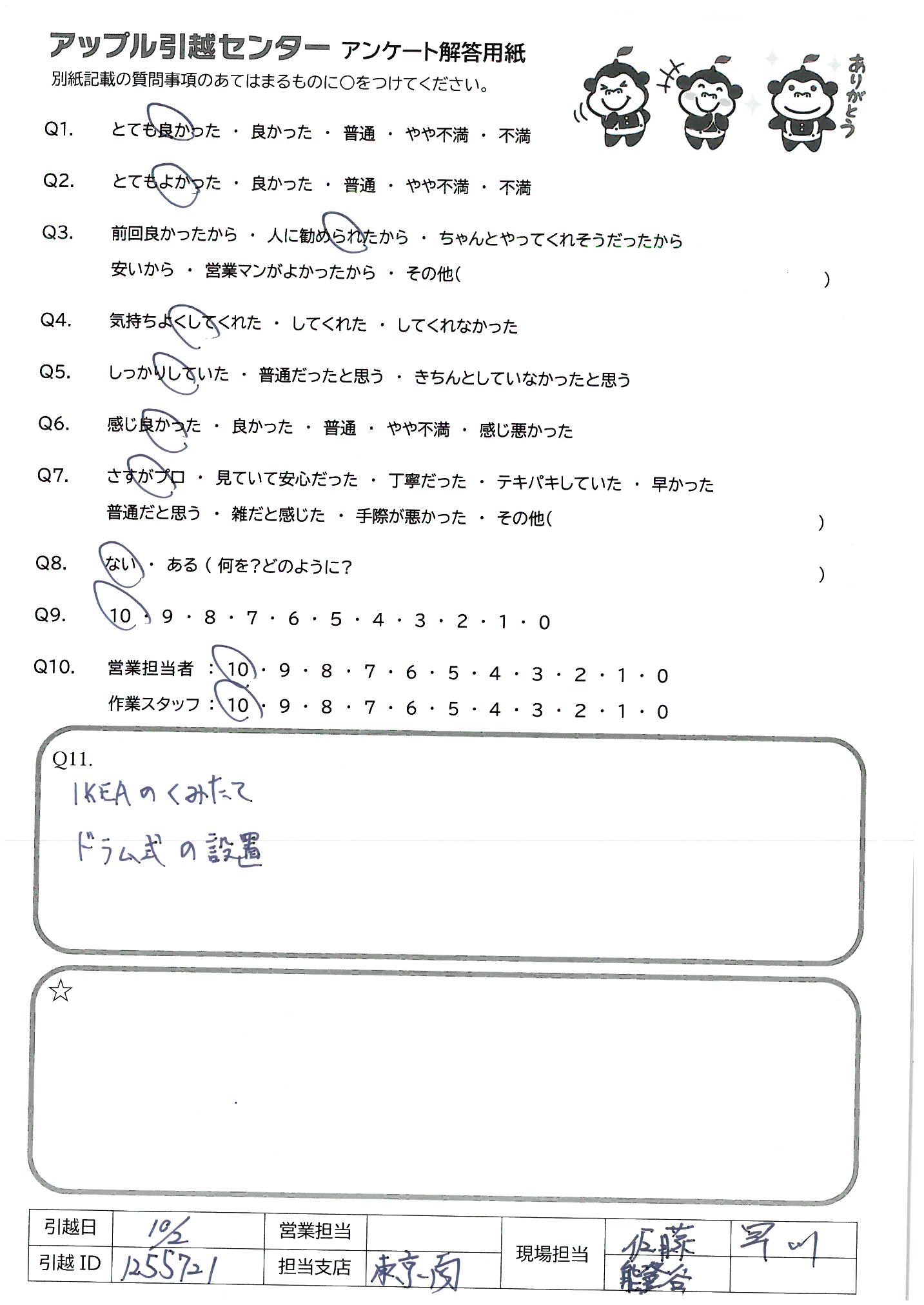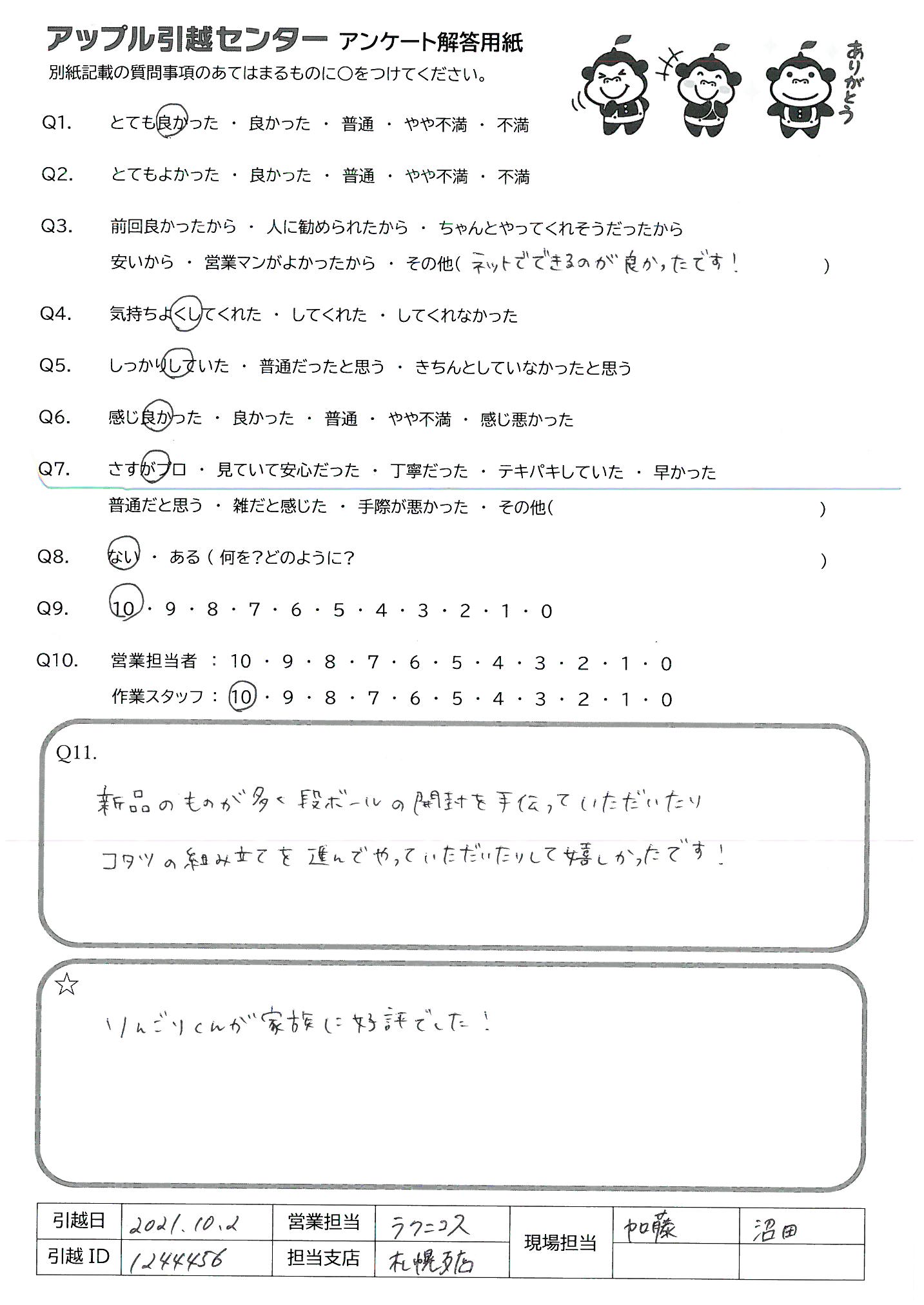 A.新品のものが多く段ボールの開封を手伝っていただいたりコタツの組み立てを進んでやっていただいたりして嬉しかったです!