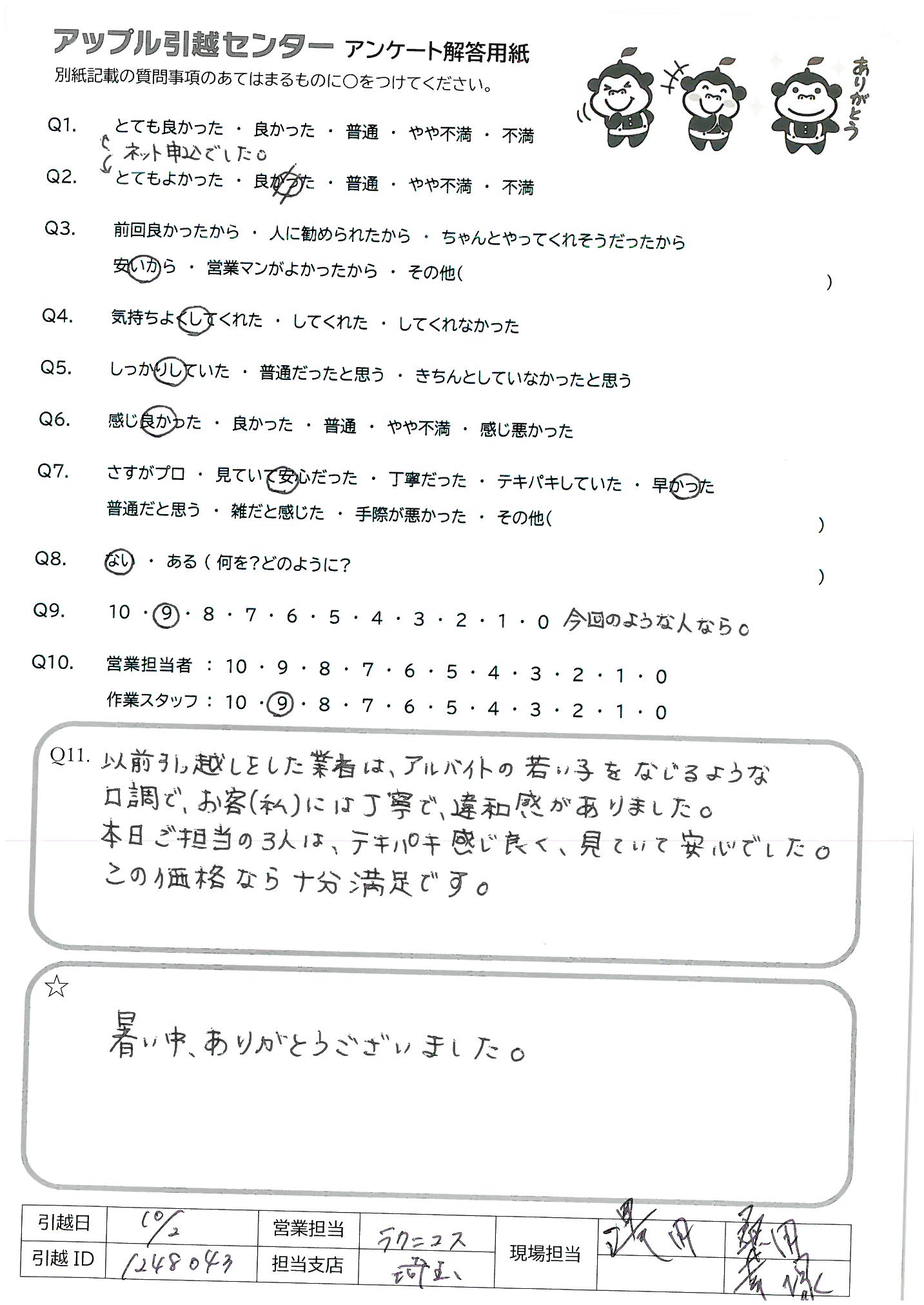 A.以前引っ越しをした業者は、アルバイトの若い子をなじるような口調で、お客(私)には丁寧で、違和感がありました。 本日ご担当の3人は、テキパキ感じ良く、見ていて安心でした。 この価格なら十分満足です。