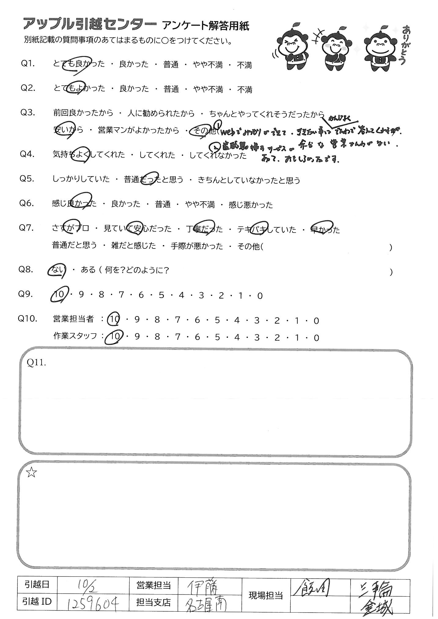 A.電話口の方も強く勧めるわけでもなく、見積もりだけでも嫌な感じがありませんでした。 当日来られた方も前の引っ越しの状況や、到着時間など細かく連絡をいただきとてもありがたかったです。 また、引っ越す際はお願いしたいです。 ありがとうございました。