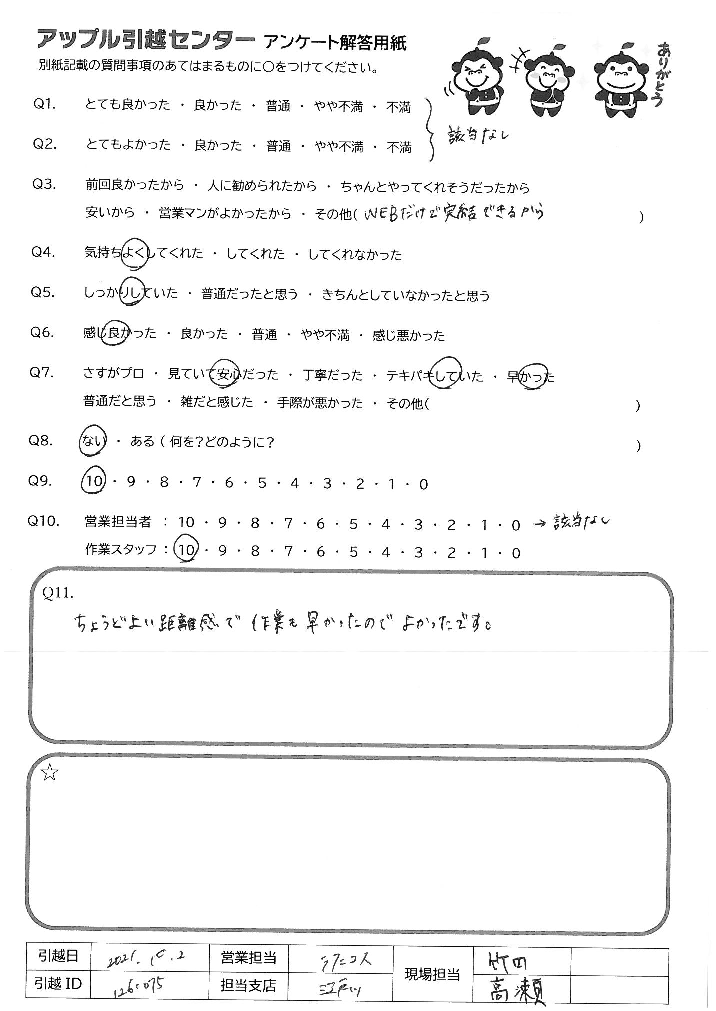 引越し日:2021年10月02日 エリア:愛知県名古屋市千種区