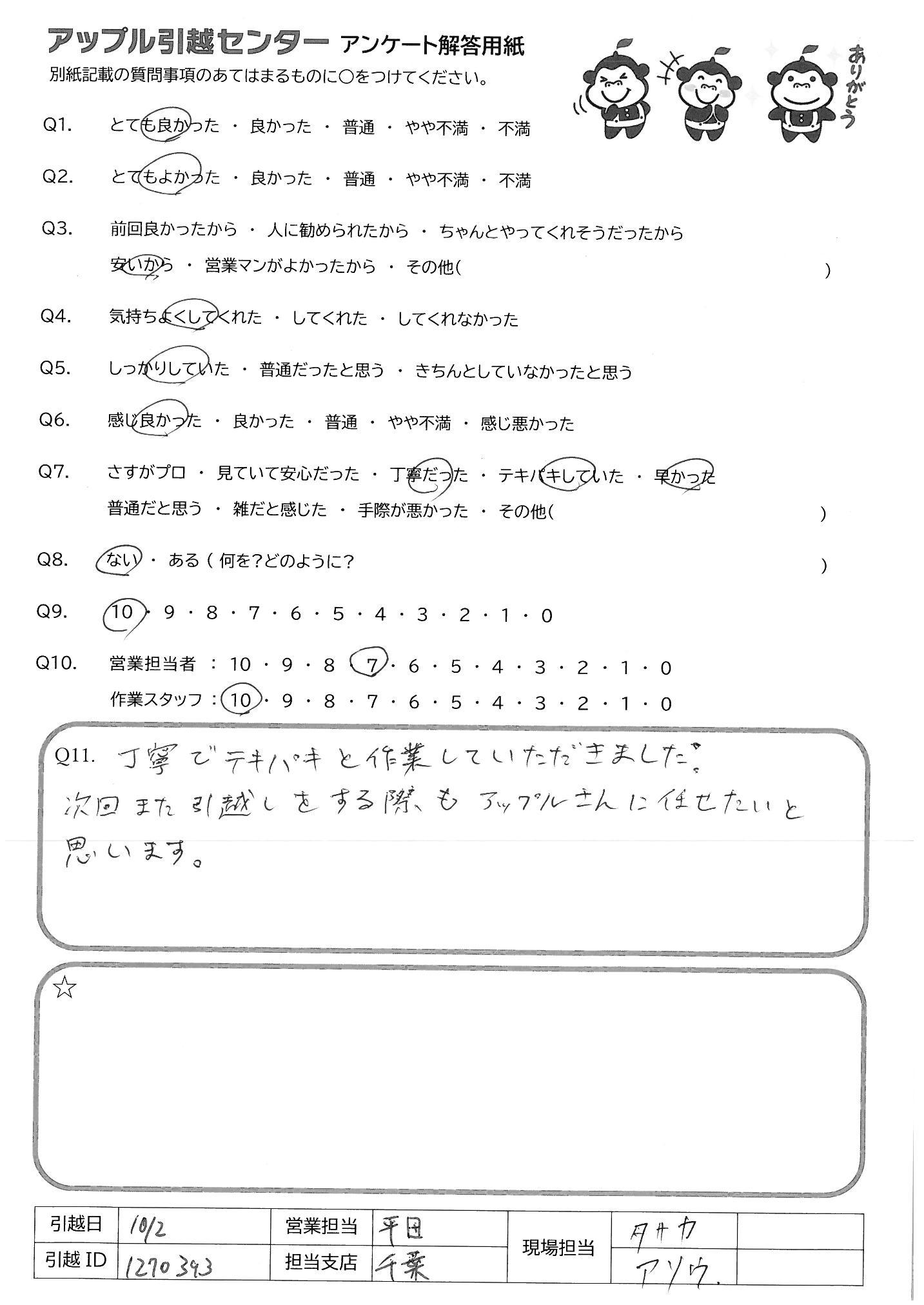 引越し日:2021年10月02日 エリア:千葉県千葉市中央区