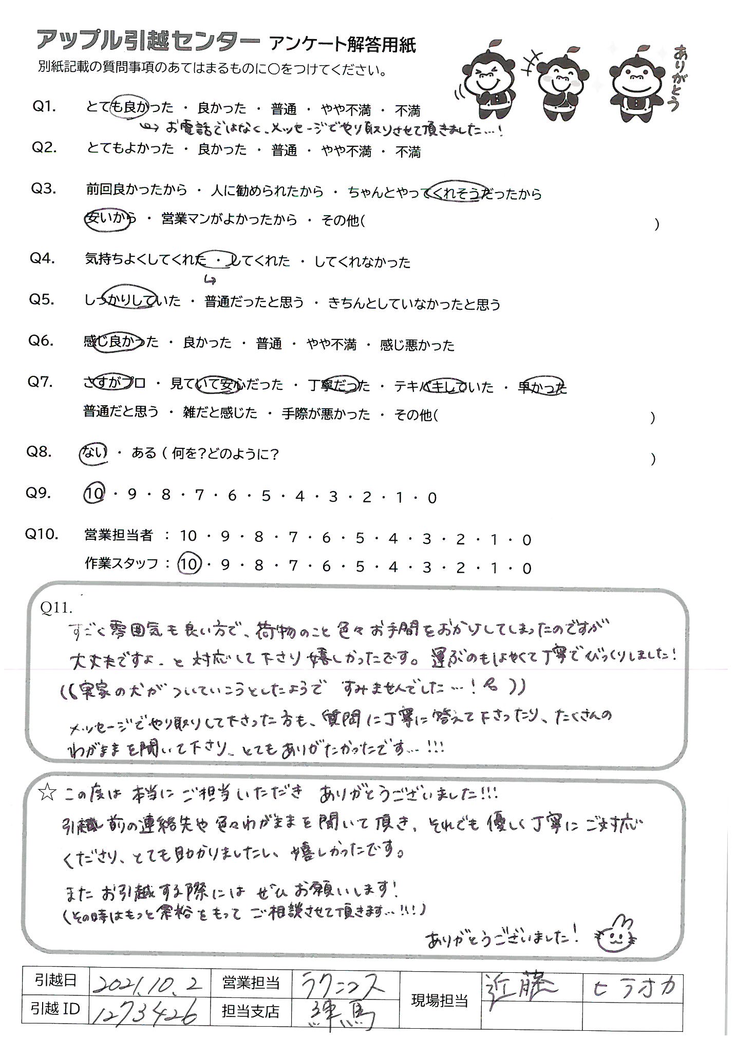 A.この度は本当にご担当いただきありがとうございました!!! 引越し前の連絡先や色々わがままを聞いて頂き、それでも優しく丁寧にご対応くださり、とても助かりましたし、嬉しかったです。 またお引越する際にはぜひお願いします!(その時はもっと余裕をもってご相談させて頂きます…!!!) ありがとうございました!