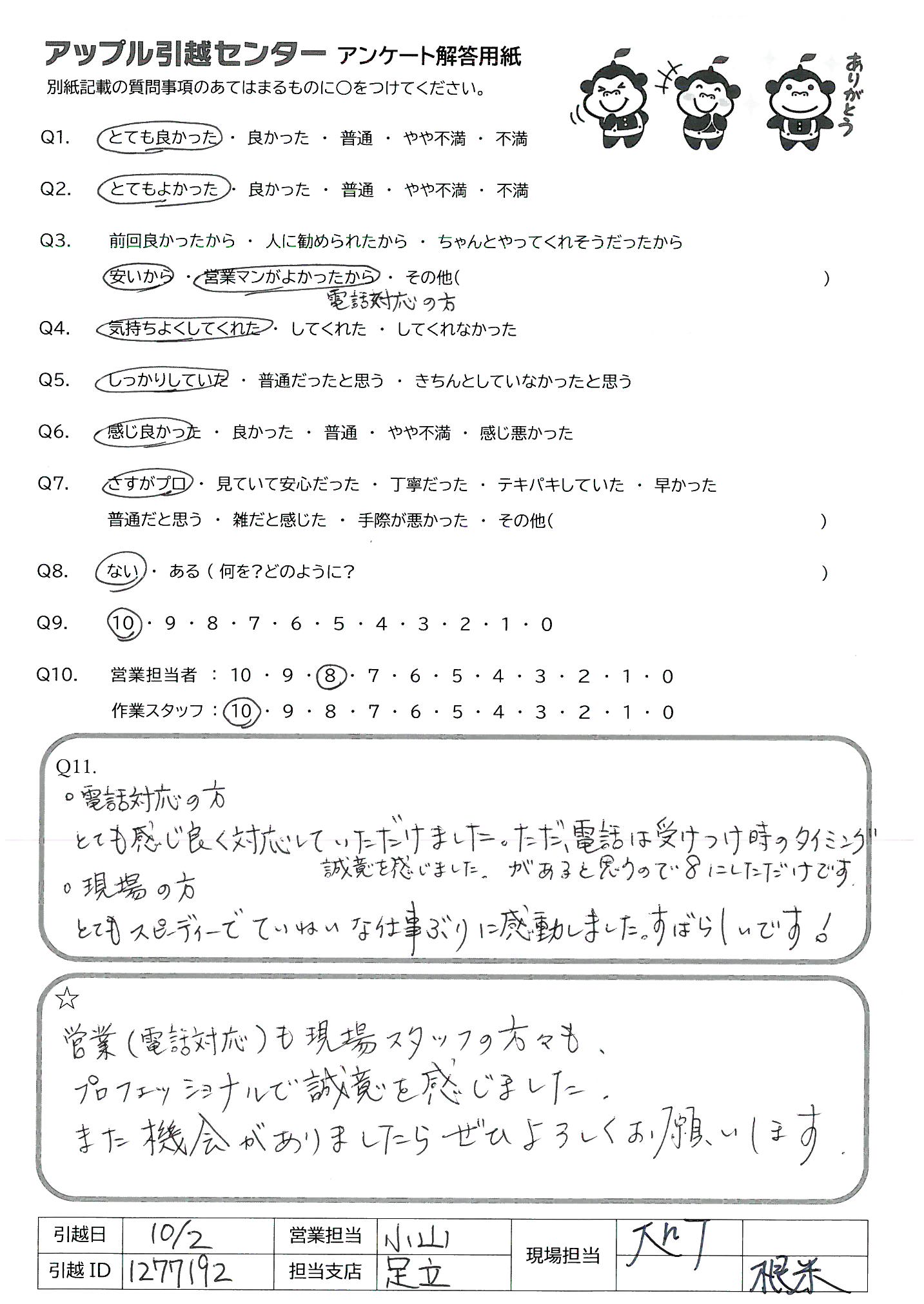A.お電話での応対は良くも悪くも普通の応対でしたが仲介業者様の紹介という事もあり、競合に合わせてお値引頂いたのがありがたかったです。 作業スタッフの方はさわやかで作業も早く、以前他の引越業者を利用した際は、スタッフ間のやり取りが威圧的でその場で教育されているのに違和感を覚えましたが、小山さんは的確な指示を丁寧にされていたのが印象的でした。冷蔵庫下のアクリルボードも元々不明かと思っていましたが、親身な提案だったのでありがたくお願いする事が出来ました。