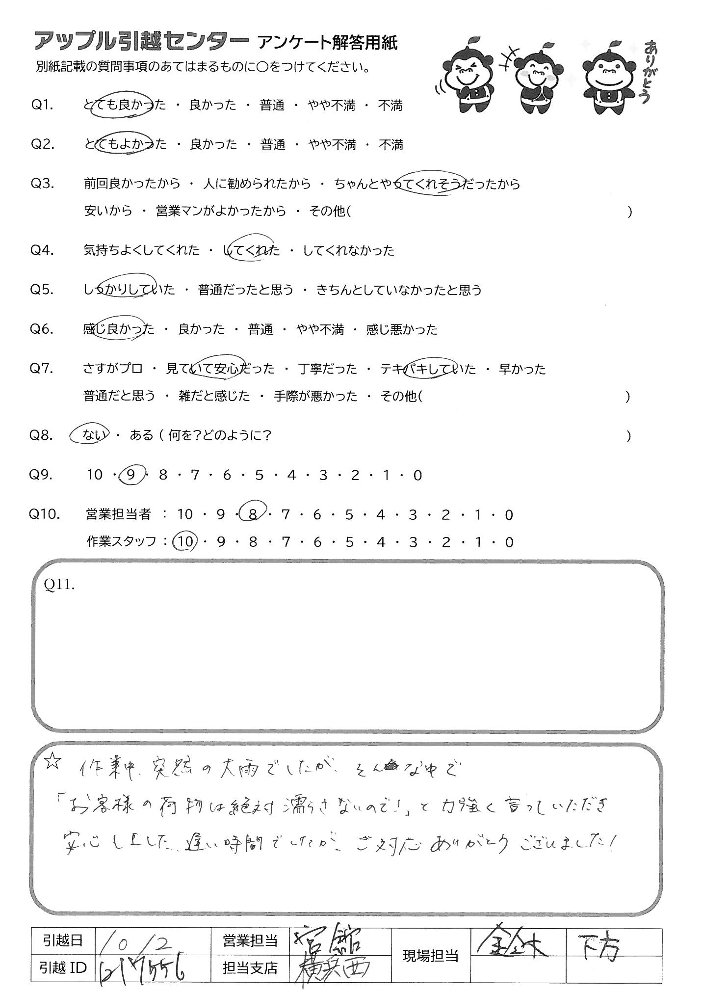 A.作業中、突然の大雨でしたが、そんな中で「お客様の荷物は絶対濡らさないので!」と力強く言っていただき安心しました。遅い時間でしたが、ご対応ありがとうございました!