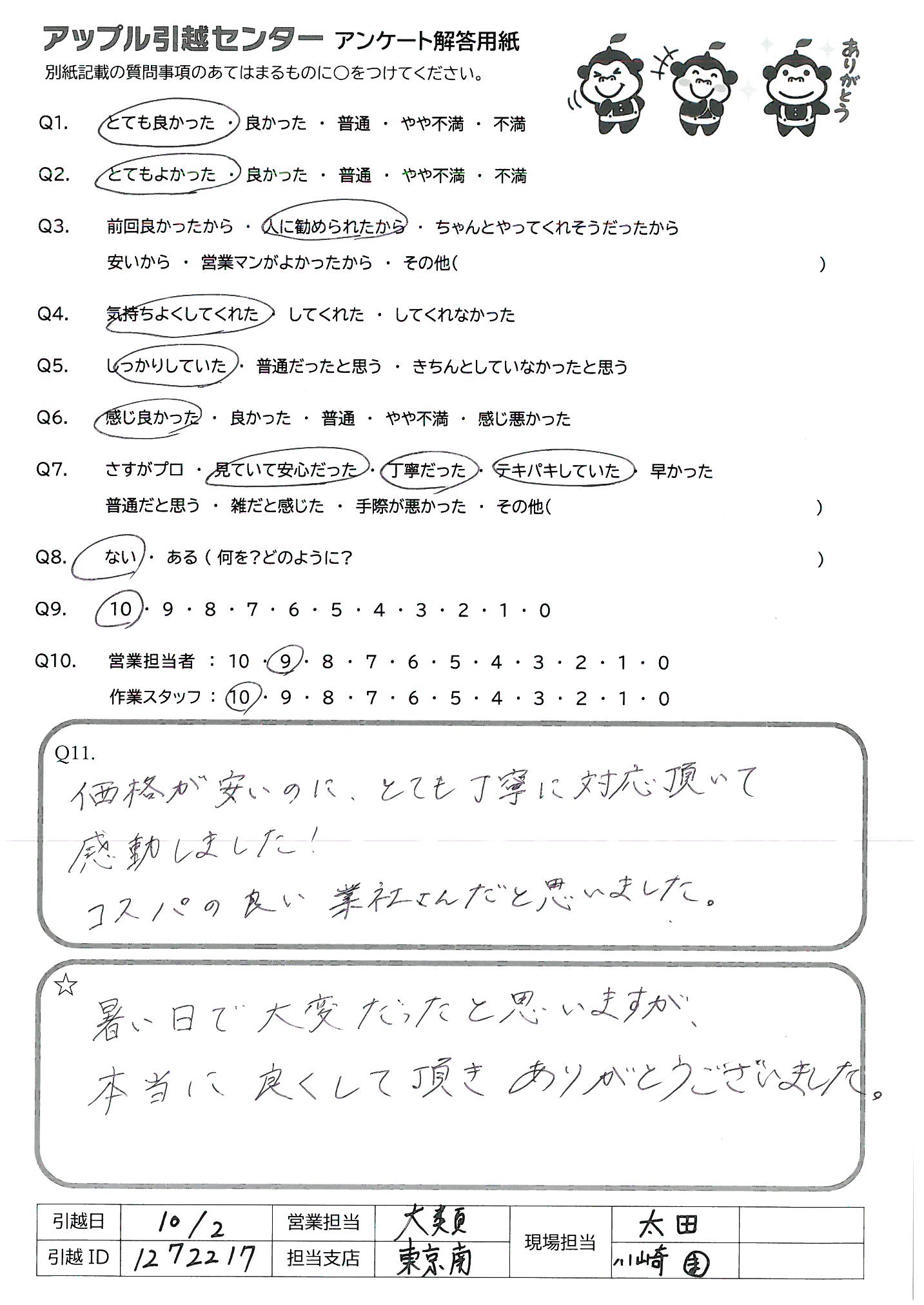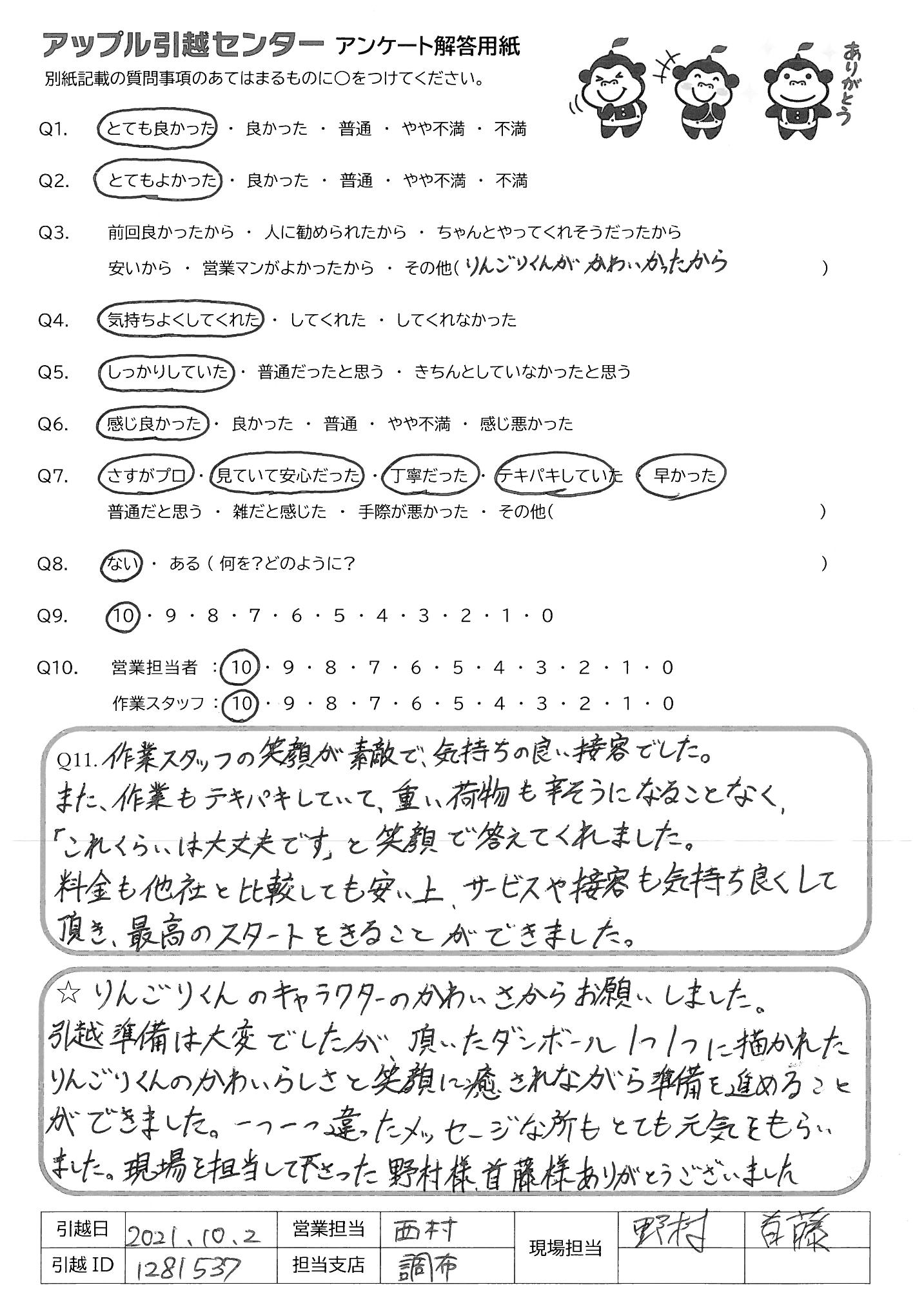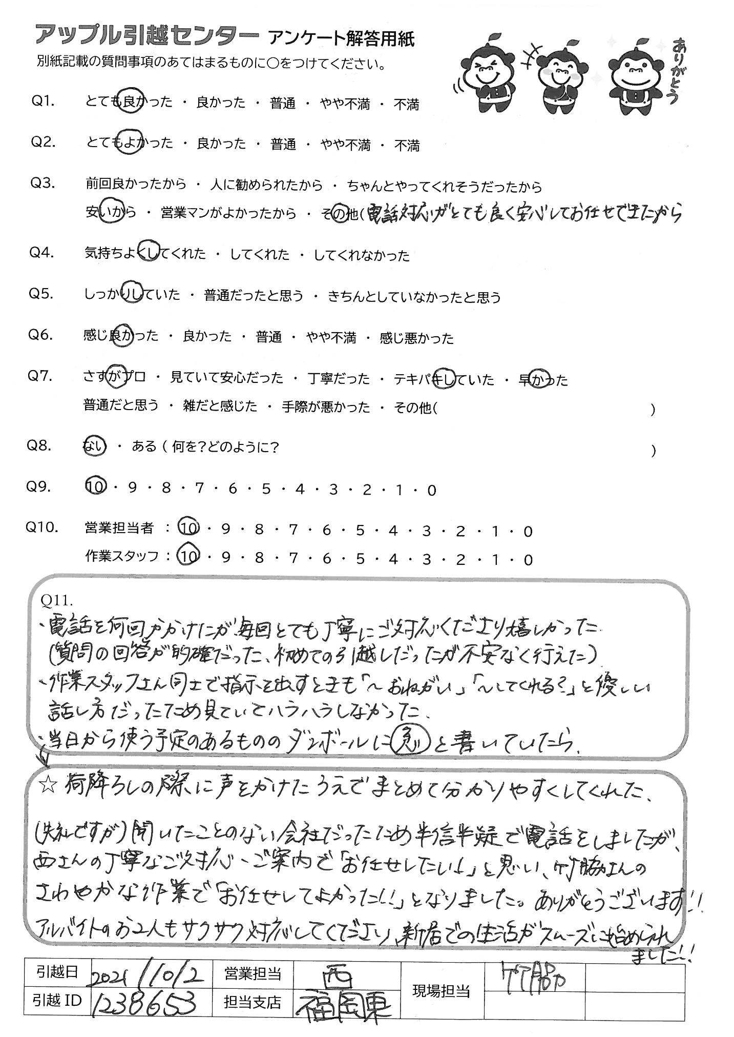 A.荷降ろしの際に声をかけたうえでまとめて分かりやすくしてくれた。 (失礼ですが)聞いたことのない会社だったため半信半疑で電話をしましたが、西さんの丁寧なご対応・ご案内で「お任せしたい!」と思い、竹脇さんのさわやかな作業で「お任せしてよかった!!」となりました。ありがとうございます! アルバイトのお2人もサクサク対応してくださり、新居での生活がスムーズに始められました!!