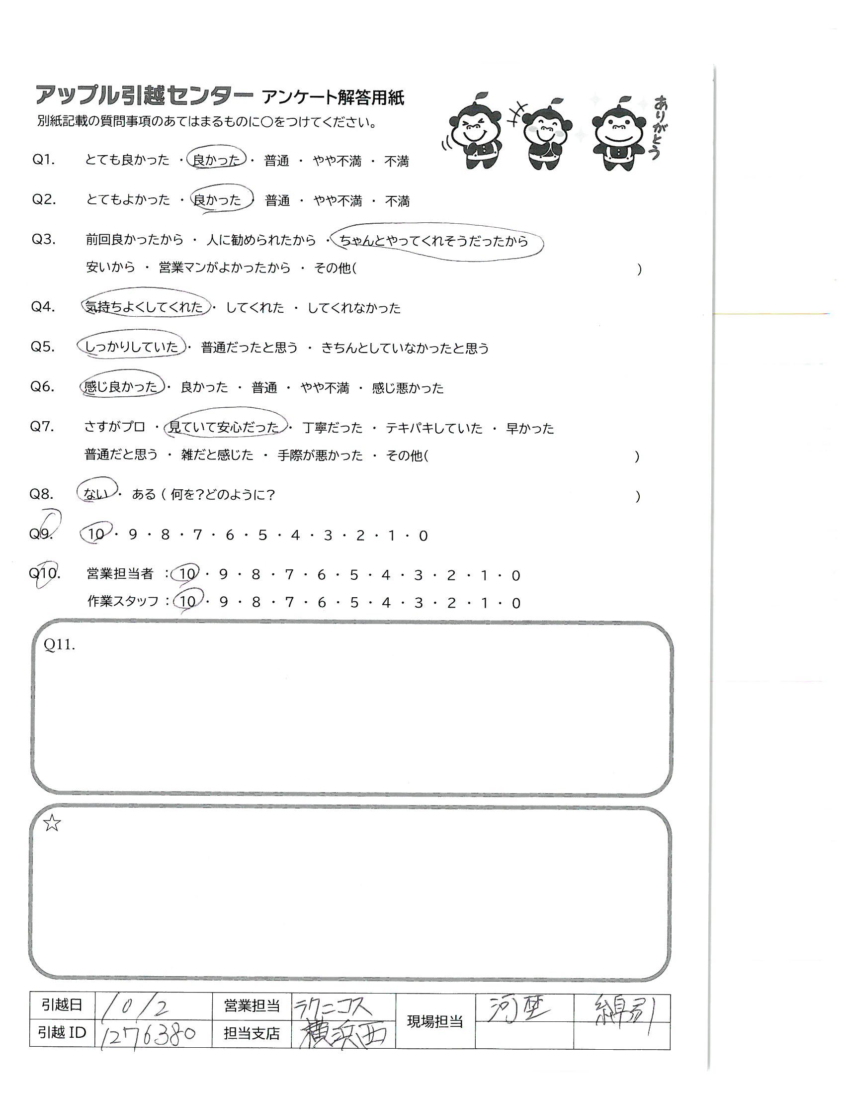 A.Q10 営業スタッフとは何をしてくれたか不明だが、メールやりとりの方だとしたら、事前の確認をもっとやっていただき、当日作業が相談より遅くなるなど作業区より一時荷物を残して終了と言われ大変こまりました。良くやってくれ、コストも安く