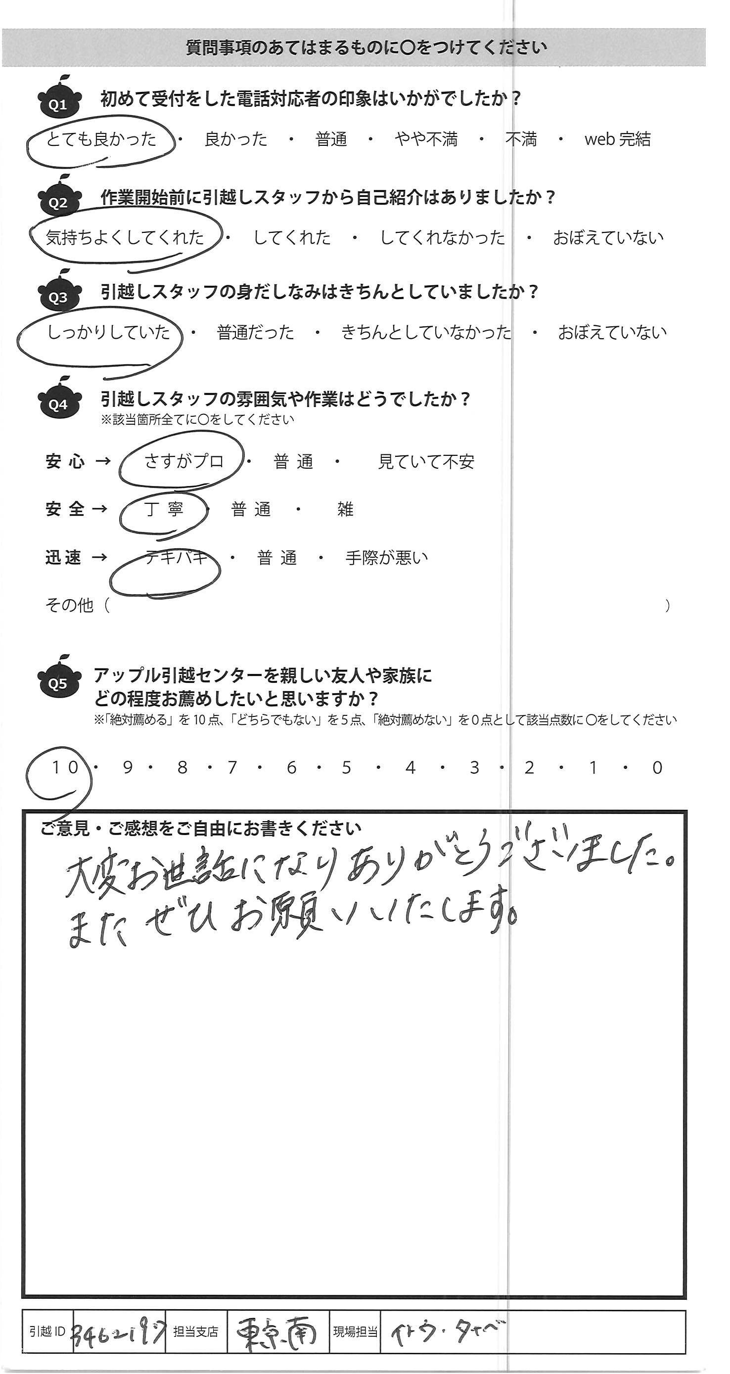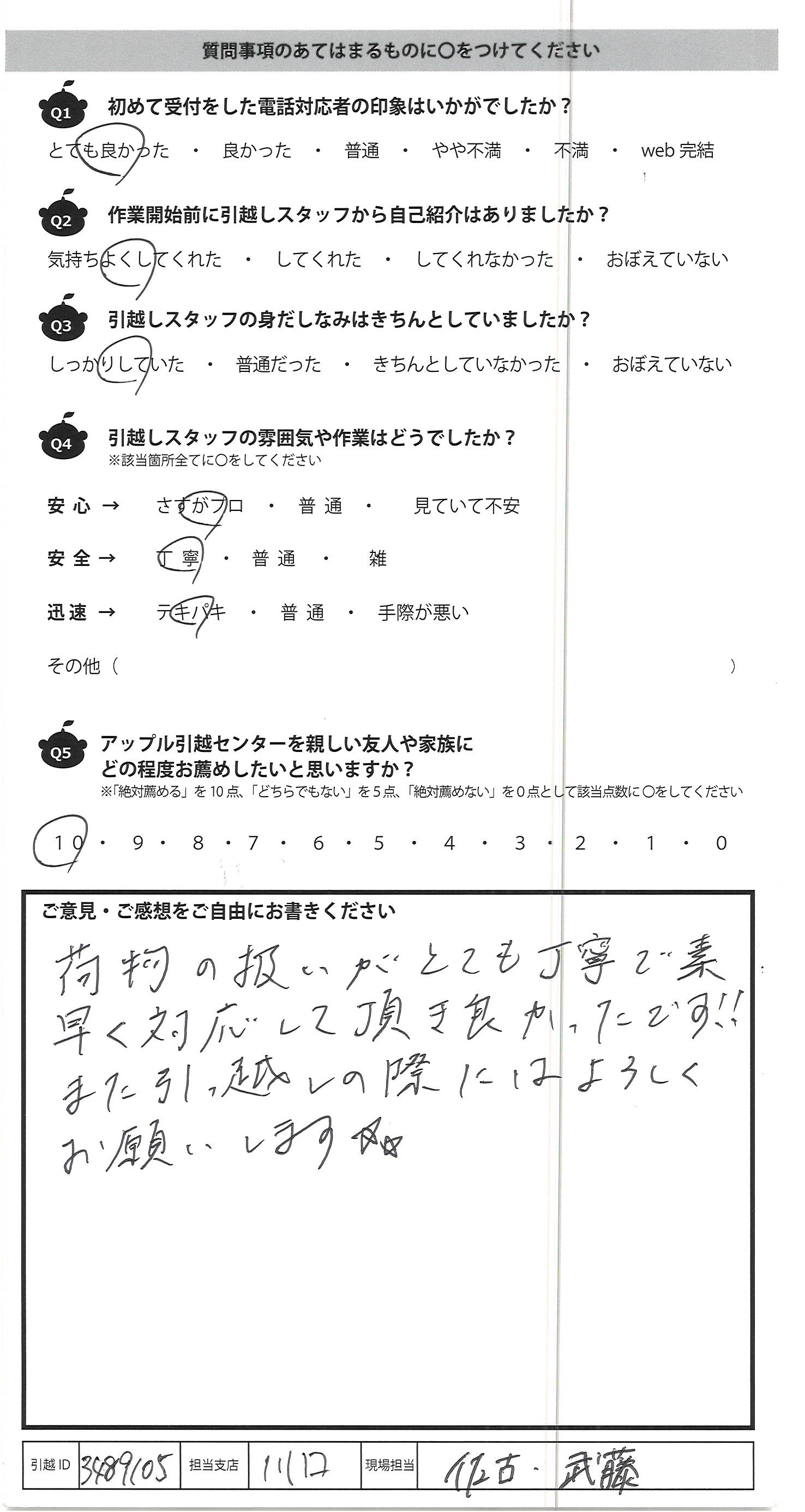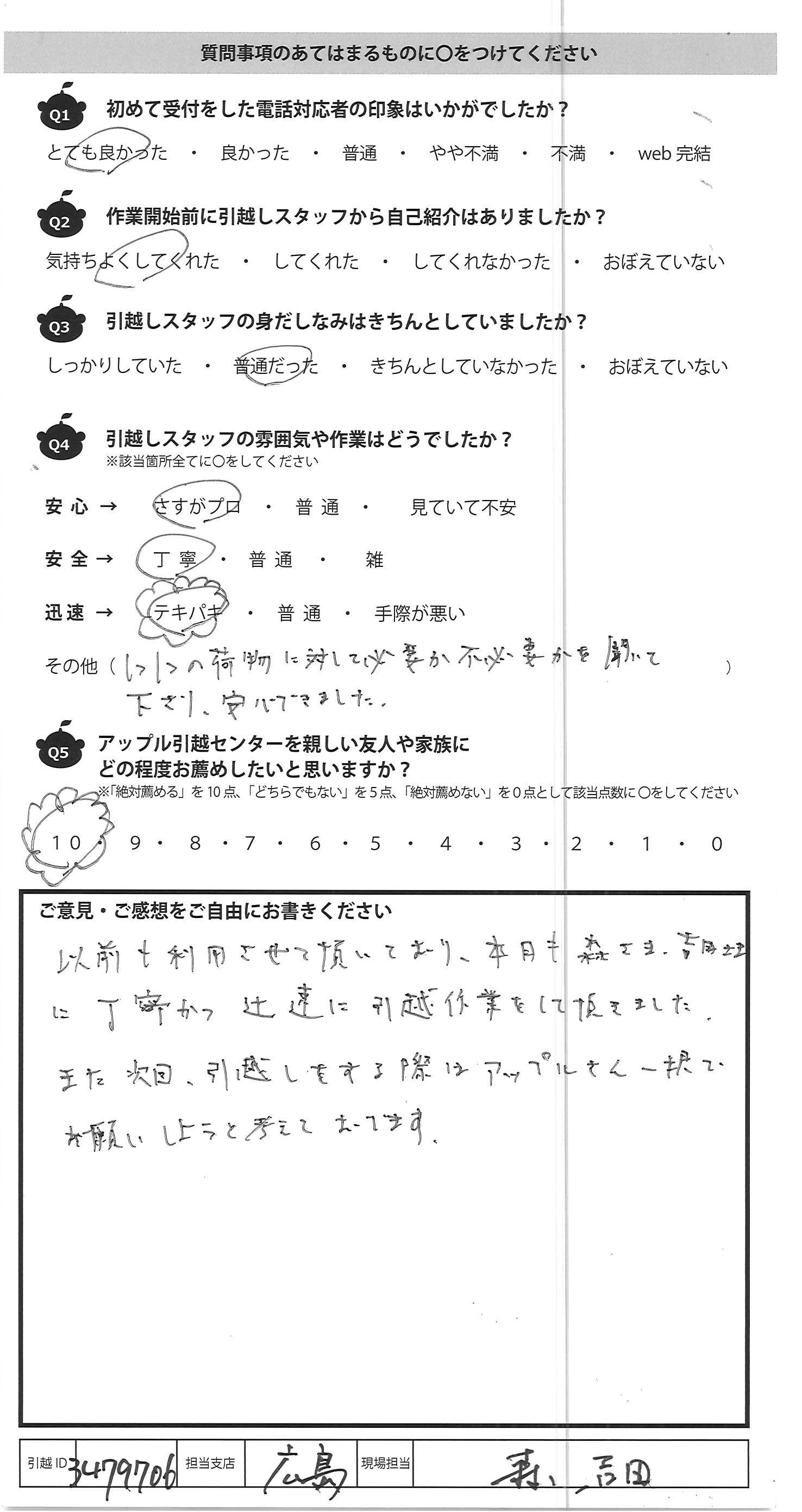 A.以前も利用させて頂いており、本日も森さま、吉田さま に丁寧かつ迅速に引越作業をして頂きました。 また次回、引越しもする際はアップルさん一択で お願いしようと考えております。