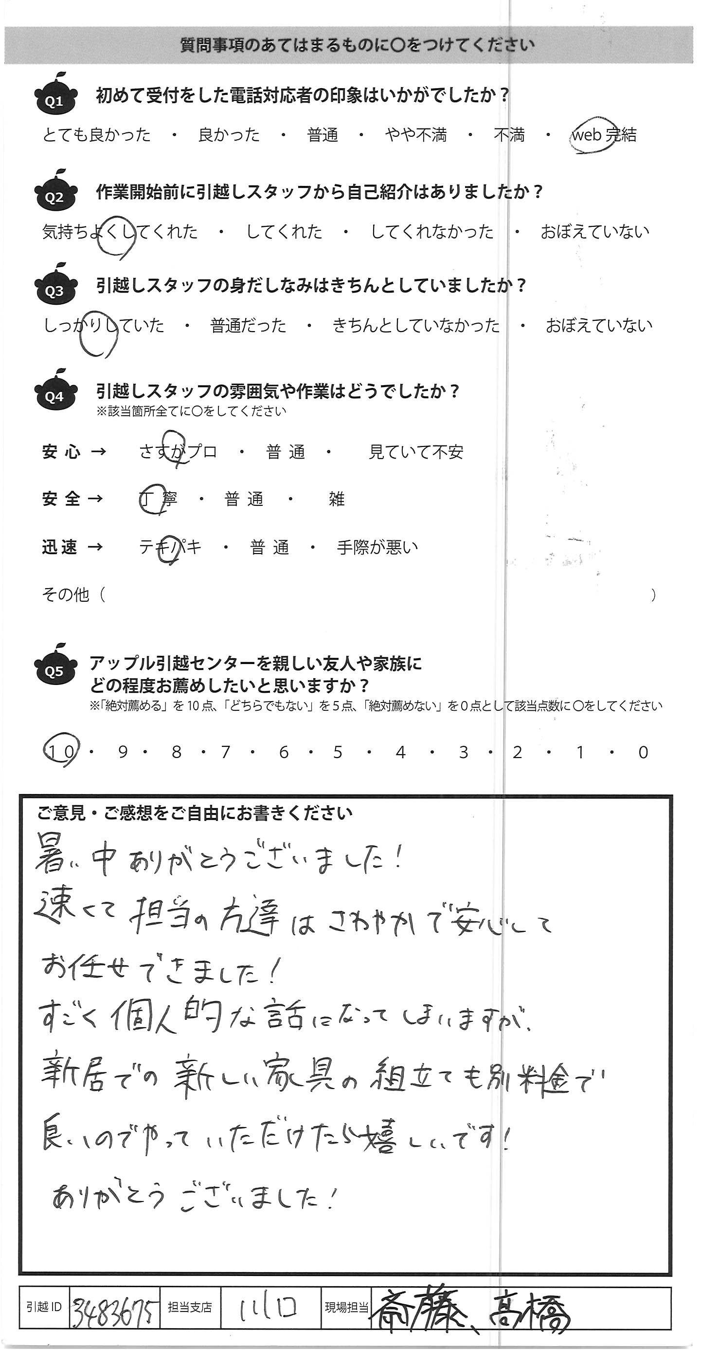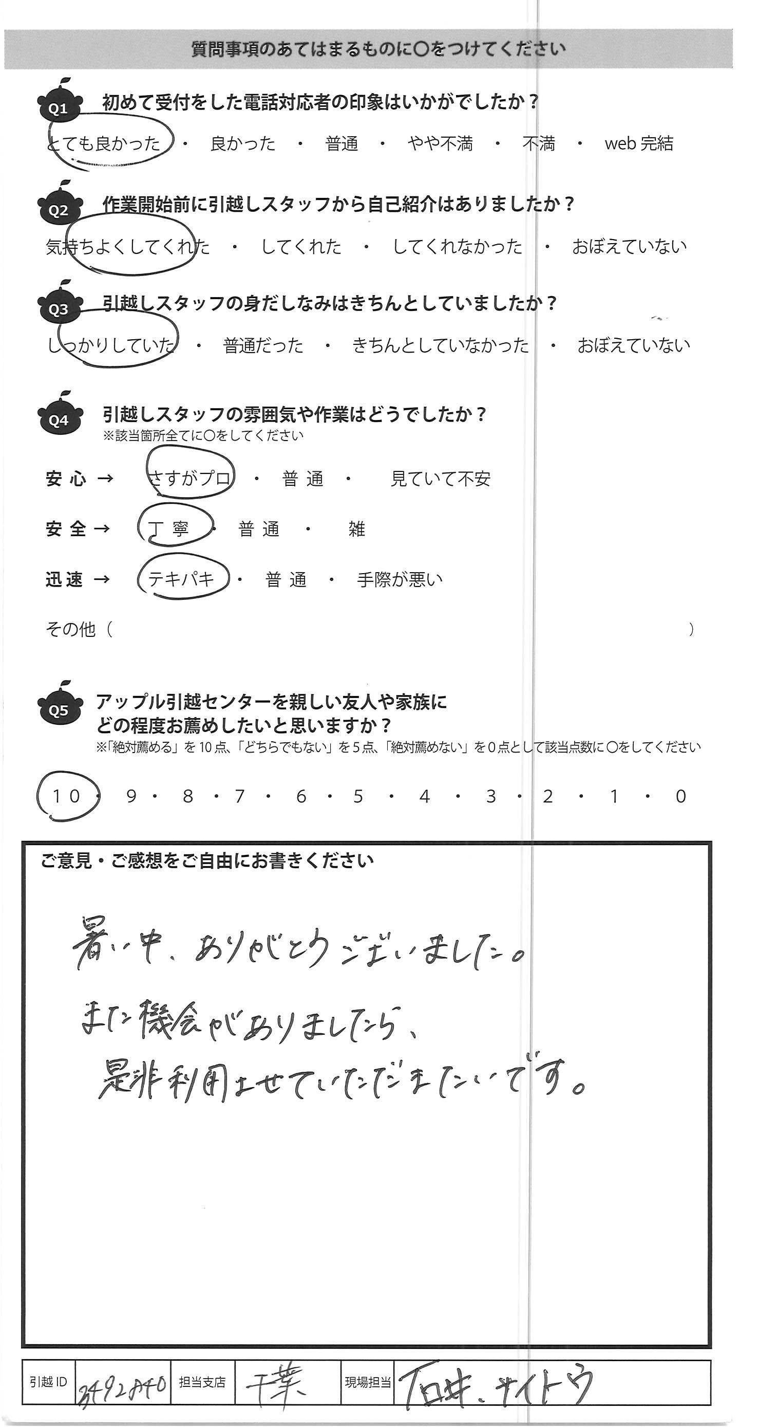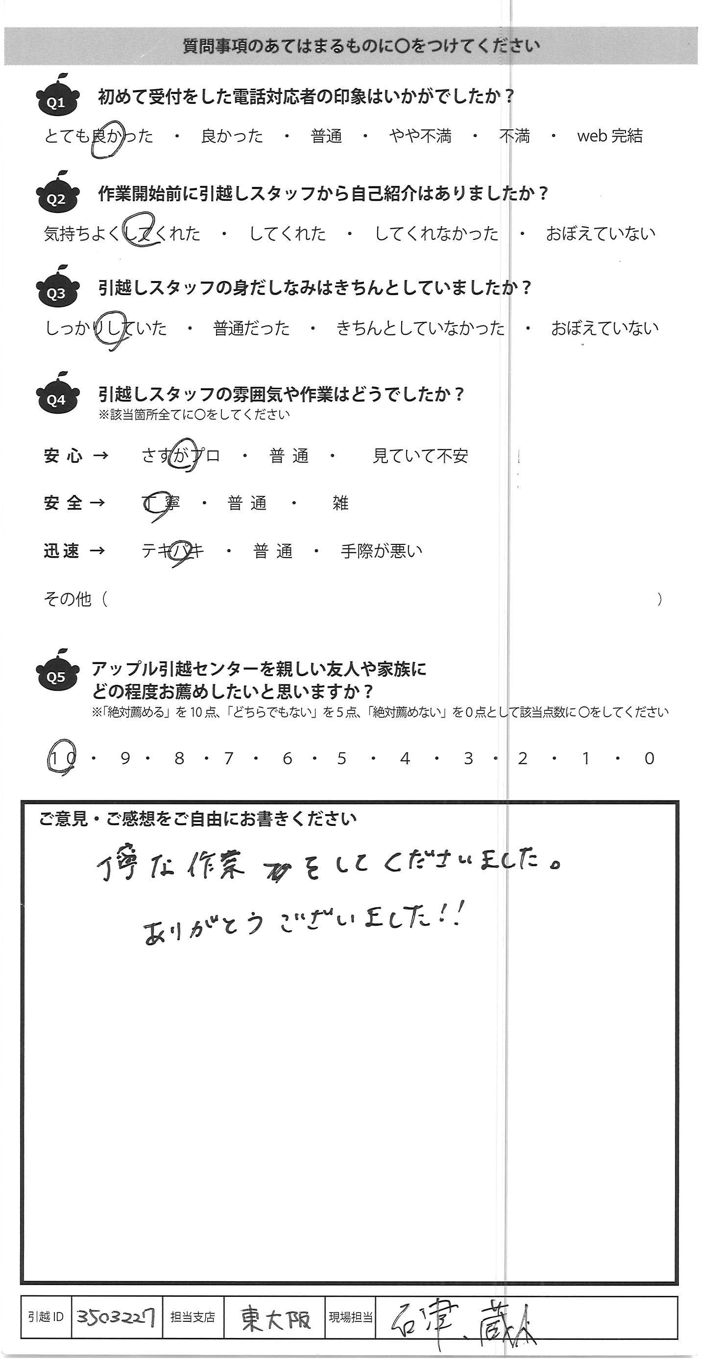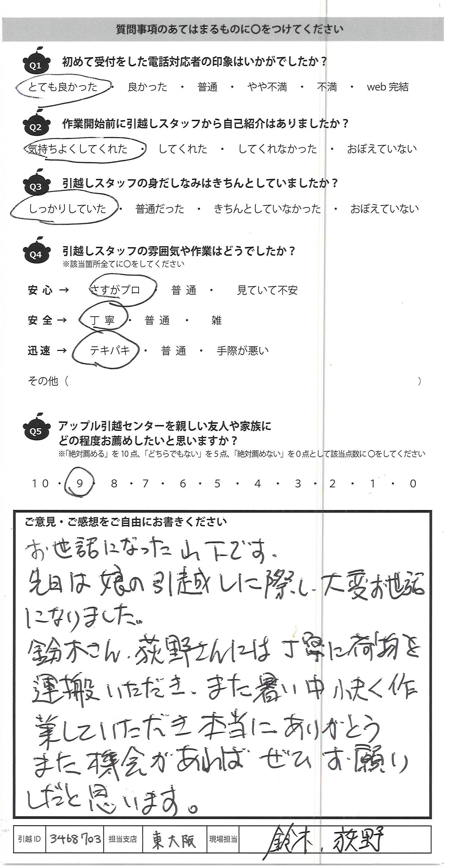 A.以前も利用させて頂いており、本日も森さま、吉田さま に丁寧かつ迅速に引越作業をして頂きました。 また次回、引越しもする際はアップルさん一択で お願いしようと考えております。