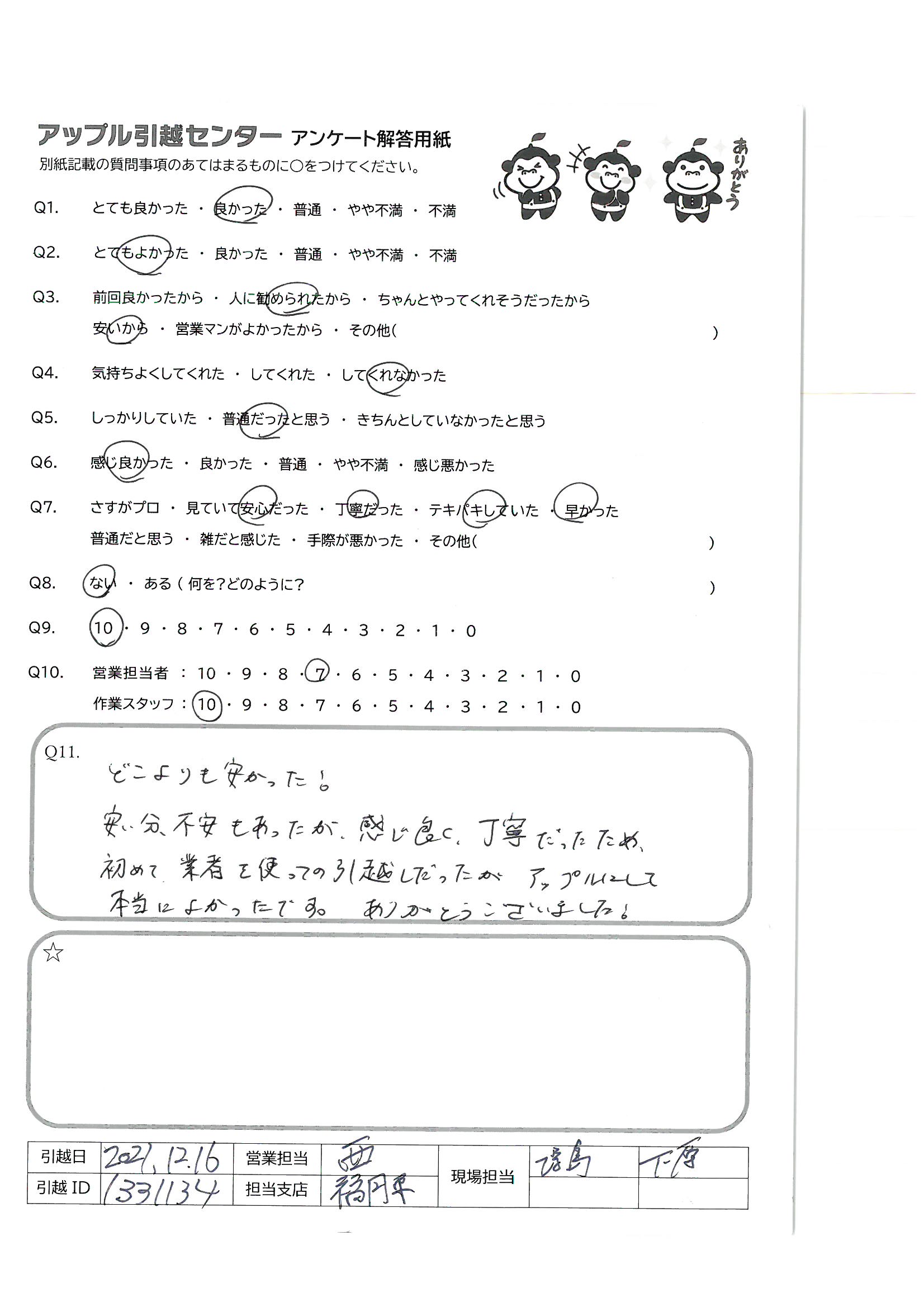 A.どこよりも安かった! 安い分、不安もあったが、感じ良く丁寧だったため、 初めて業者を使っての引越しだったが、アップルにして本当によかったです。ありがとうございました!