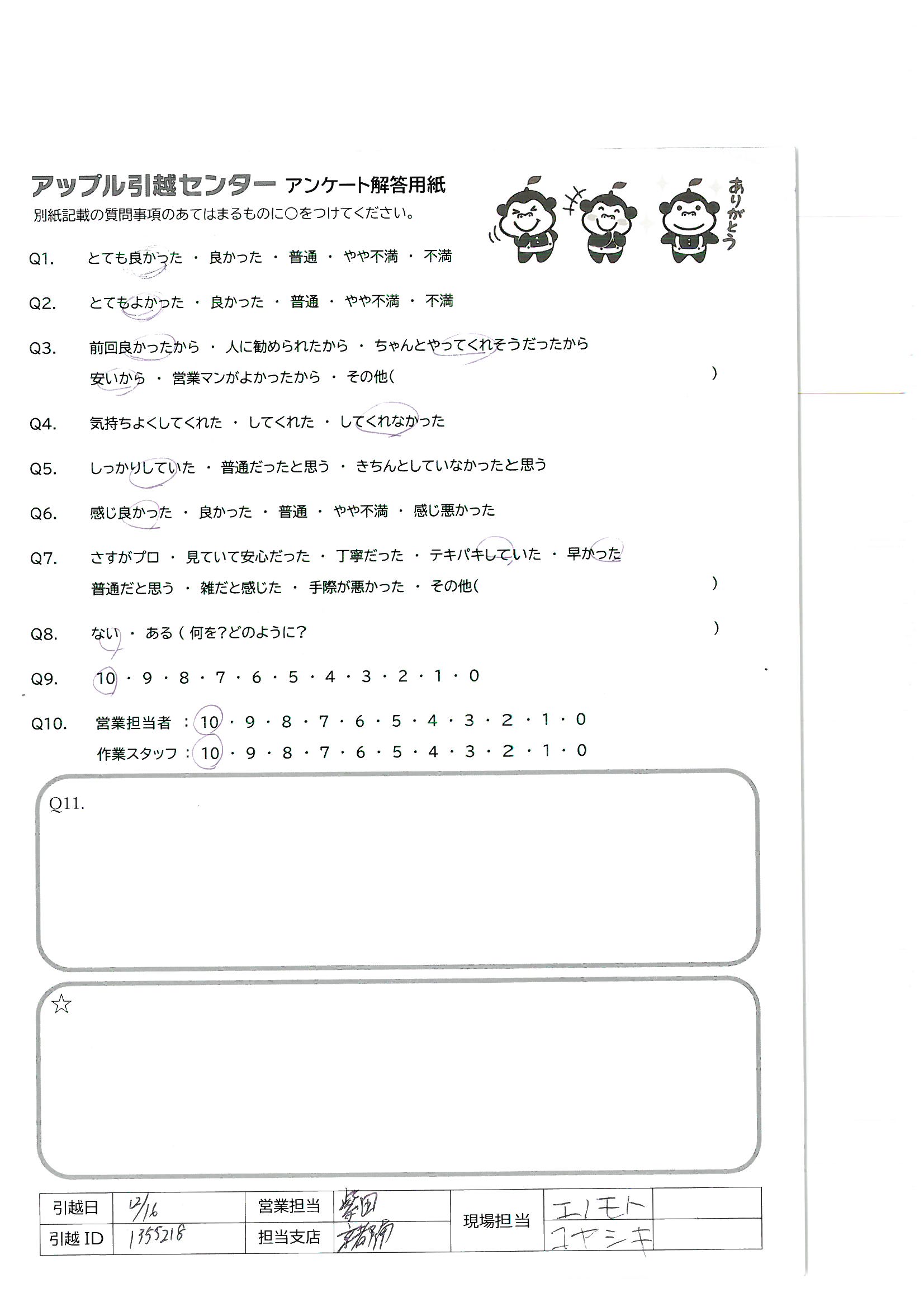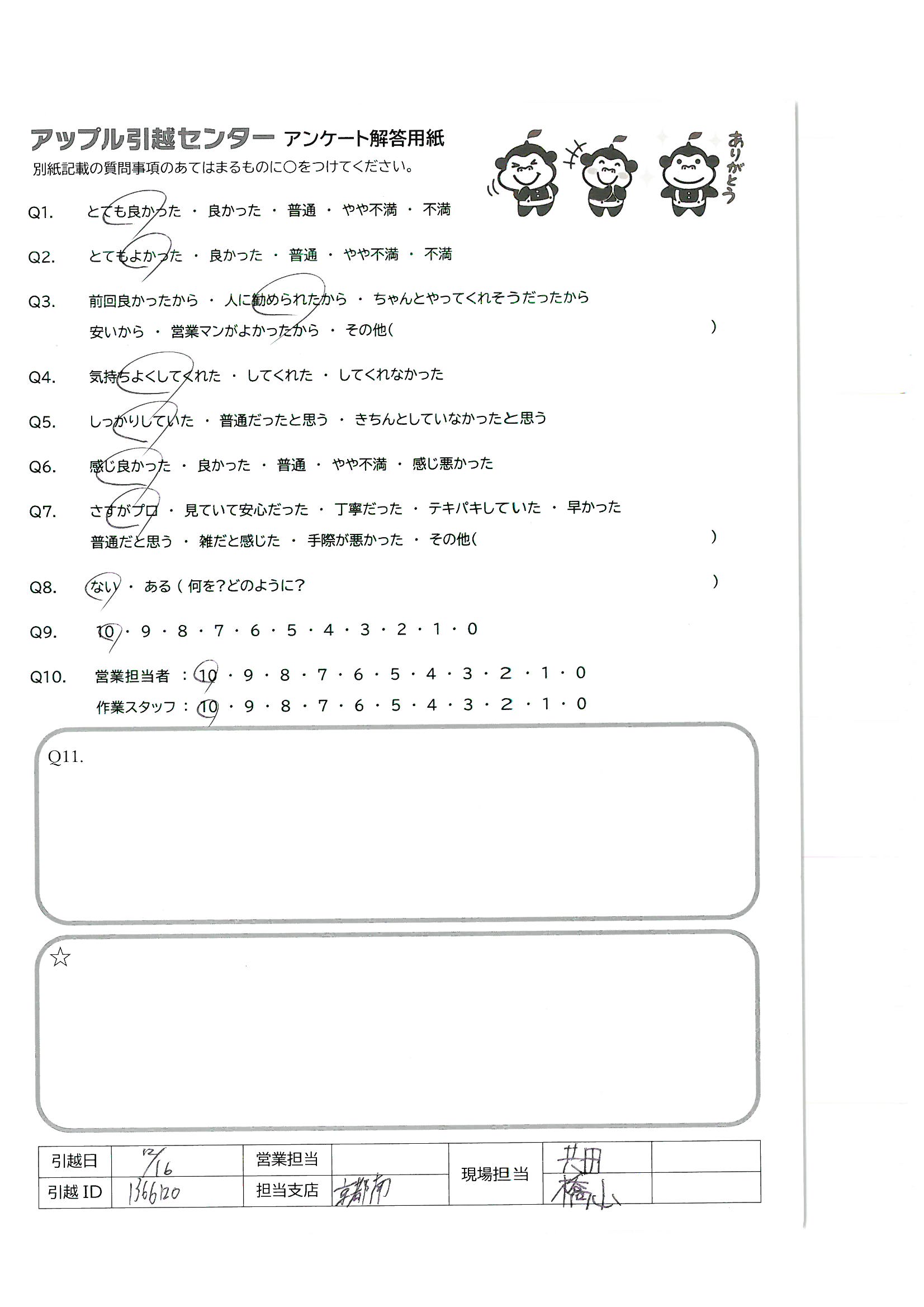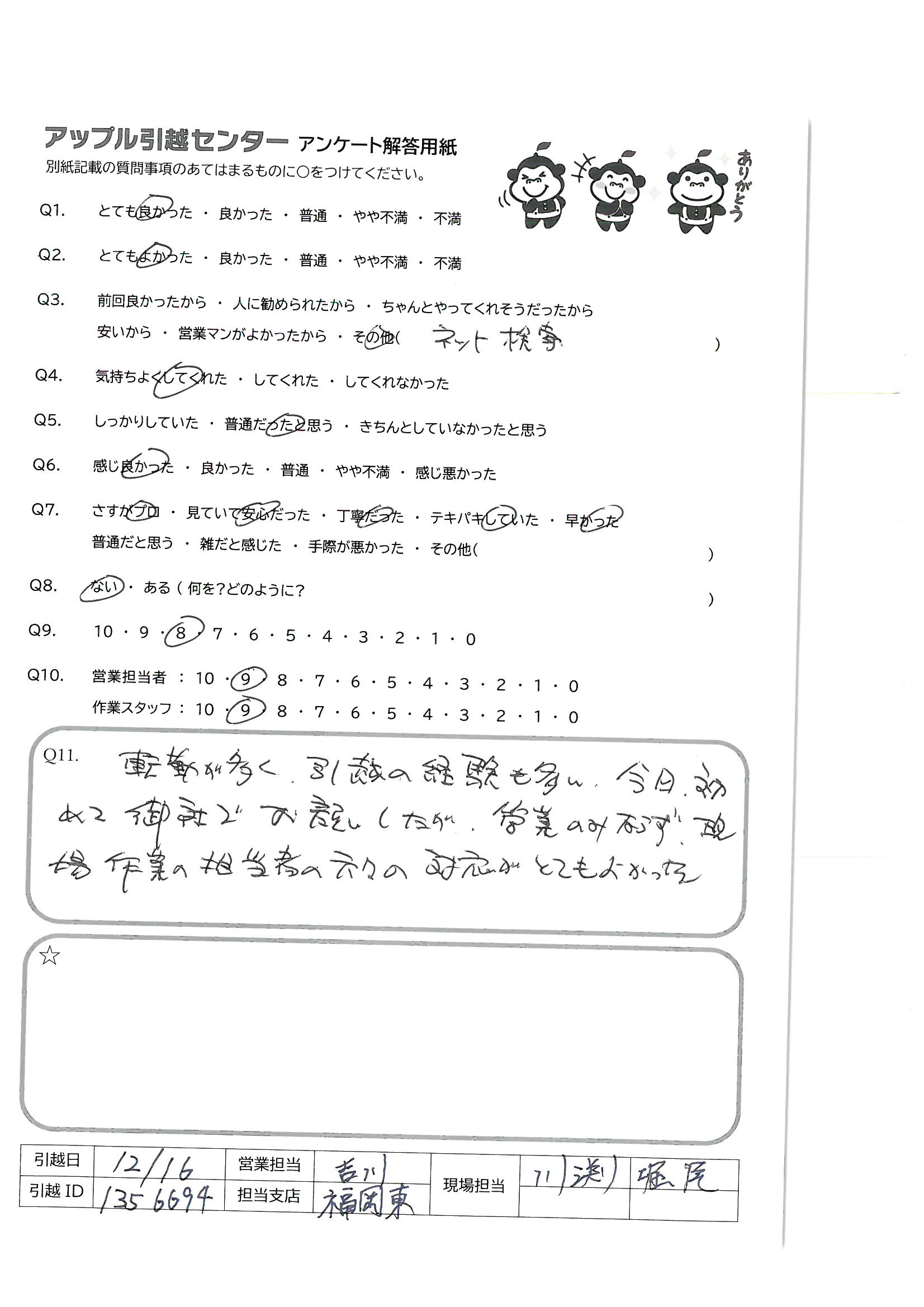 A.転勤が多く、引越の経験も多い、今日、初めて御社でお願いしたが、営業のみならず現場作業の担当者の方々の対応がとてもよかった