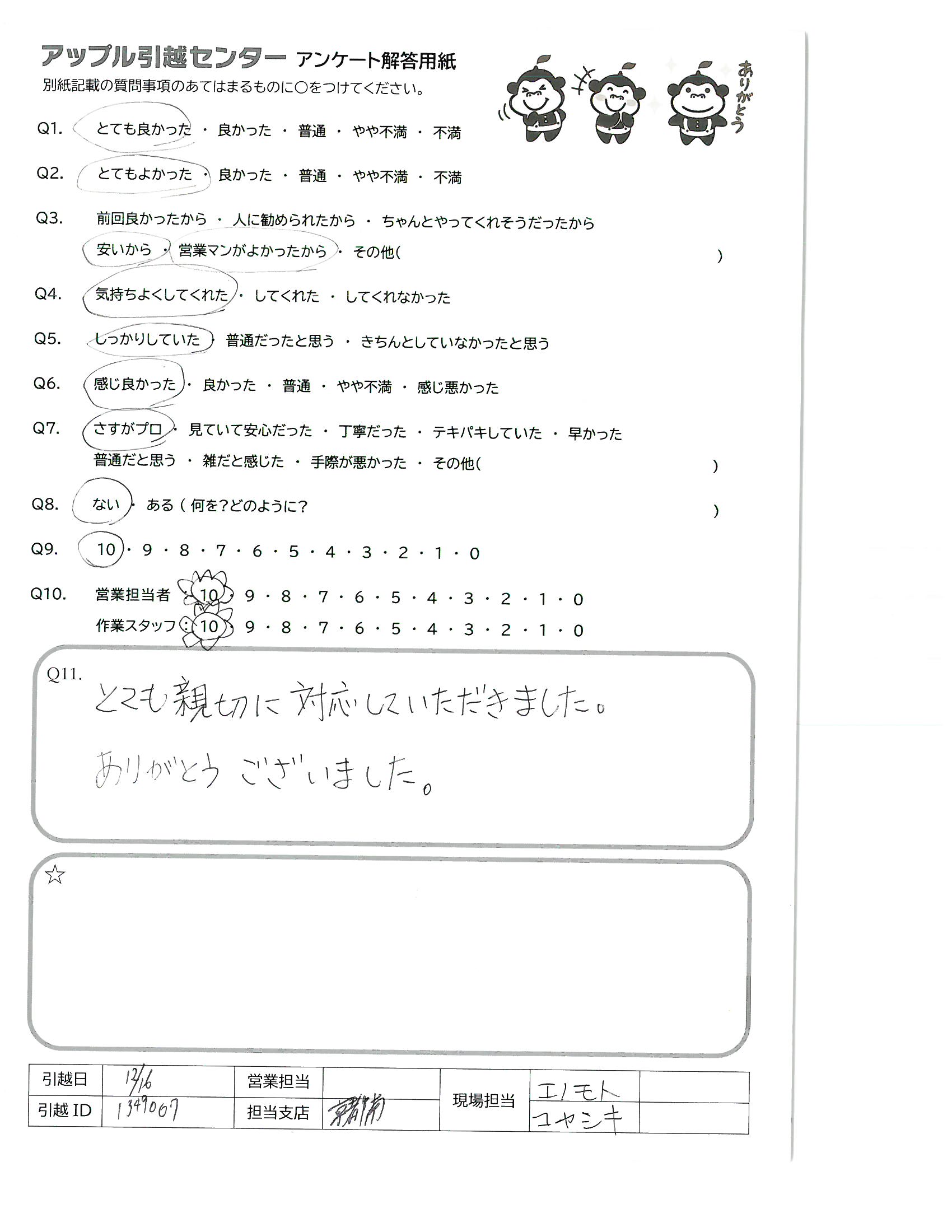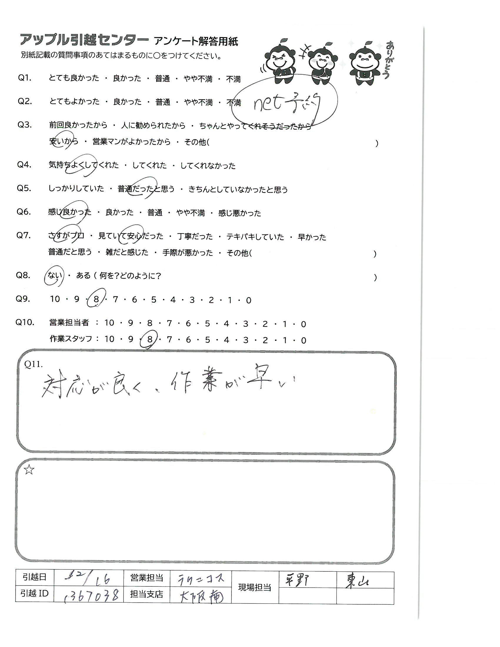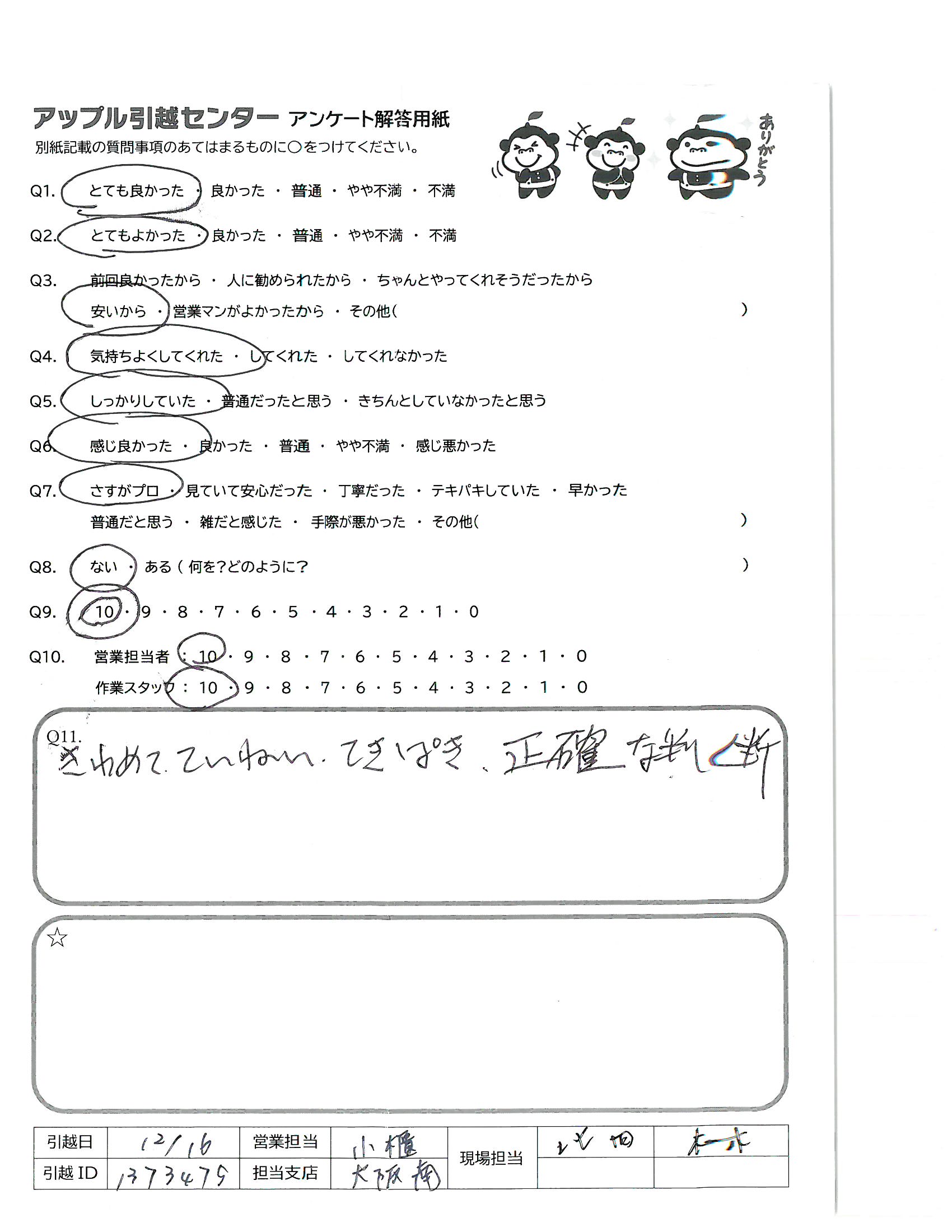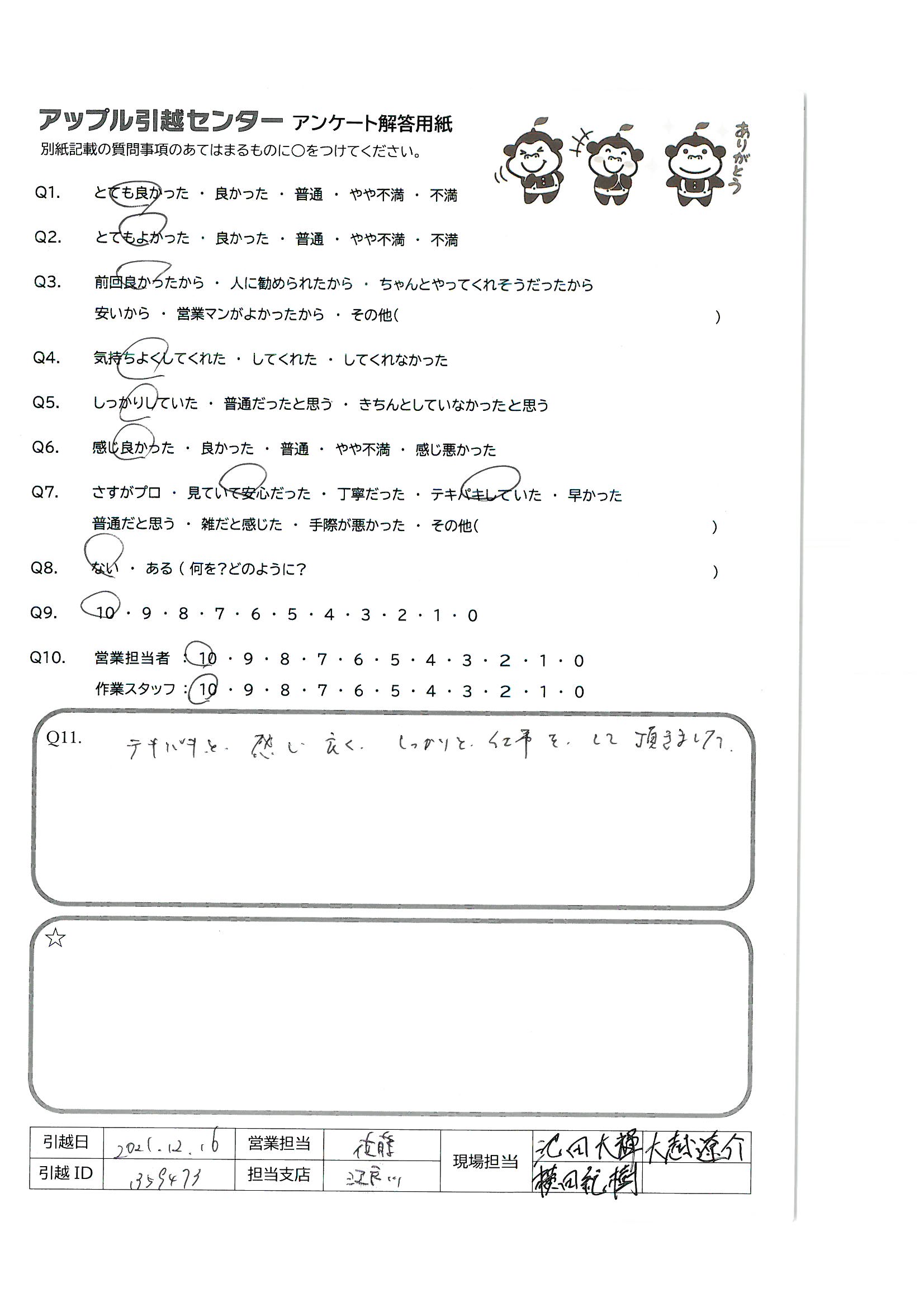 A.転勤が多く、引越の経験も多い、今日、初めて御社でお願いしたが、営業のみならず現場作業の担当者の方々の対応がとてもよかった