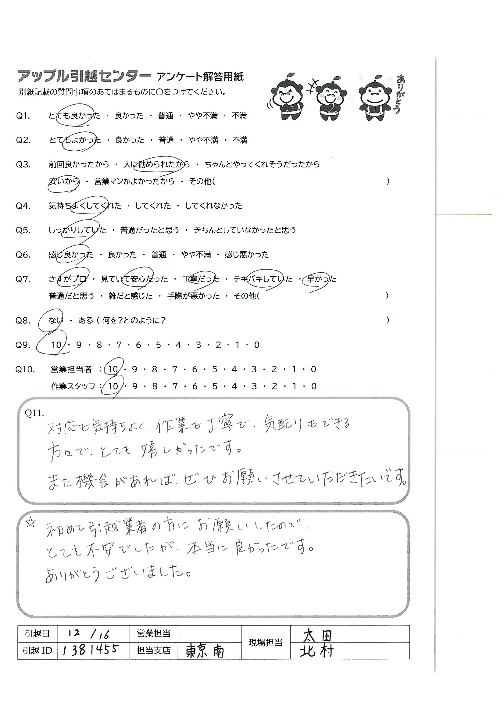 A.初めて引越業者の方にお願いしたので、 とても不安でしたが、本当に良かったです。ありがとうございました。