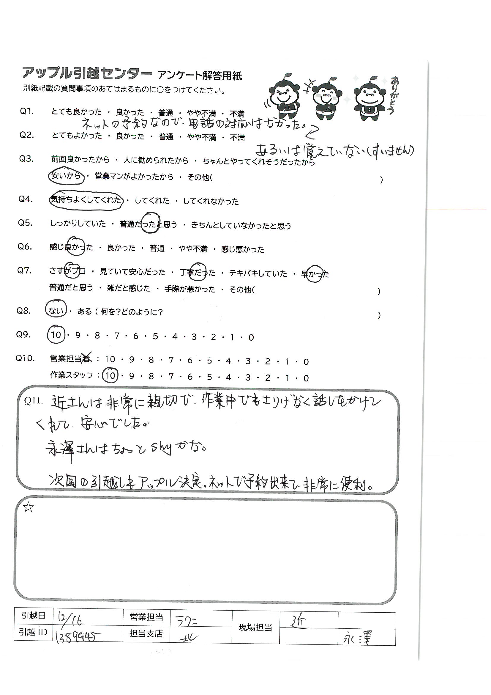 A.近さんは非常に親切で、作業中でもさりげなく話しをかけて くれて、安心でしhた。 永澤さんはちょっとshyかな。 次回の引越しもアップル決定。ネットで予約出来て、非常に便利。