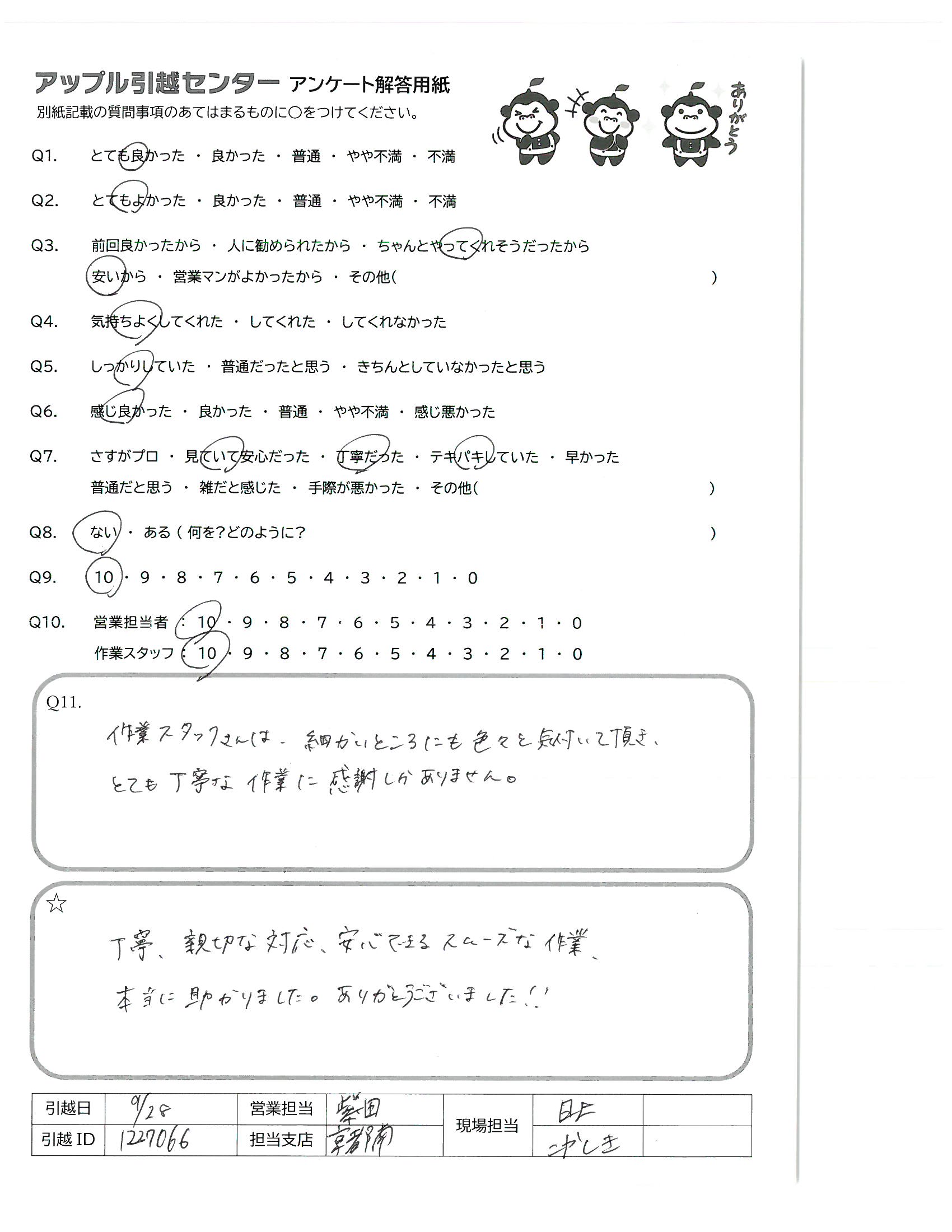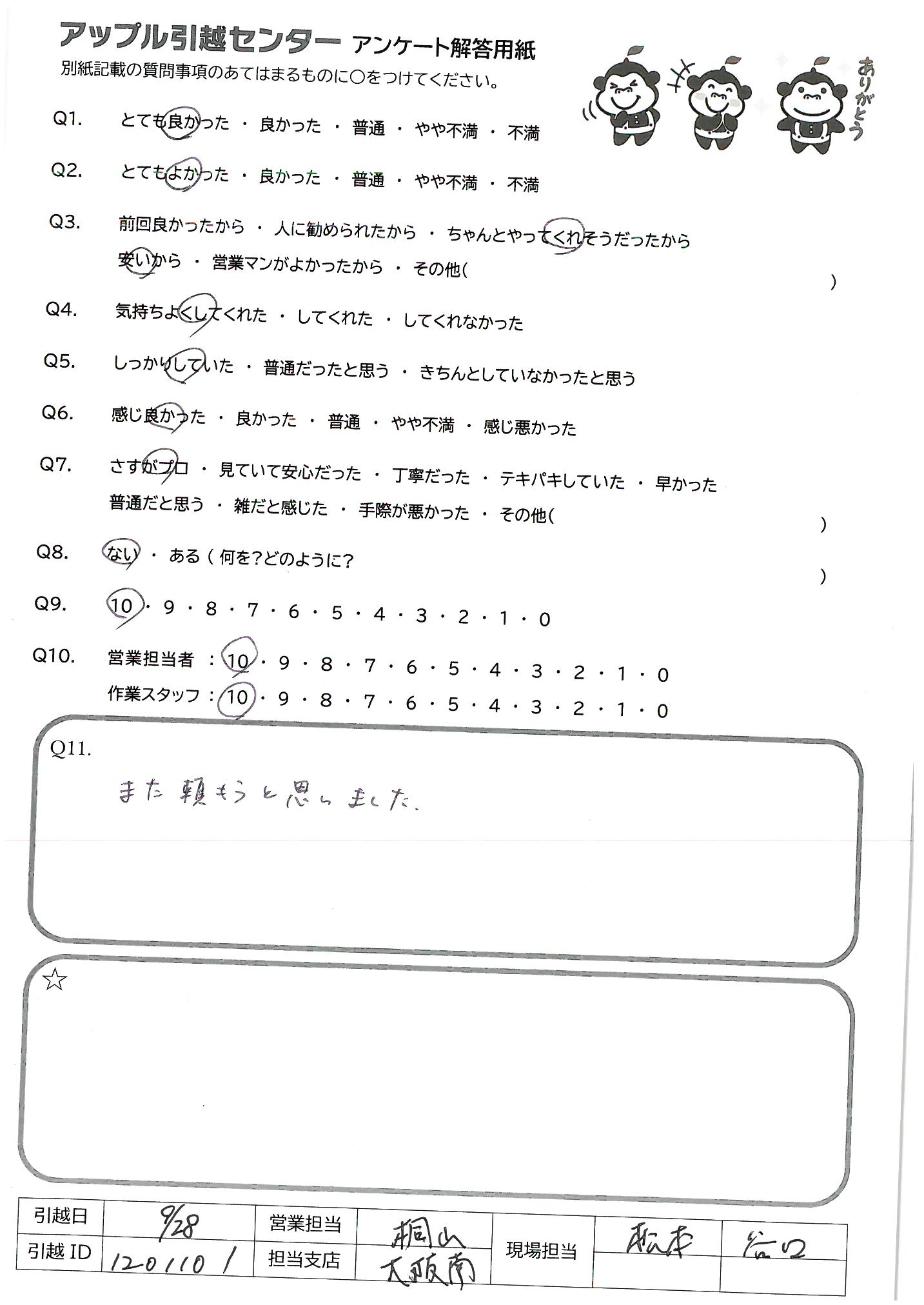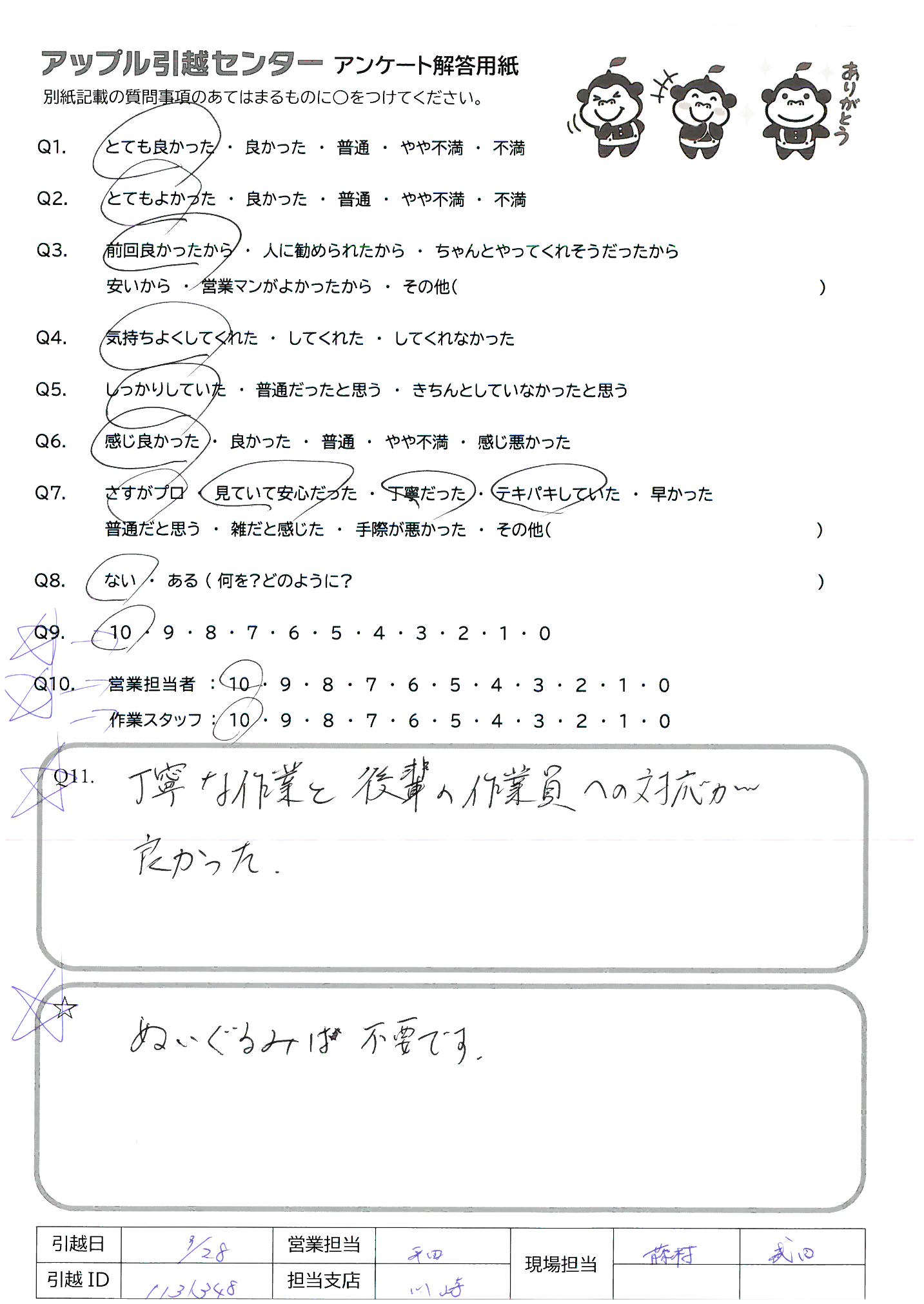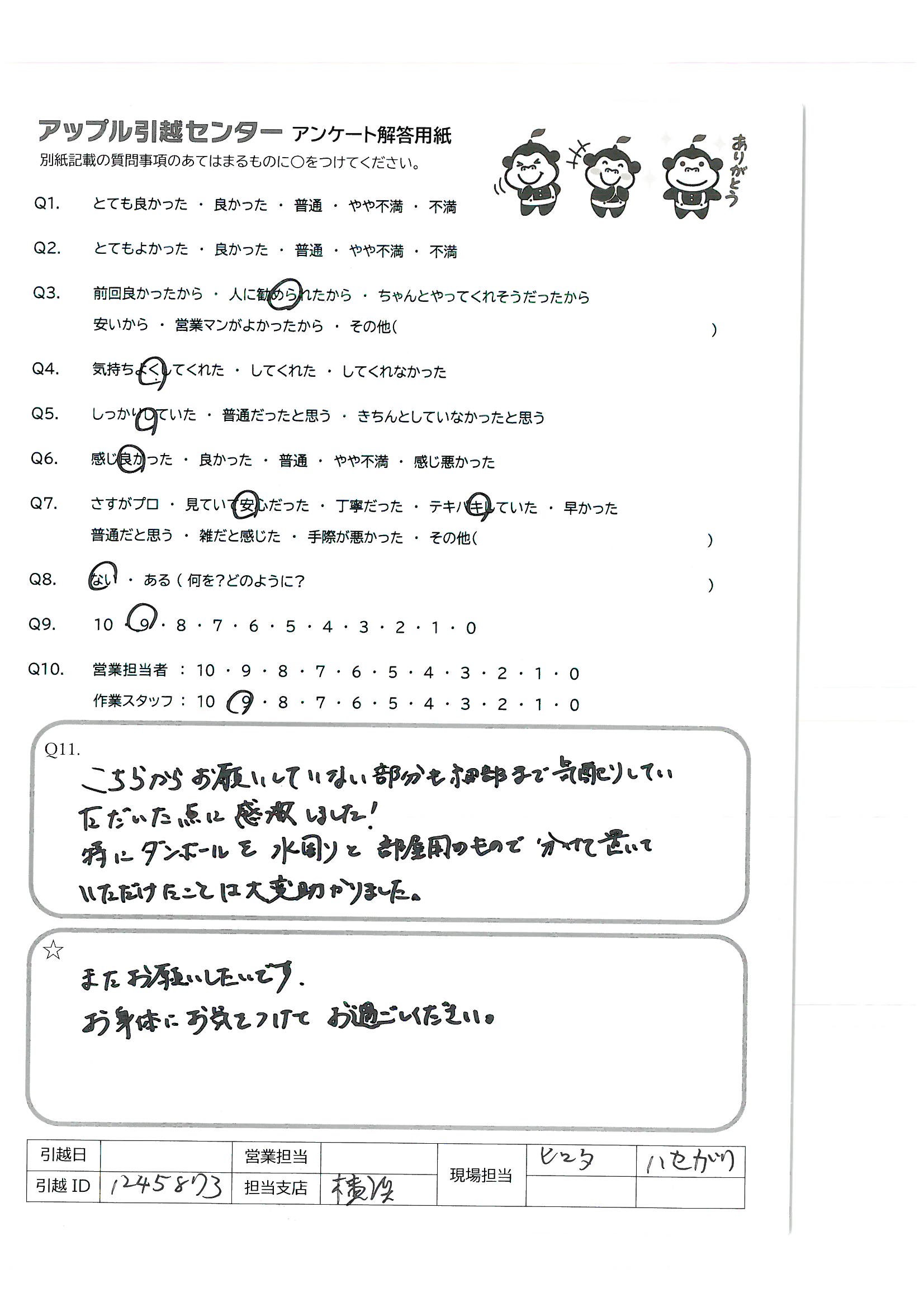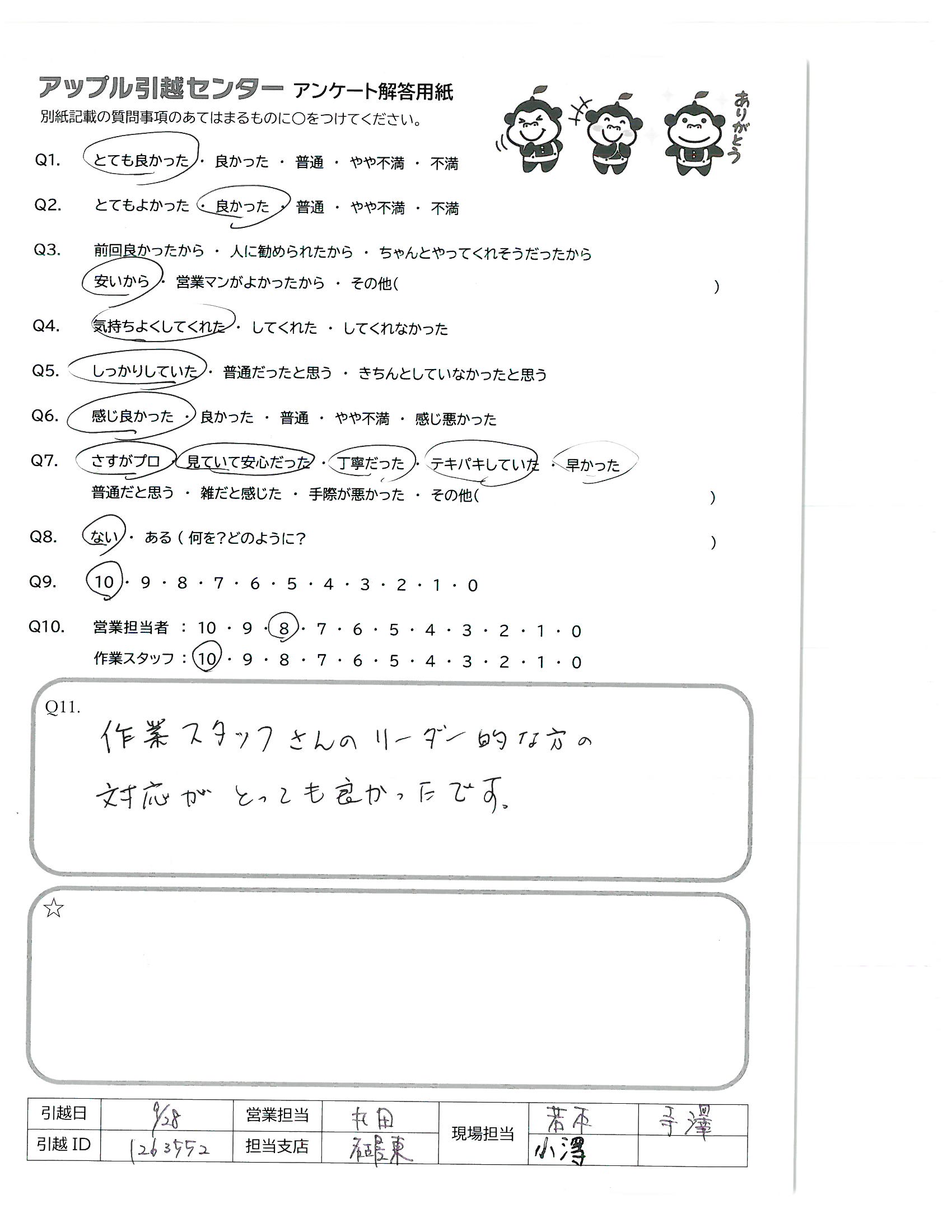 A.アップルさんには過去何度かお世話になってます。お値段は良心的なのに、とても丁寧でスタッフさん皆さん感じが良く、安心してお願いできます。次の引越しの時も宜しくお願い致します。