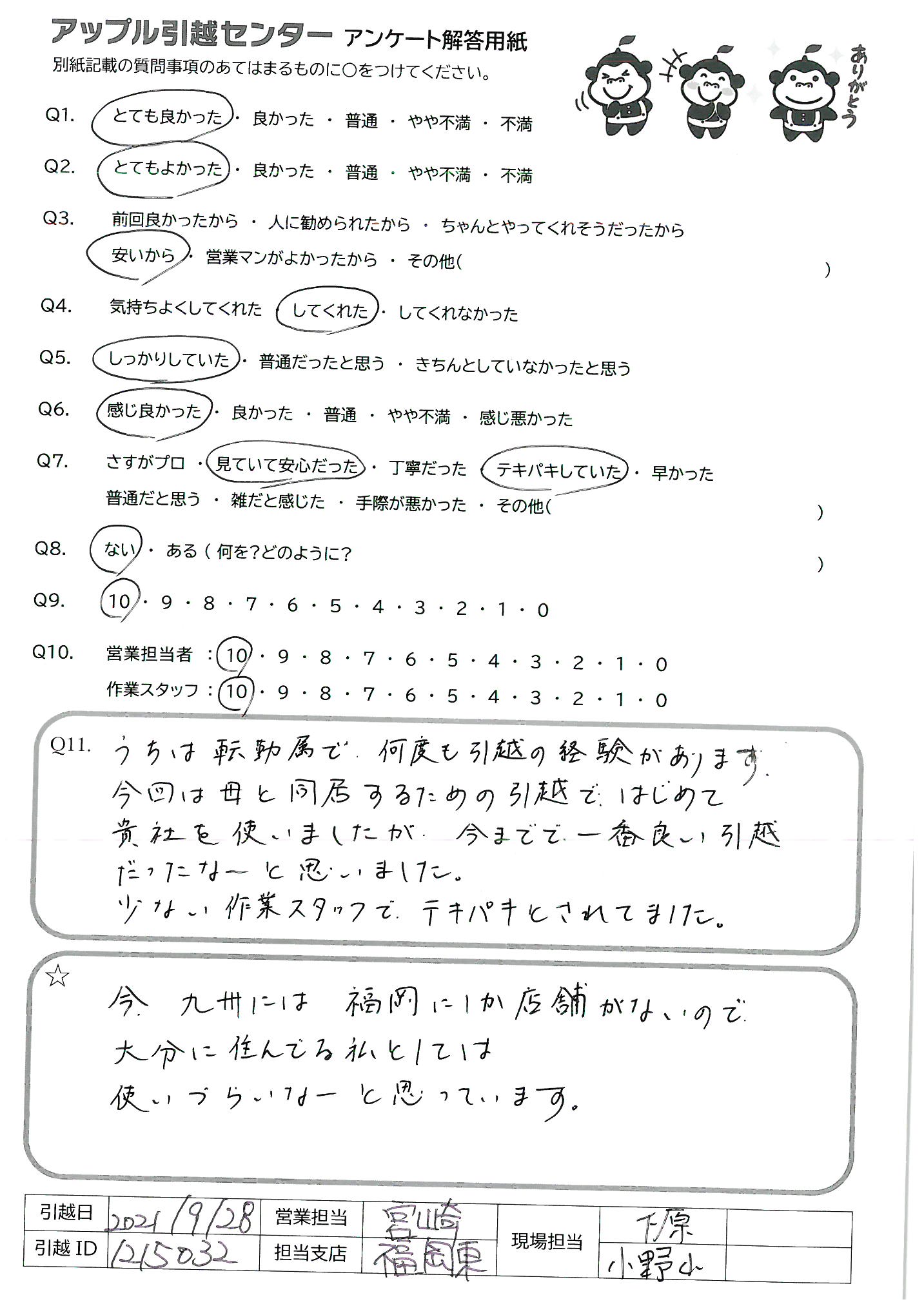 引越し日:2021年09月28日 エリア:大分県大分市