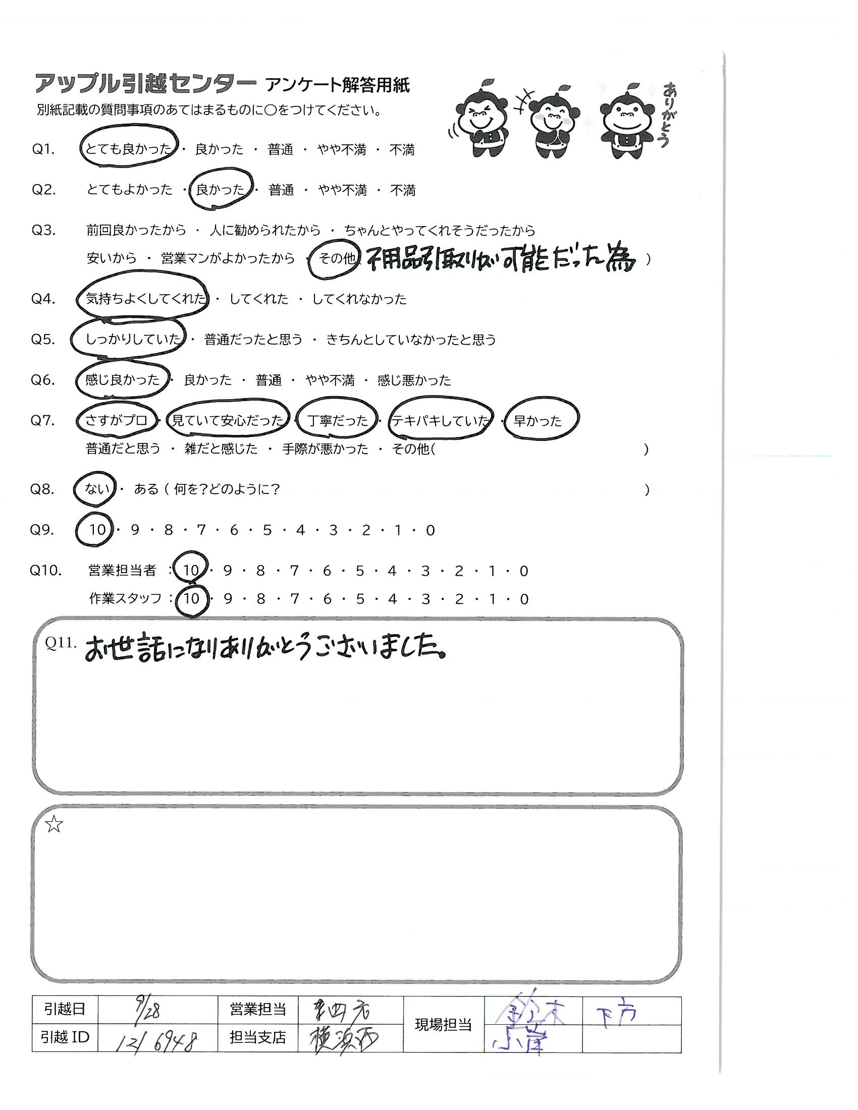 引越し日:2021年09月28日 エリア:神奈川県横浜市港北区