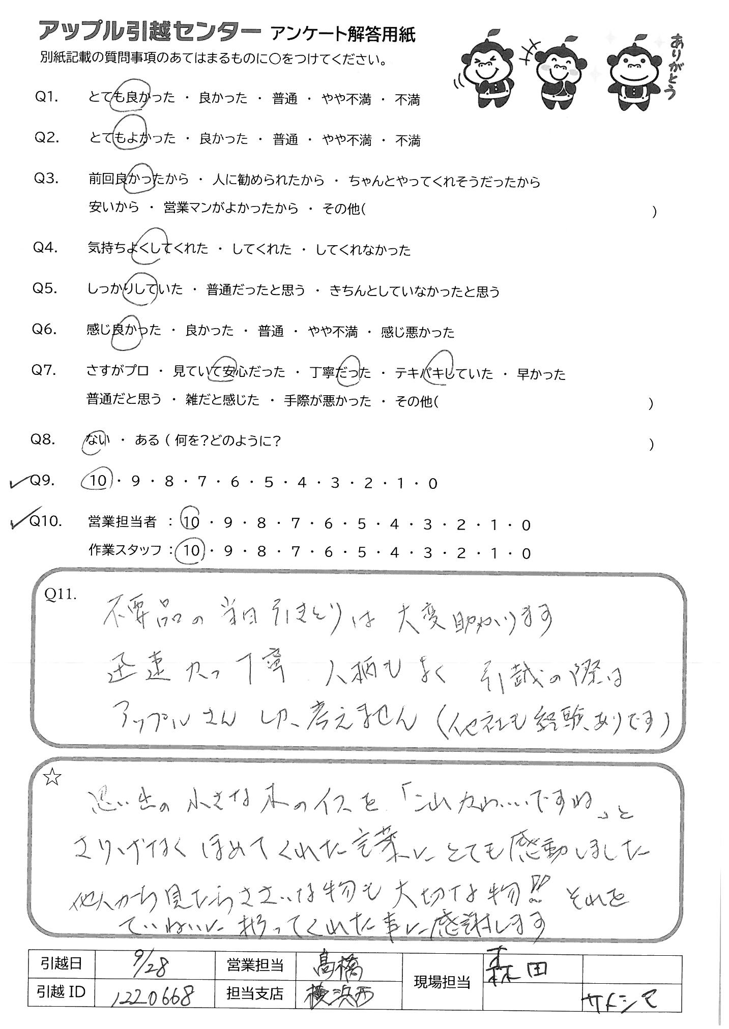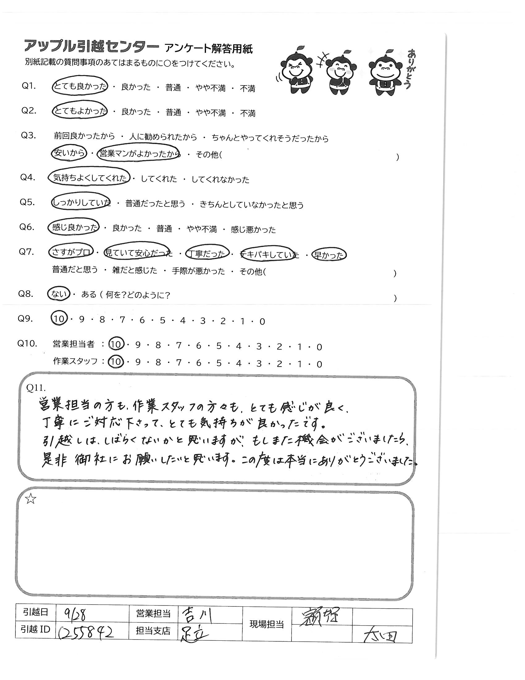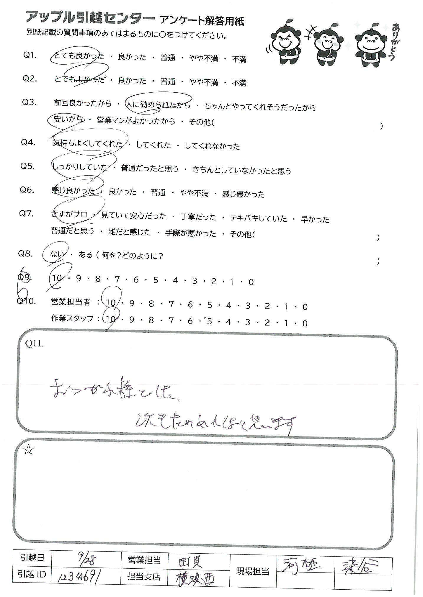 A.営業担当の方も、作業スタッフの方々も、とても感じが良く、 丁寧にご対応下さって、とても気持ちが良かったです。 引越しは、しばらくないかと思いますが、もしまた機会がございましたら、是非御社にお願いしたいと思います。この度は本当にありがとうございました。