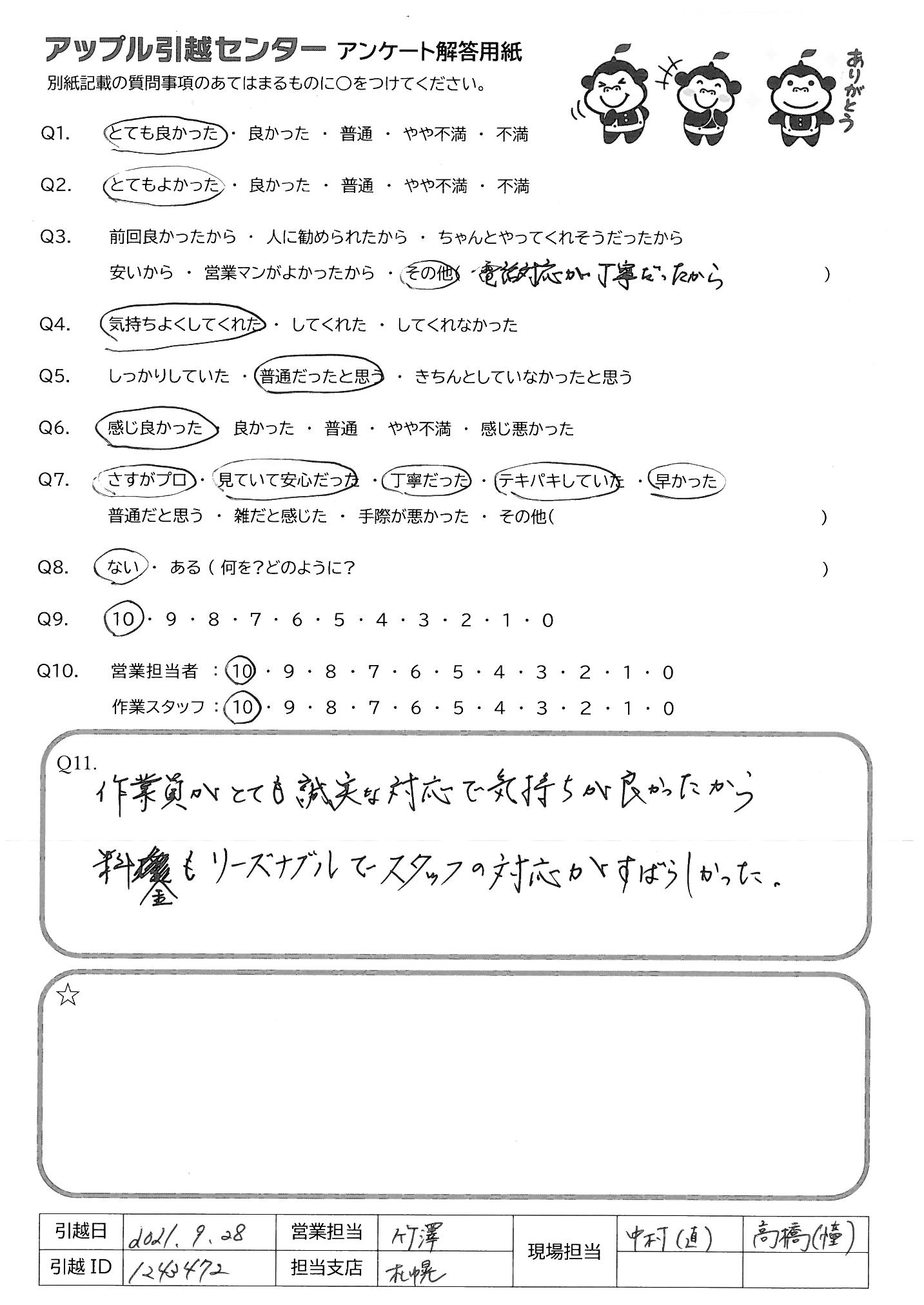 引越し日:2021年09月28日 エリア:北海道旭川市