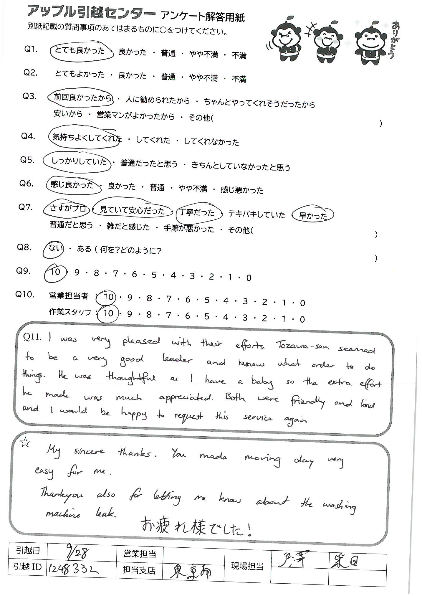 A.I was very pleased with their efforts Tozawa-san seemed to be a very good leader and knew what order to do things. He was thoughtful as I have a baby so the extra effort he made was much appreciated. Both were friendly and land and I would be happy to request this service again.