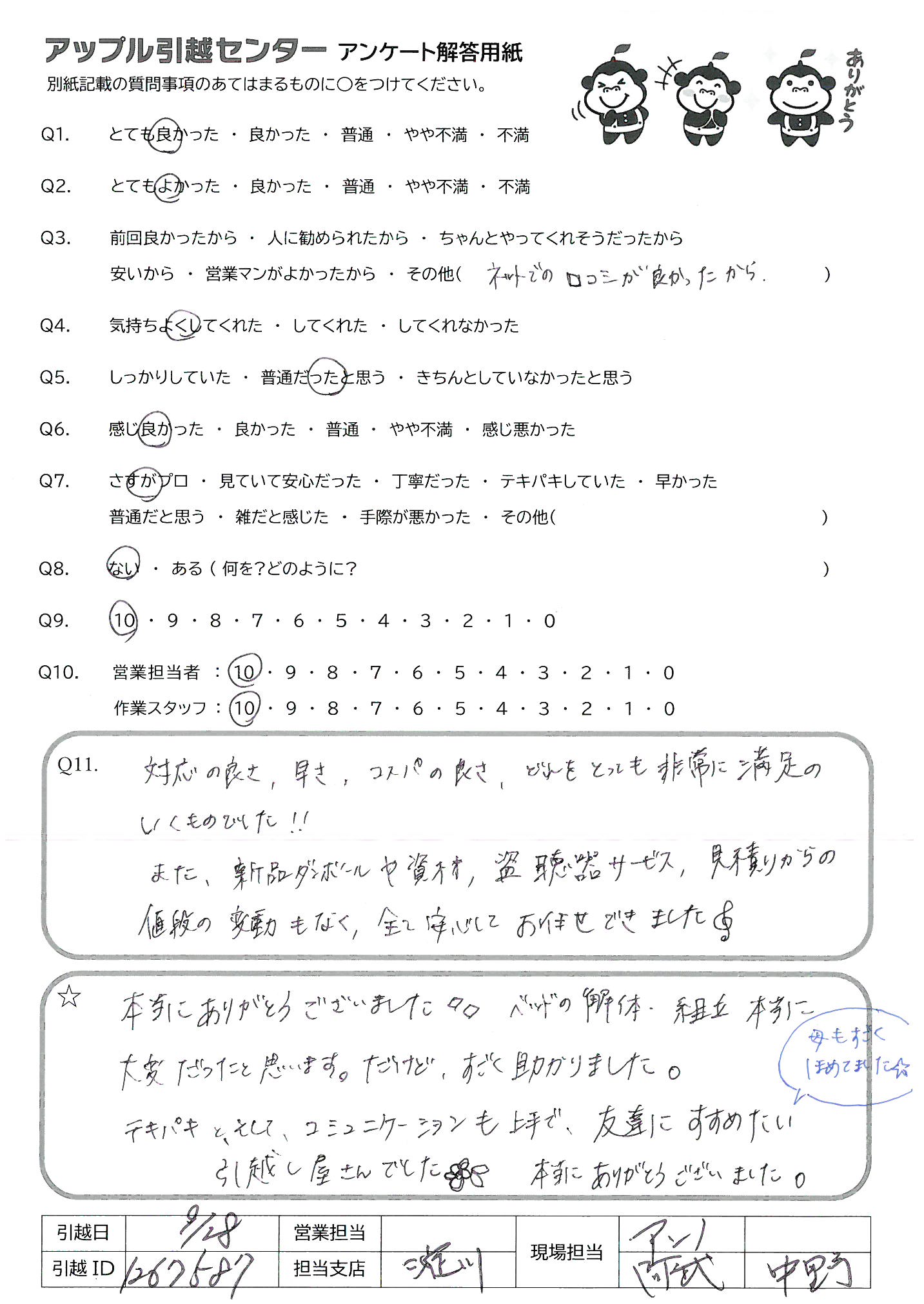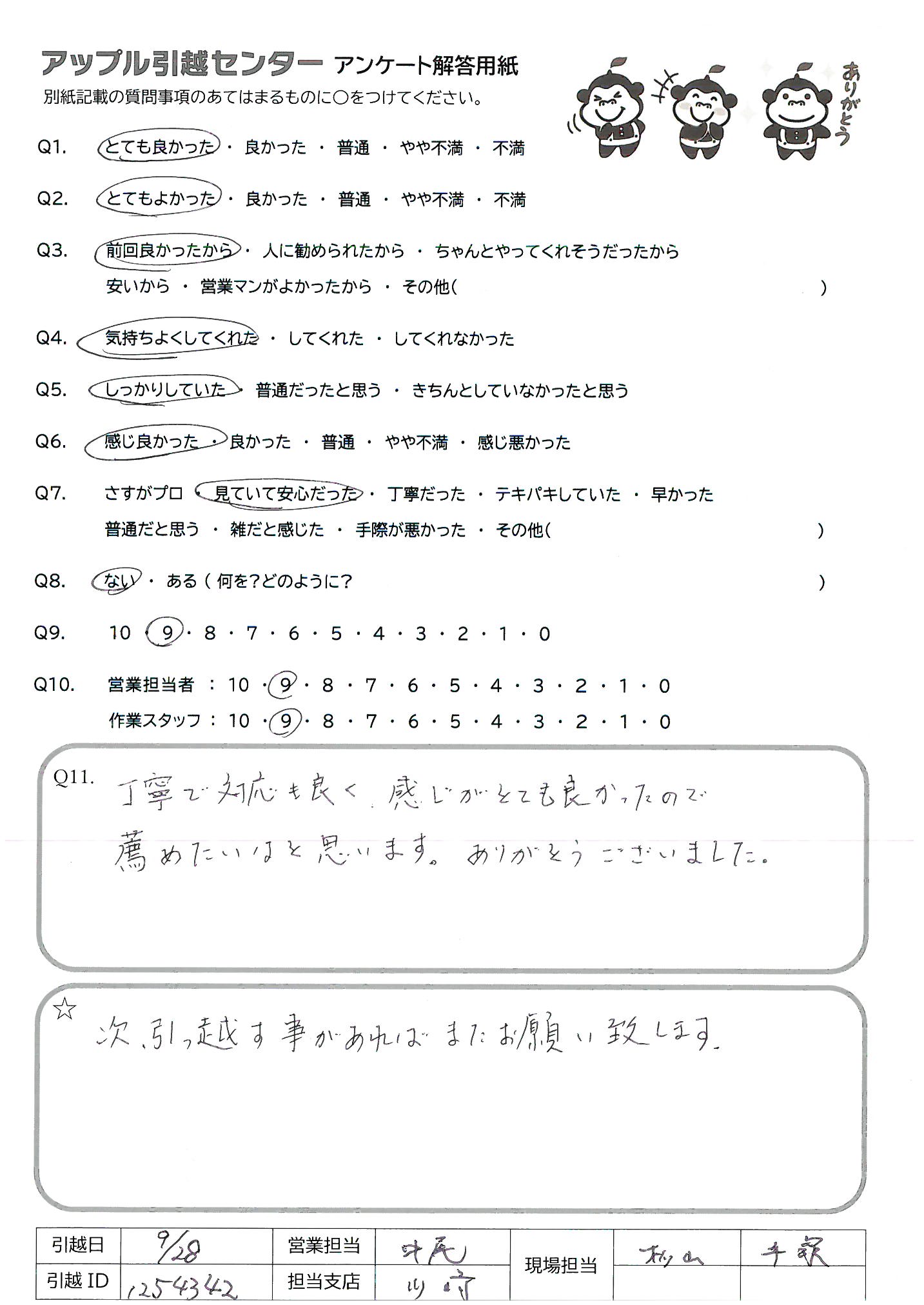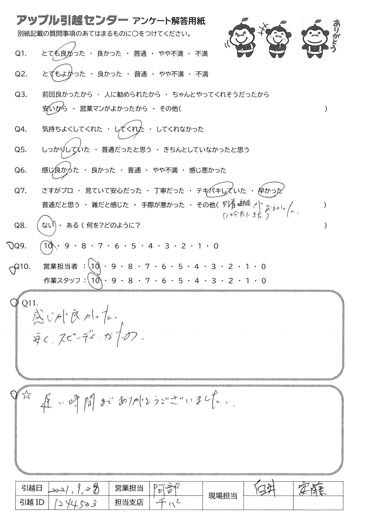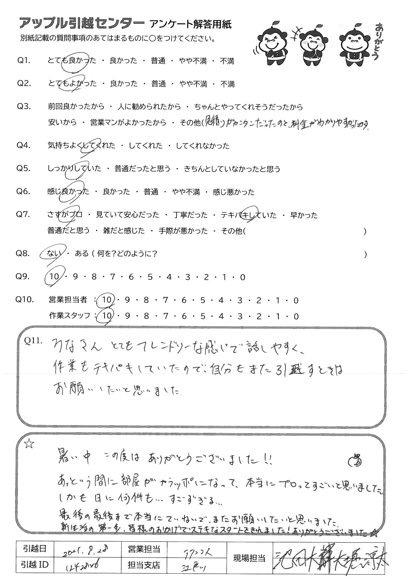 A.みなさんとてもフレンドリーな感じで話しやすく、作業もテキパキしていたので、自分もまた引越すときはお願いしたいとおもいました。