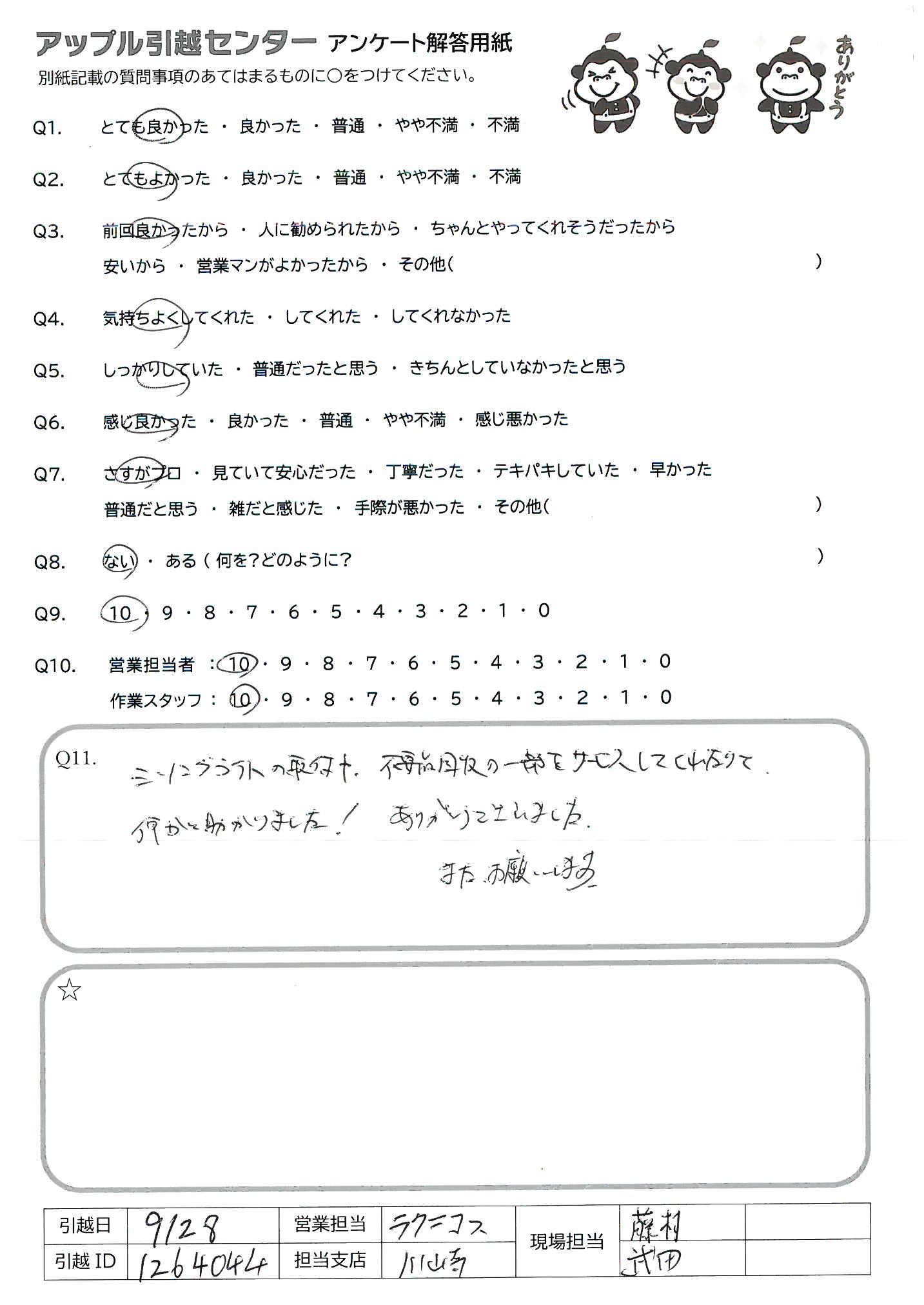 A.暑い中この度はありがとうございました!!あっという間に部屋がカラッポになって、本当にプロってすごいとおもいました。 しかも日に何件も…すごすぎる… 最後の最後まで本当にていねいでまた、お願いしたいとおもいました。 新生活の第一も、皆様のおかげでステキナスタートきれました!ありがとうございました。