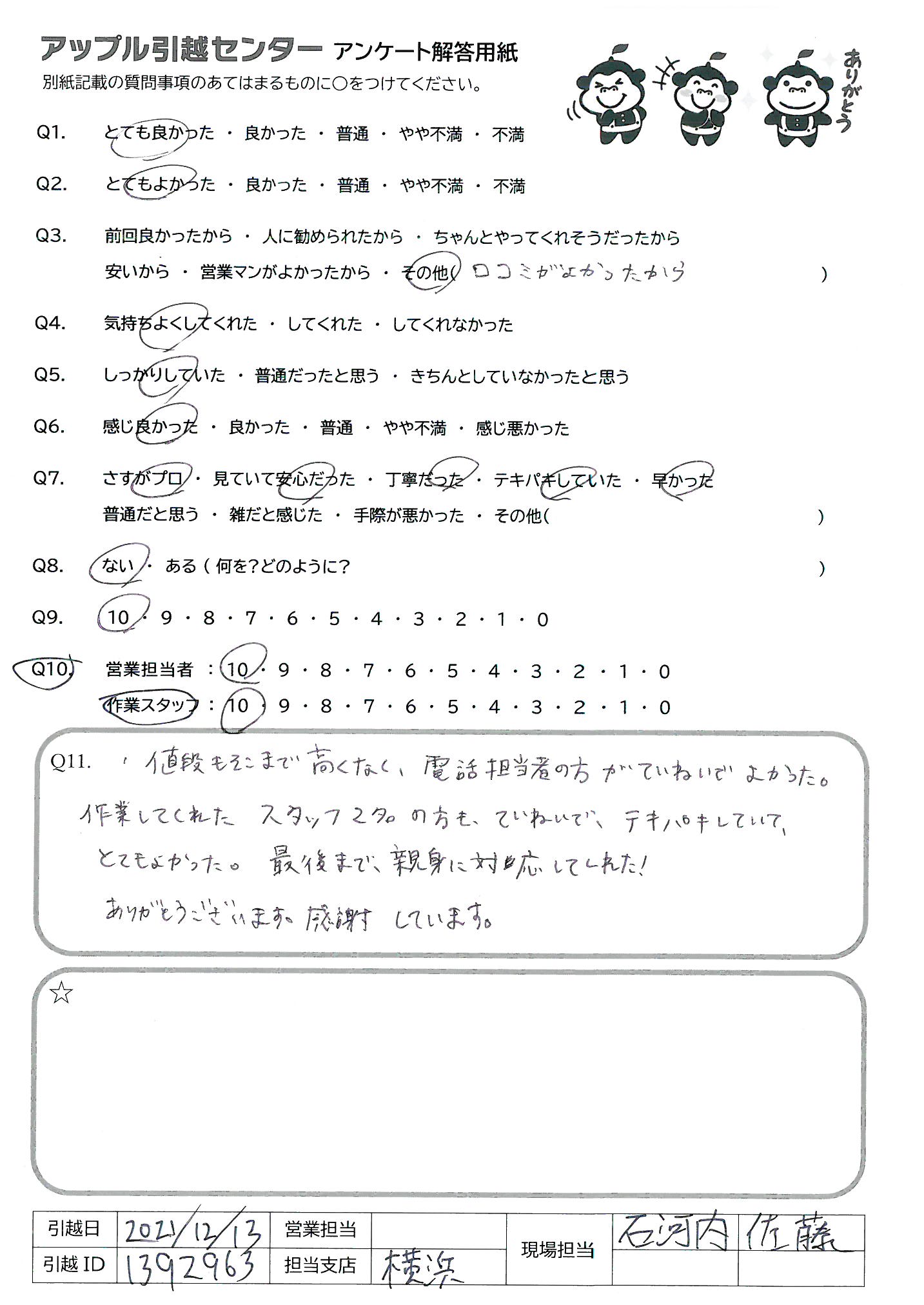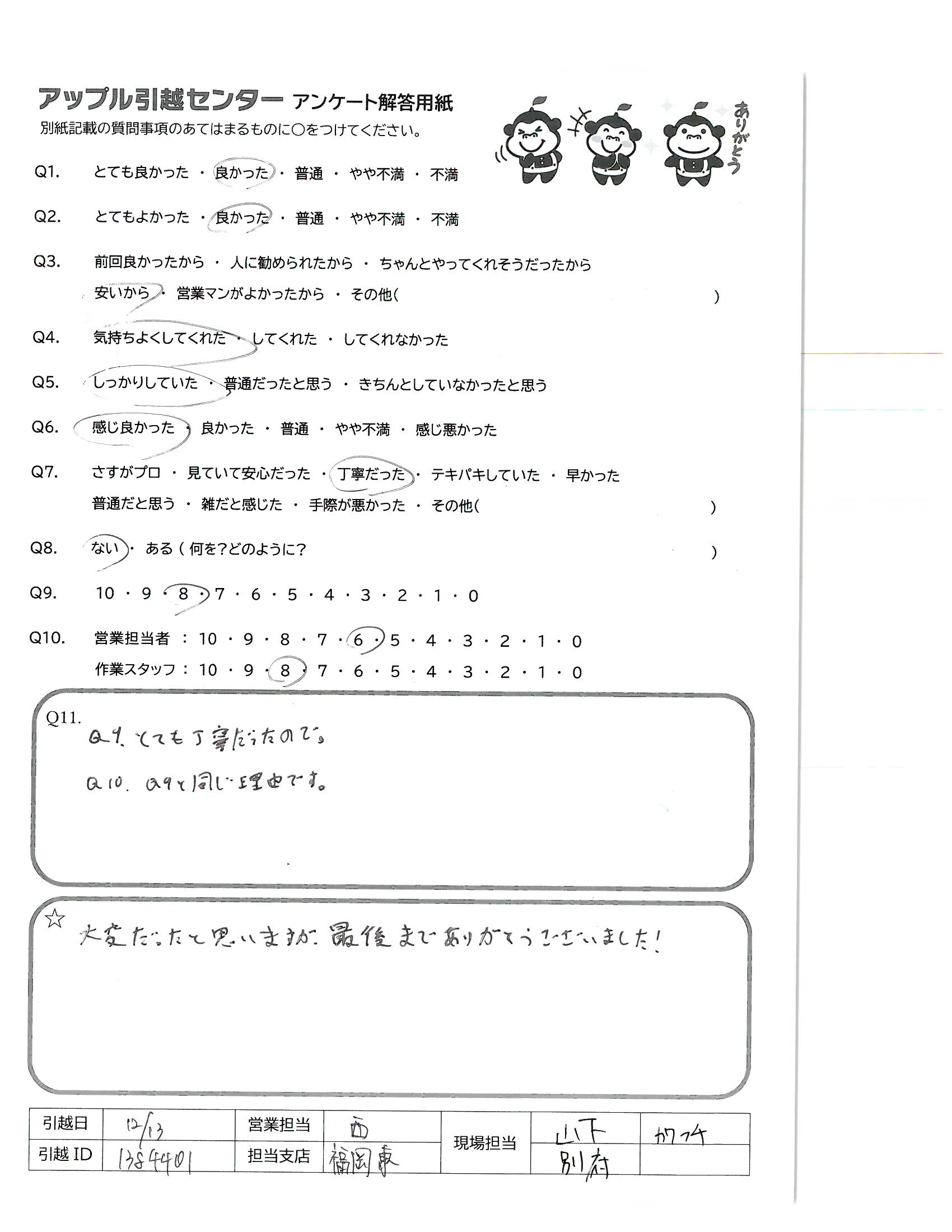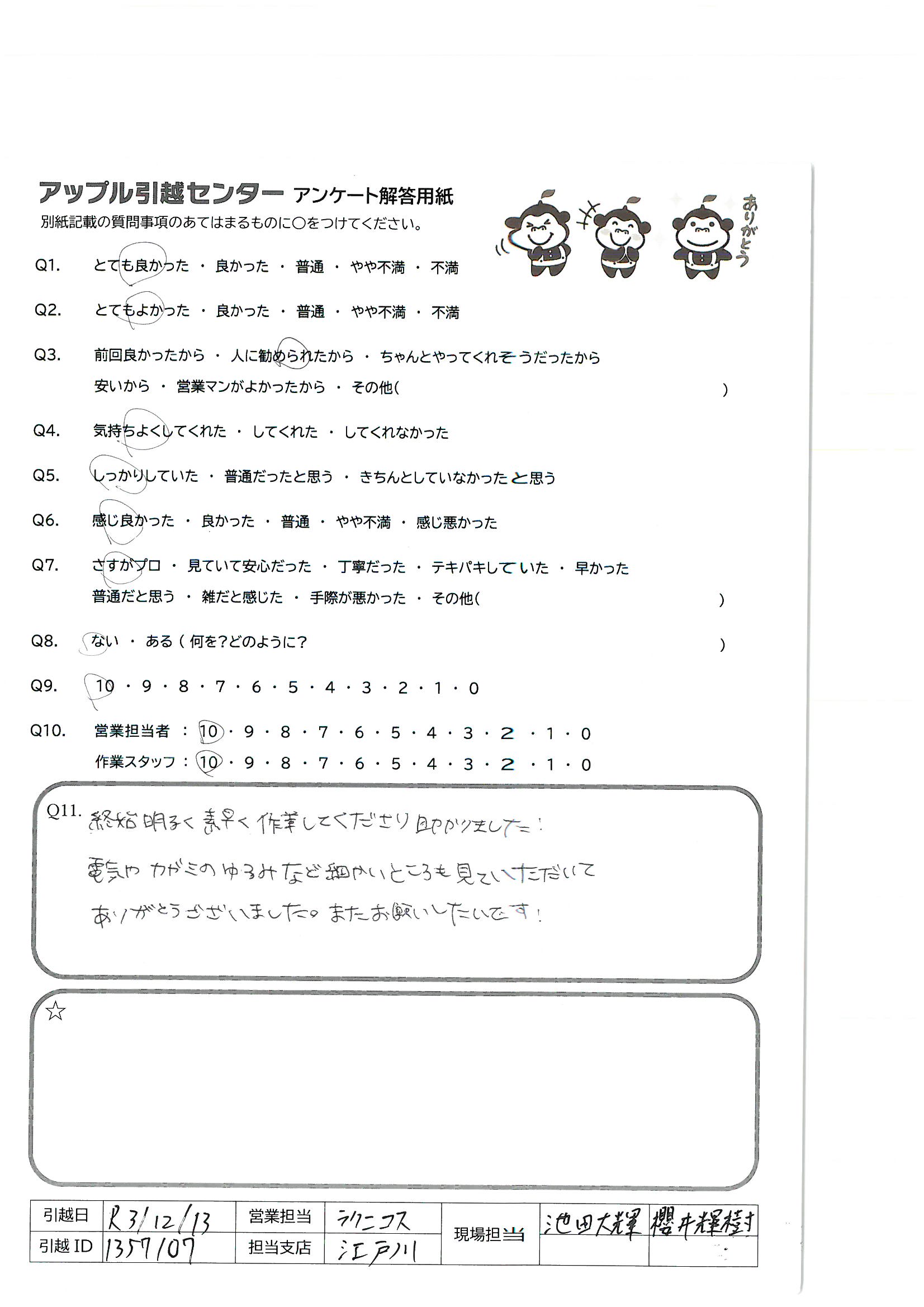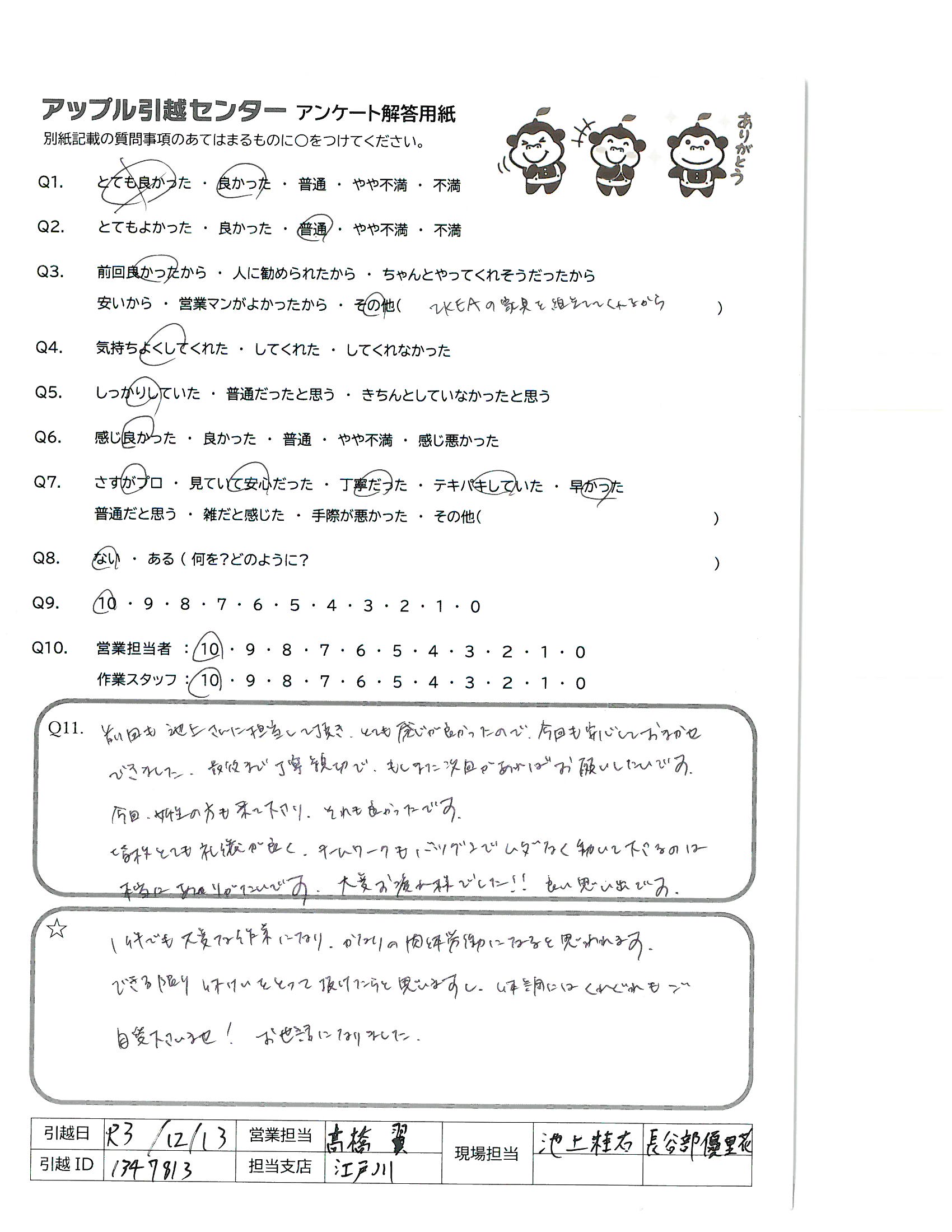 A.前回も池上さんに担当して頂きとても感じが良かったので、今回も安心しておまかせできました。最後まで丁寧親切で、もしまた次回があればお願いしたいです。今回、女性の方も来て下さり、それも良かったです。 皆様とても礼儀が良く、チームワークもバッグまでムダなく動いて下さるのは本当にありがたいです。大変お疲れ様でした!!良い思い出です。