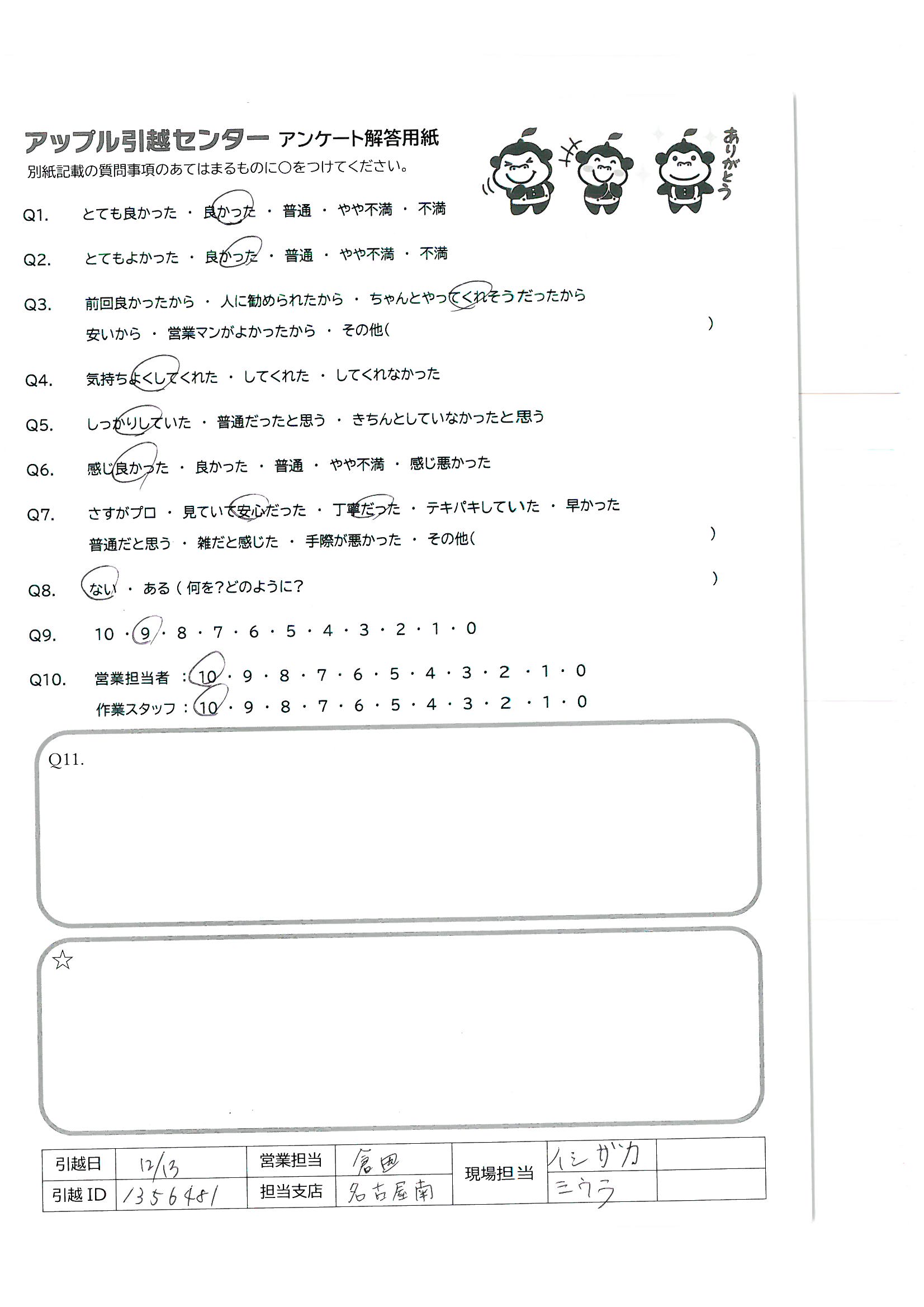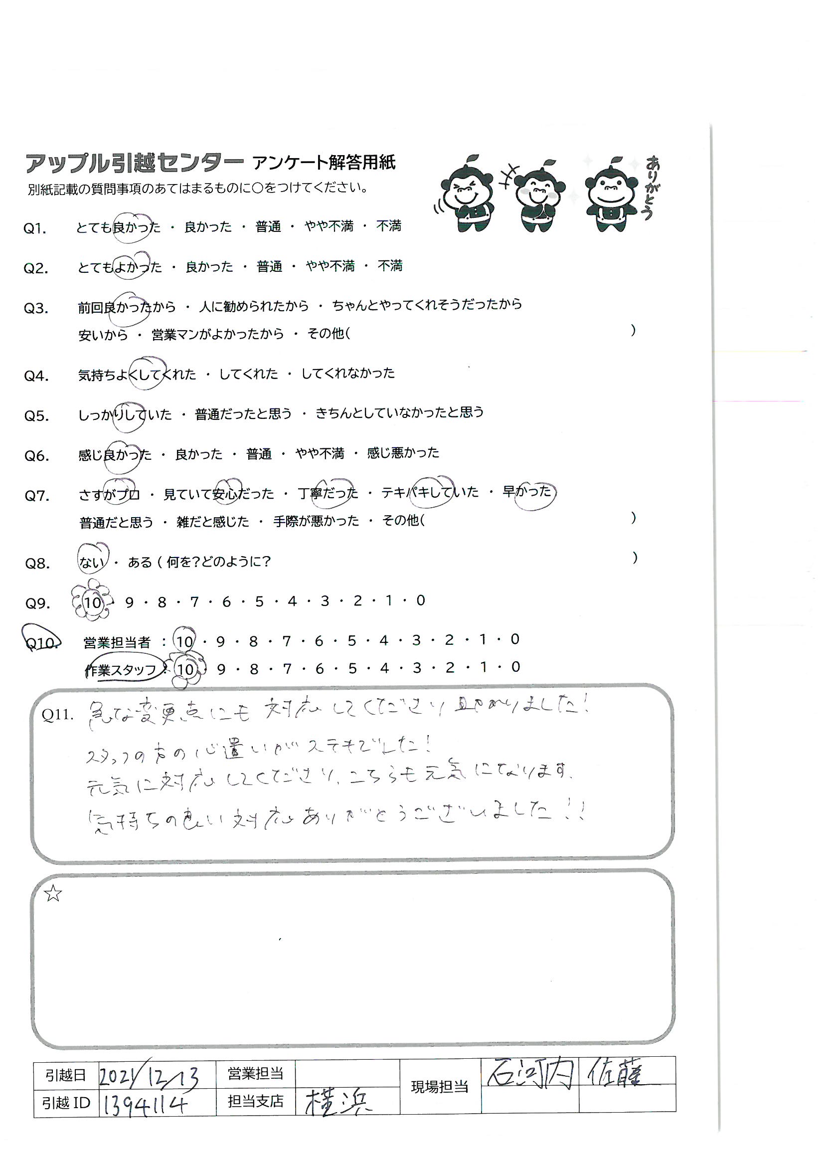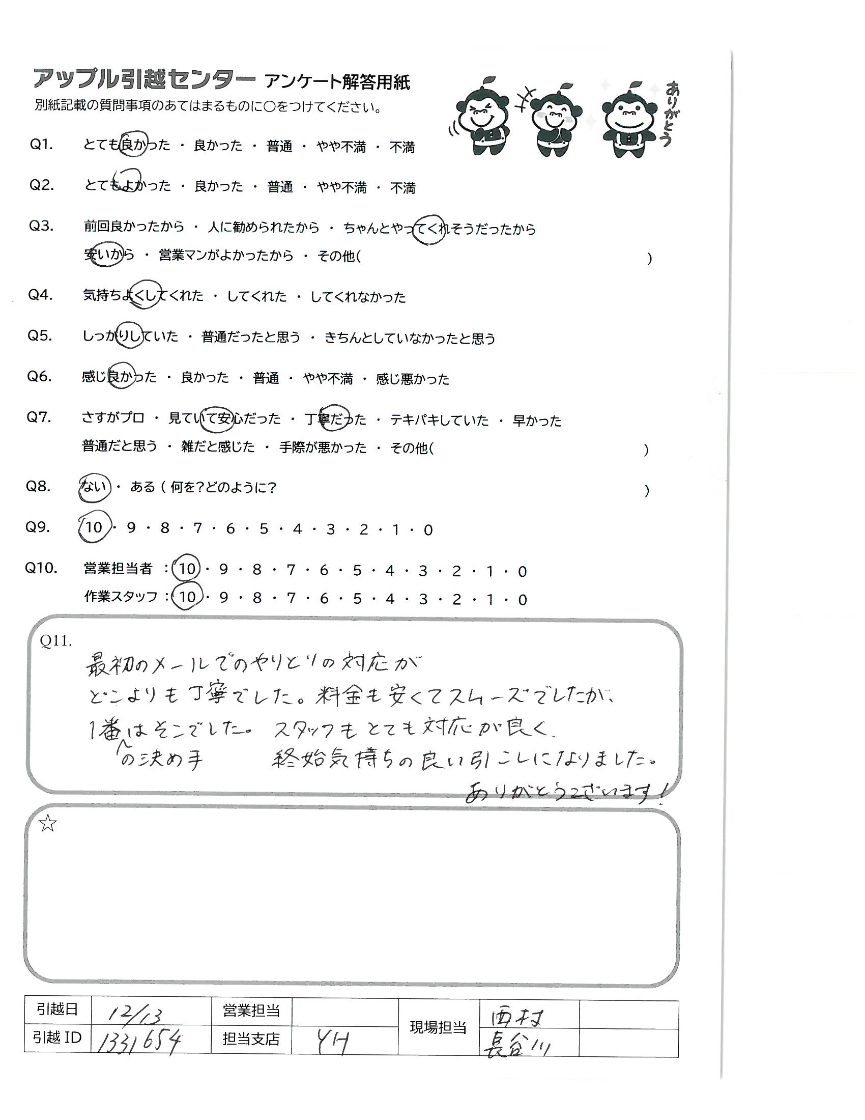 A.前回も池上さんに担当して頂きとても感じが良かったので、今回も安心しておまかせできました。最後まで丁寧親切で、もしまた次回があればお願いしたいです。今回、女性の方も来て下さり、それも良かったです。 皆様とても礼儀が良く、チームワークもバッグまでムダなく動いて下さるのは本当にありがたいです。大変お疲れ様でした!!良い思い出です。