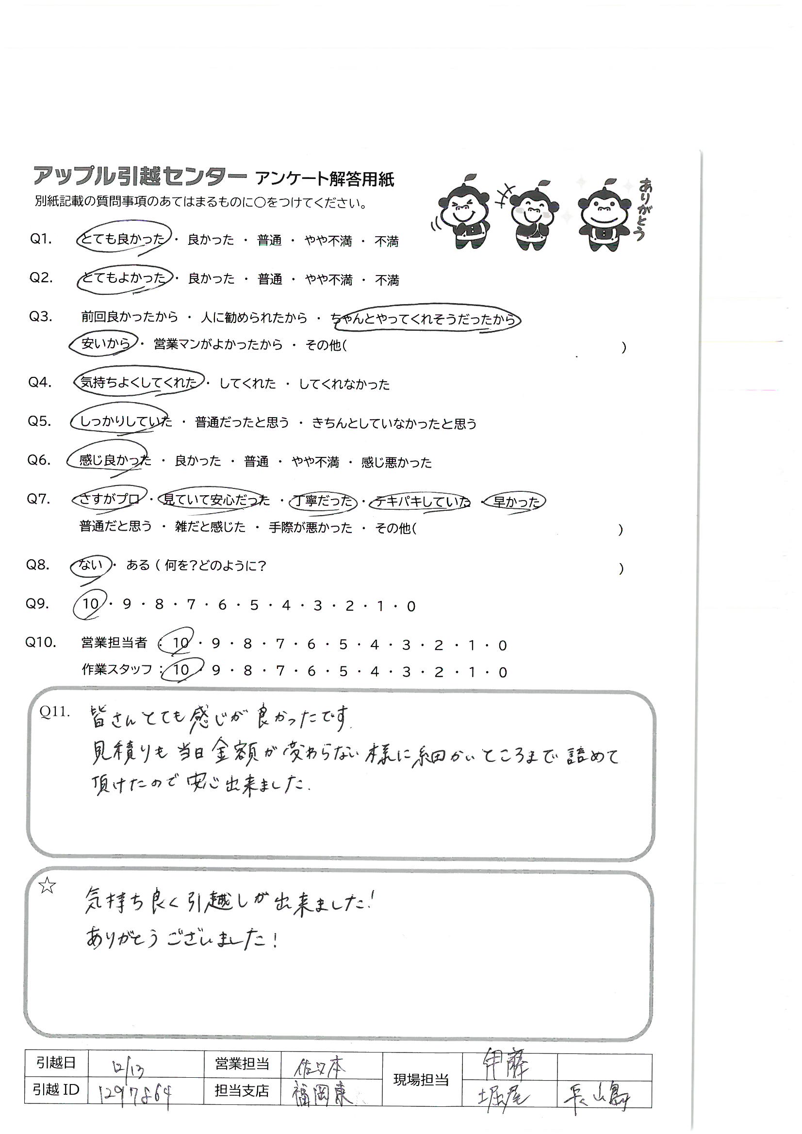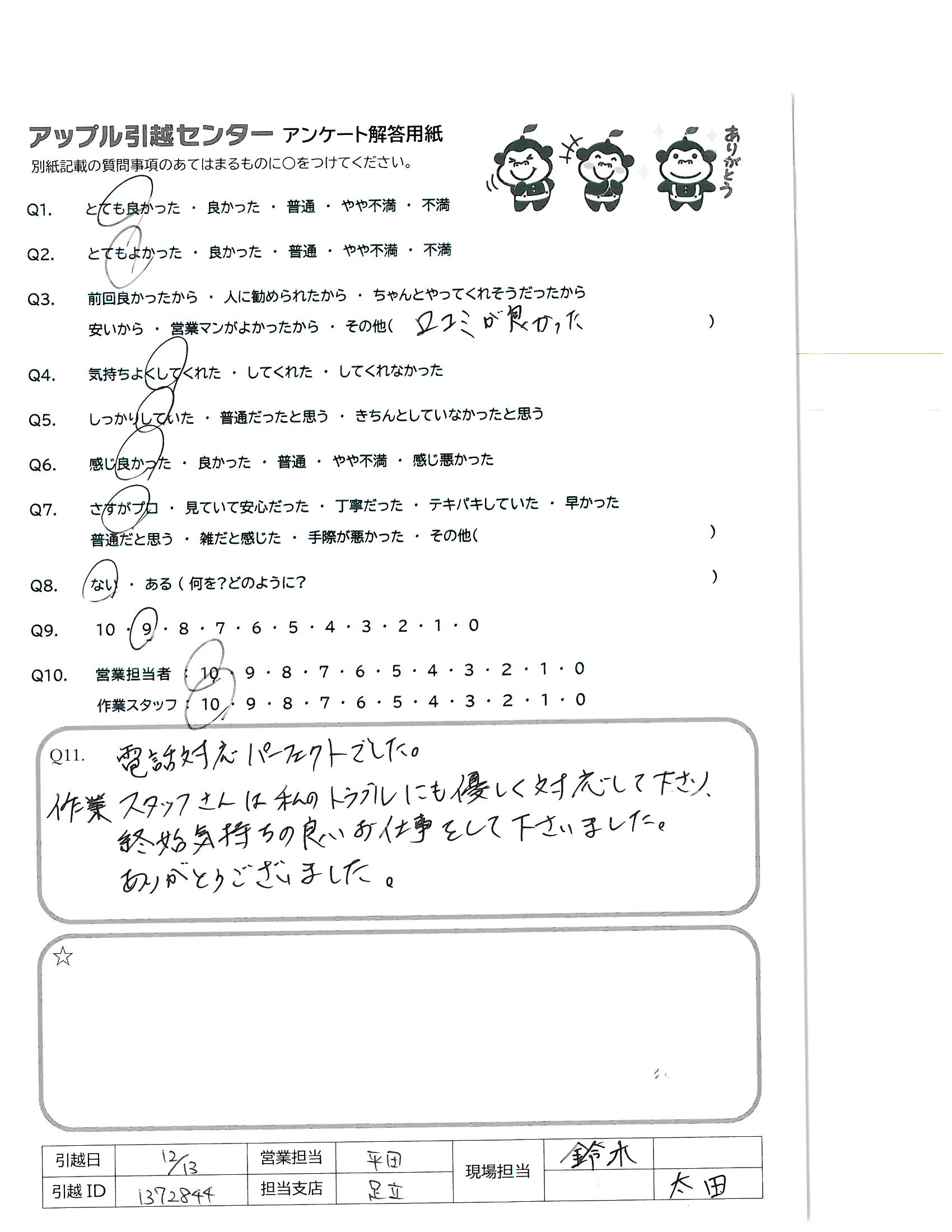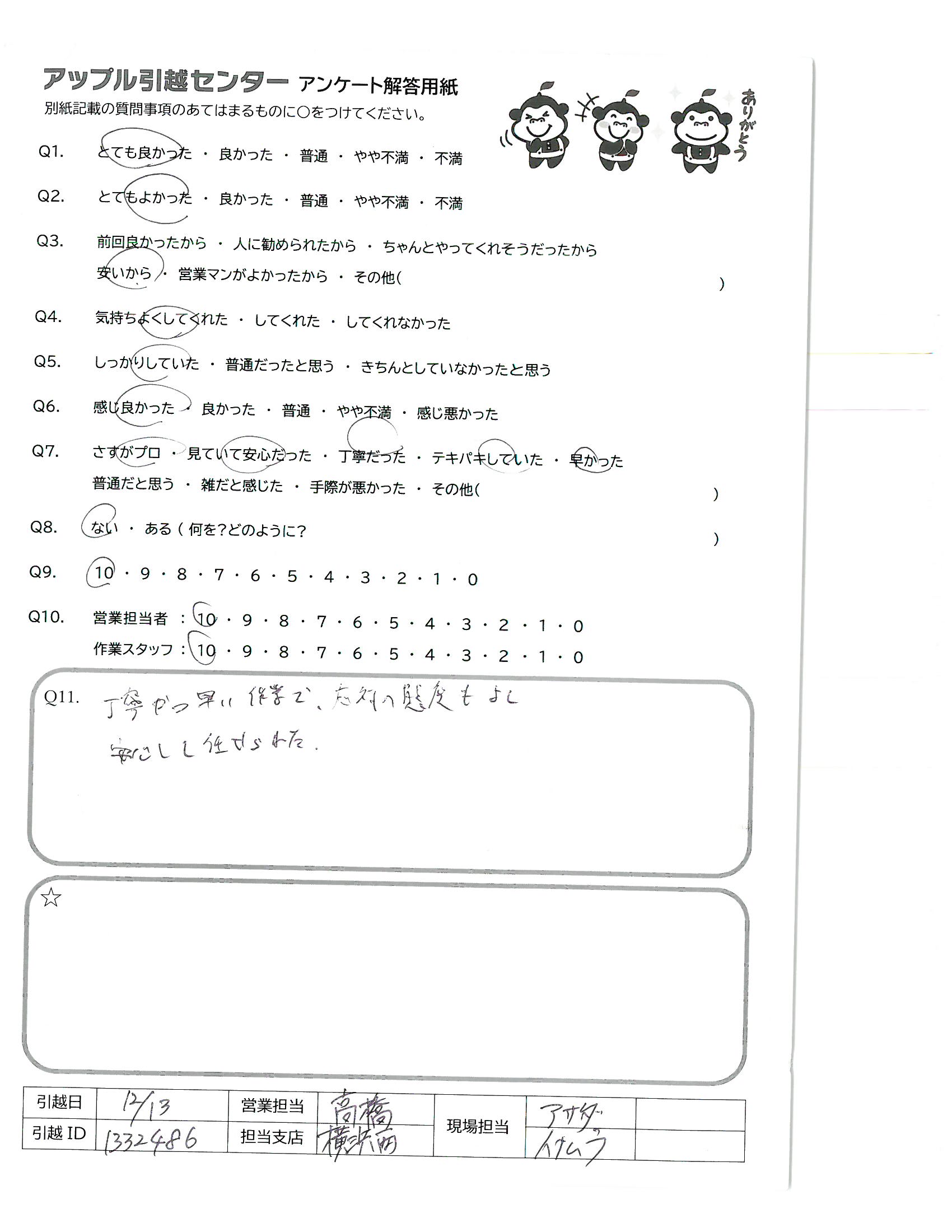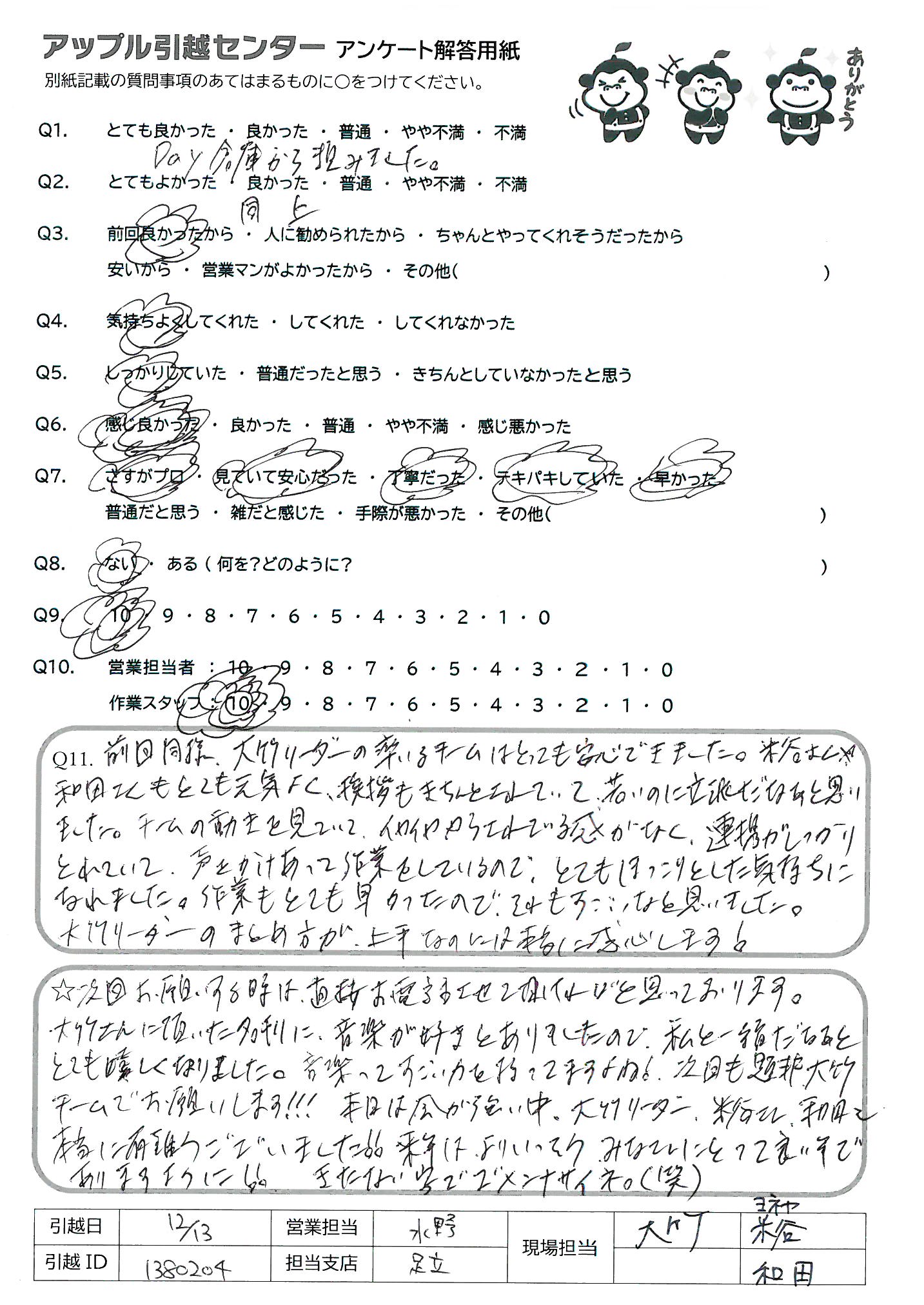 A.前回も池上さんに担当して頂きとても感じが良かったので、今回も安心しておまかせできました。最後まで丁寧親切で、もしまた次回があればお願いしたいです。今回、女性の方も来て下さり、それも良かったです。 皆様とても礼儀が良く、チームワークもバッグまでムダなく動いて下さるのは本当にありがたいです。大変お疲れ様でした!!良い思い出です。
