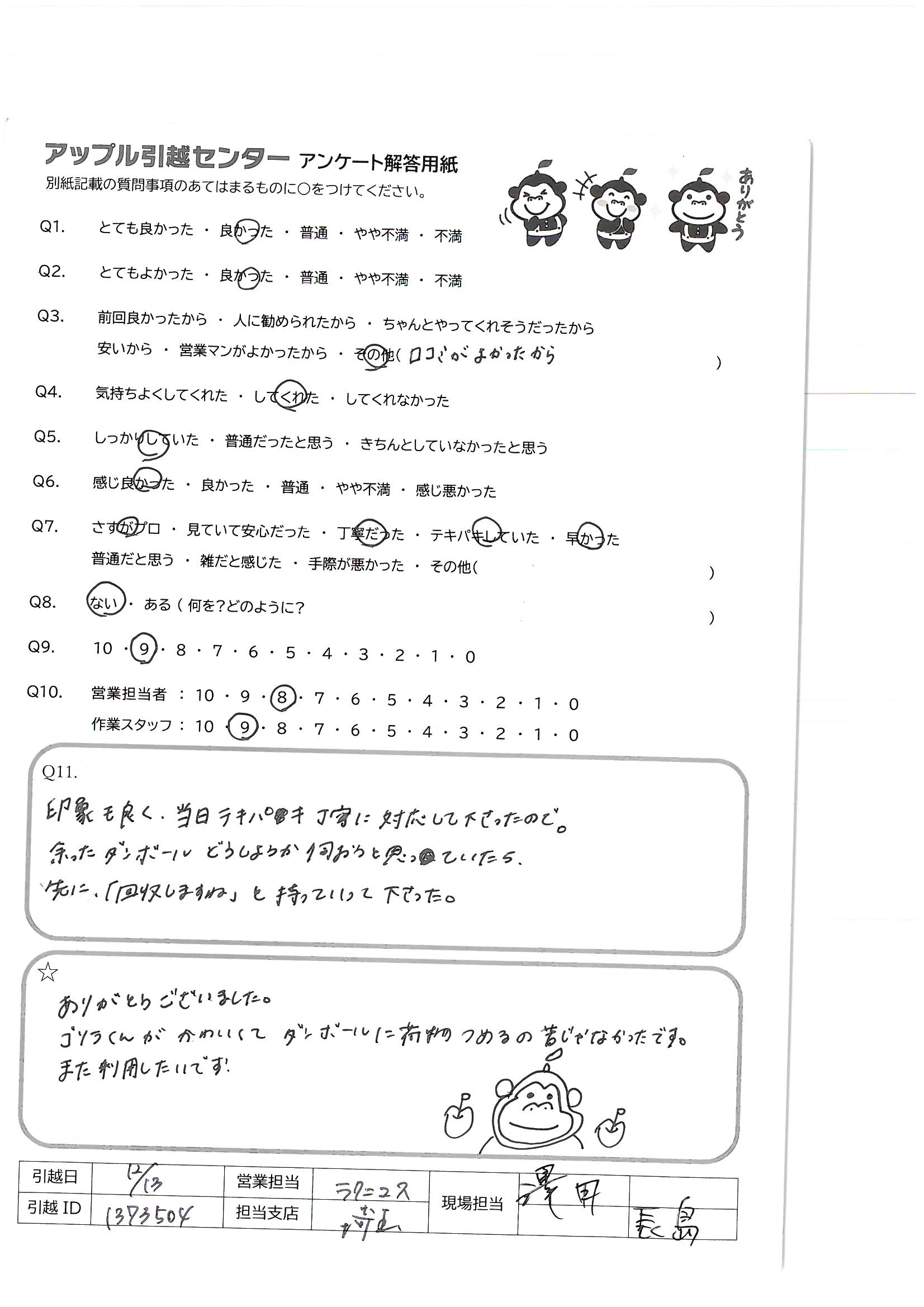 A.印象も良く、当日テキパキ丁寧に対応して下さったので。 余ったダンボールどうしようか伺おうと思っていたら、先に「回収しますね」と持っていって下さった。