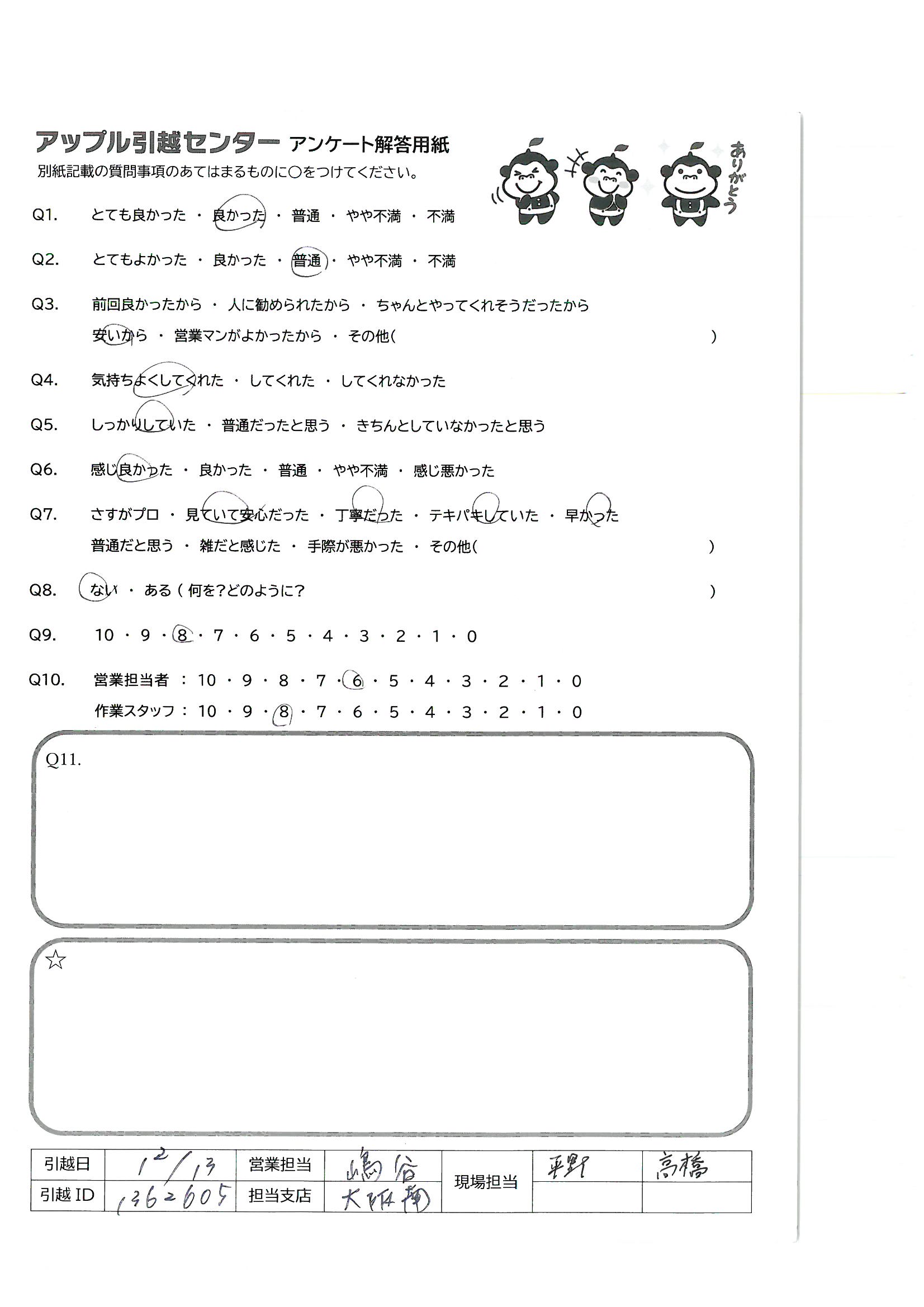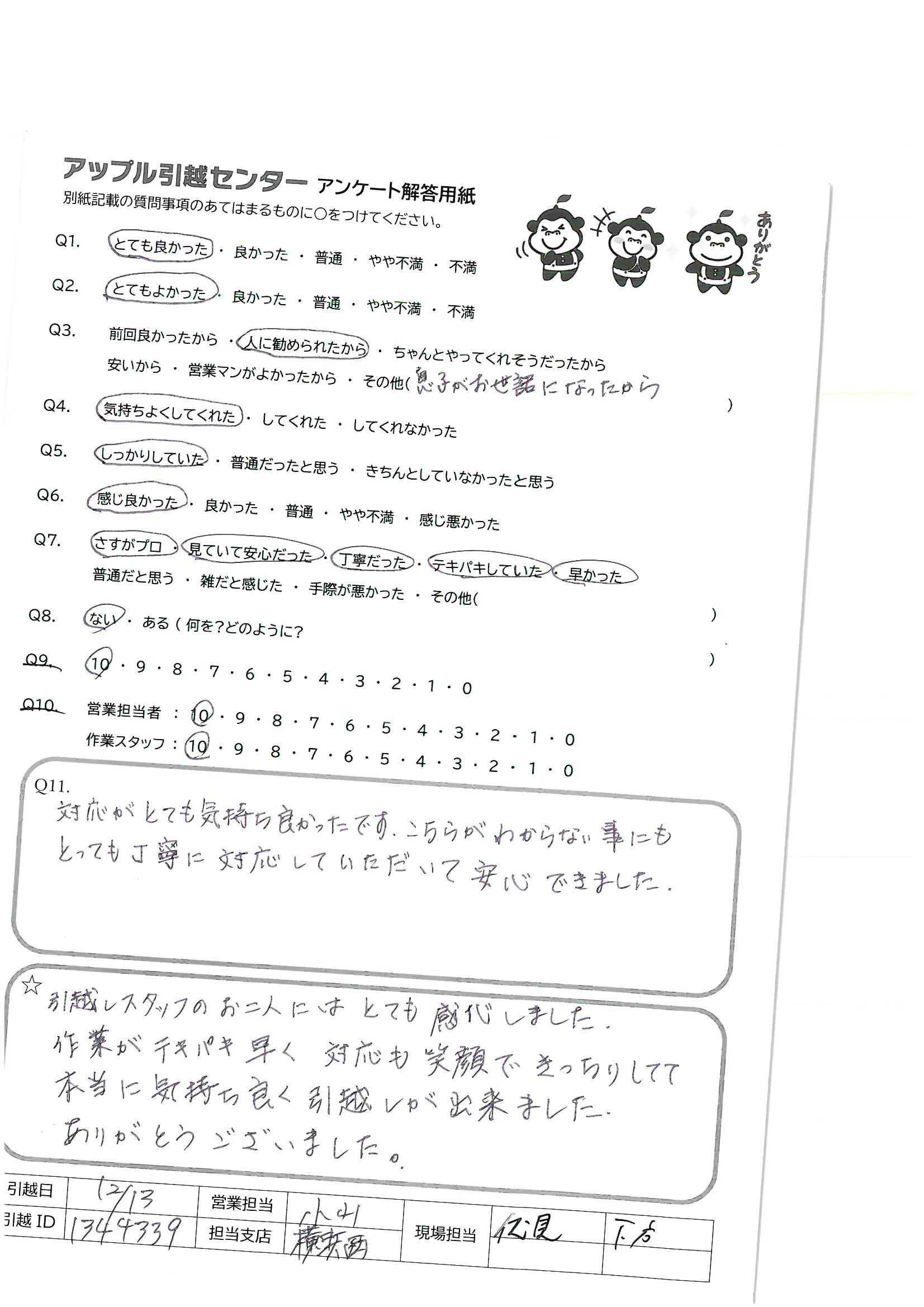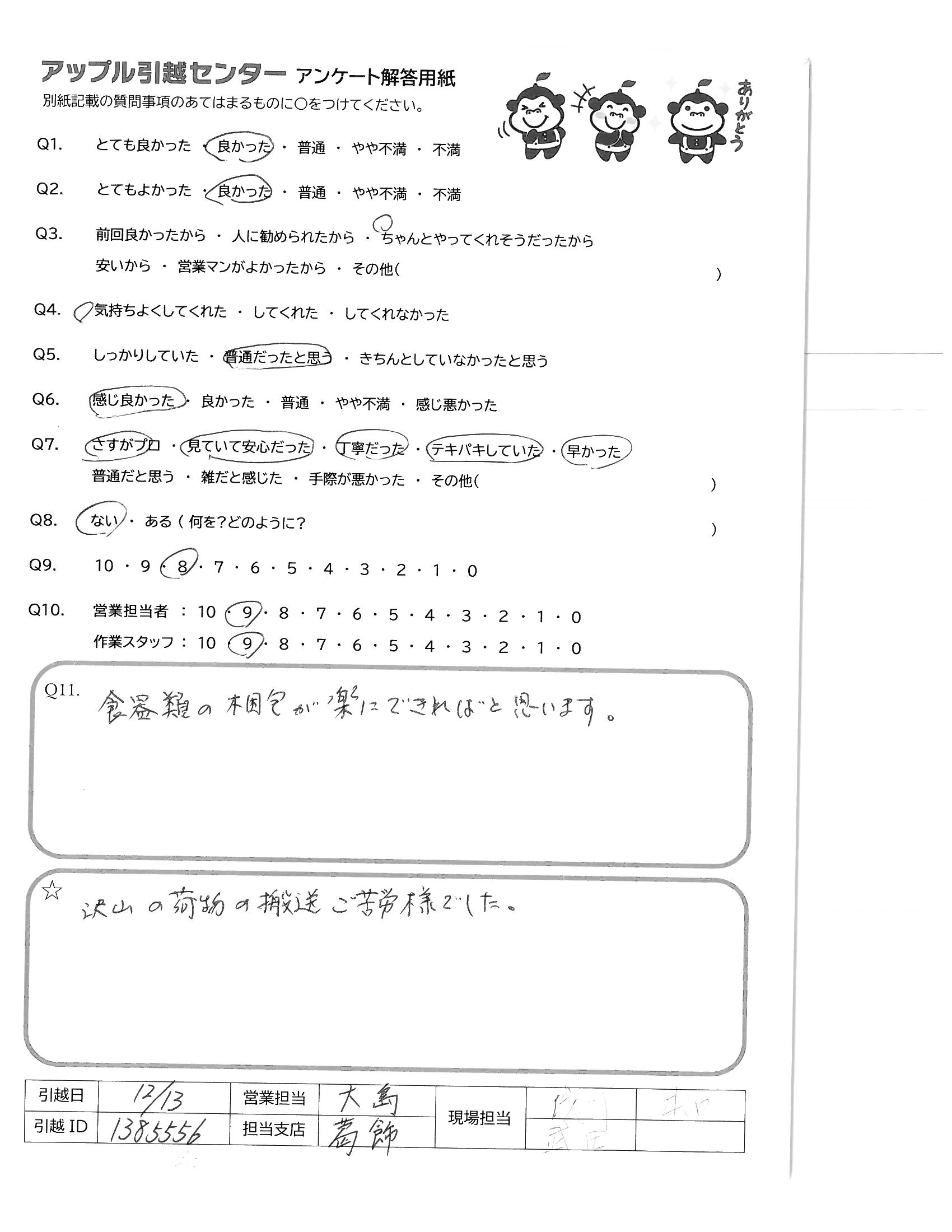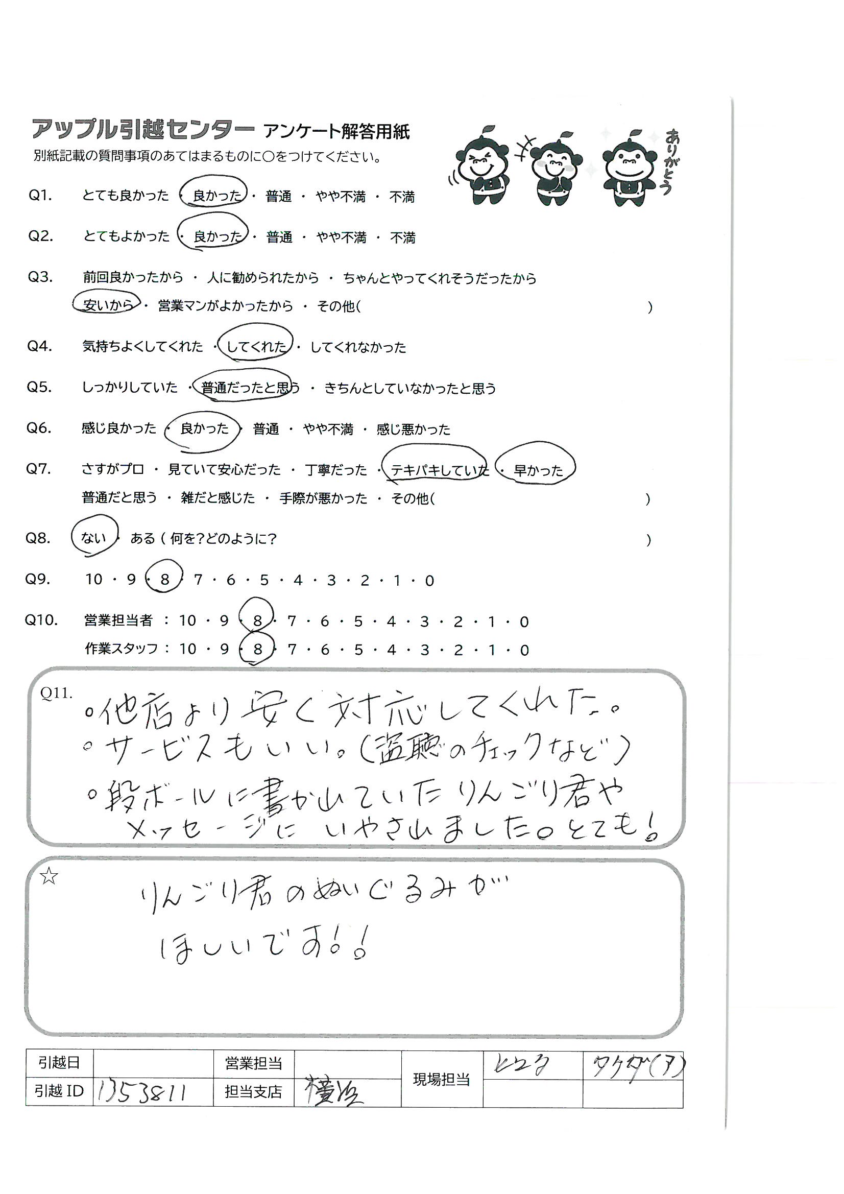 A.引越までの準備日数がほとんどなく、不用品処分も多く、遠距離移動だったため、即決力と柔軟な対応に安心し頼もしく思いました! 次の機会や友人等にもアップルさんをすすめたいです!!