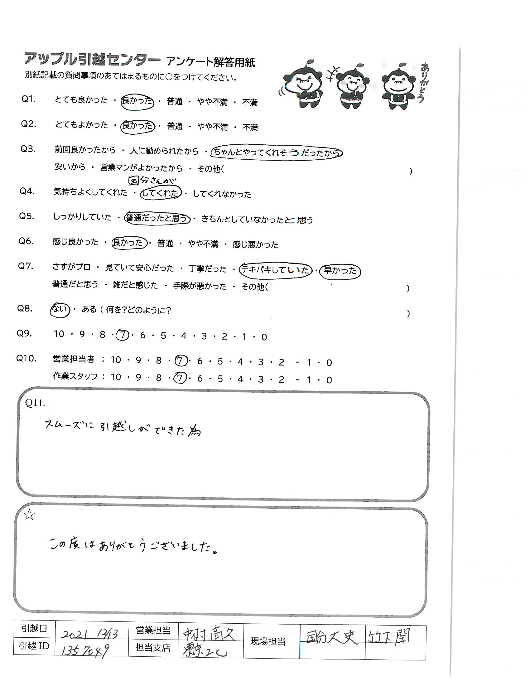 引越し日:2021年12月13日 エリア:福岡県福岡市博多区