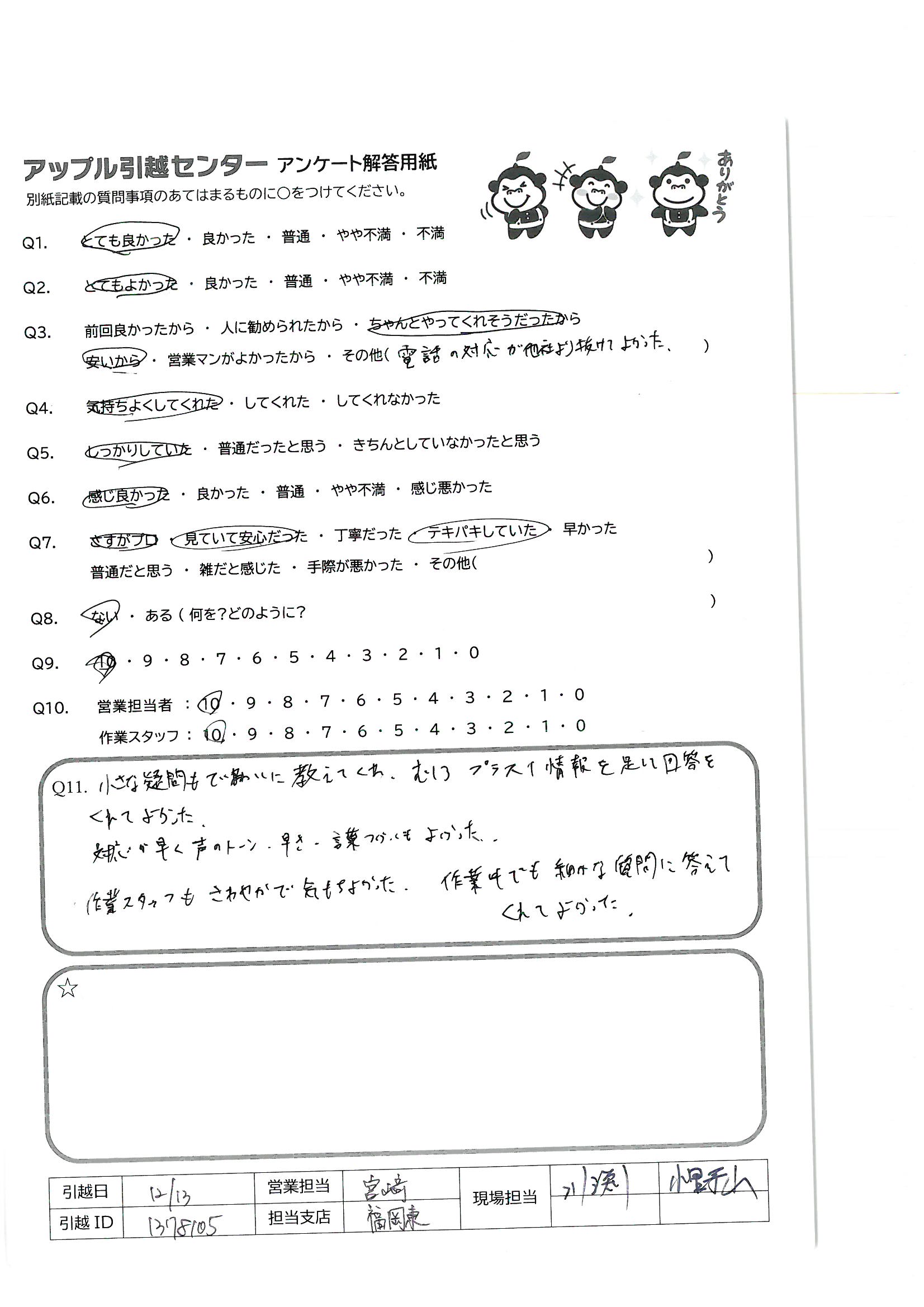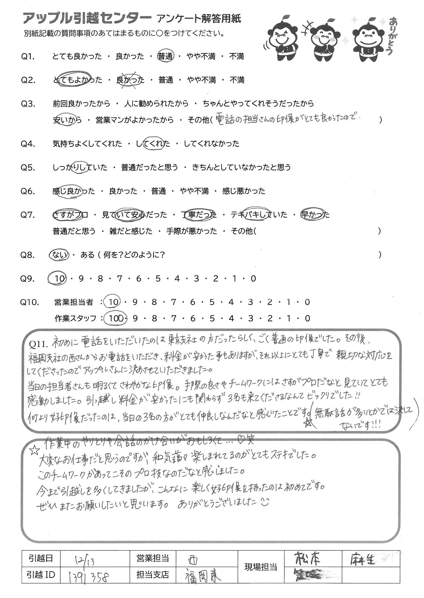 A.初めに電話をいただいたのは東京支社の方だったらしく、ごく普通の印象でした。その後、福岡支社の西さんからお電話をいただき、料金が安かった事もありますが、それ以上にとても丁寧で親切な対応をしてくださったのでアップルさんに決めさせていただきました。 当日の担当者さんも明るくてさわやかな印象。手際の良さやチームワークにはさすがプロだなと見ていてとても感動しました。引っ越し料金が安かったにも関わらず3名も来てくださるなんでビックリでした!! 何より好印象だったのは、当日の3名の方がとても仲良しなんだなと感じたことです。(無駄話が多いとかでは決してないです!!!)