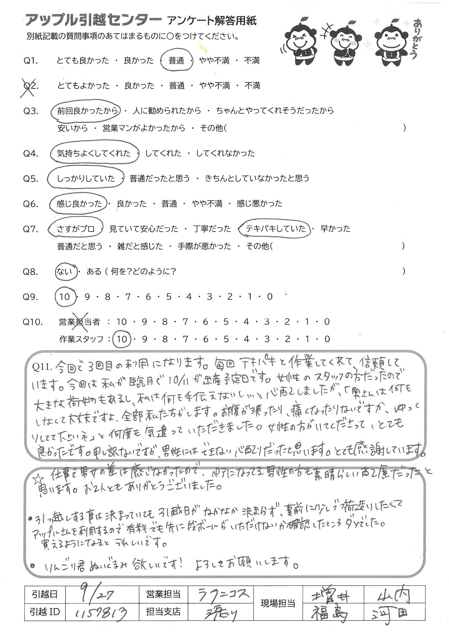 A.今回で3回目の利用になります。毎回テキパキと作業してくれて、信頼しています。今回は私が臨月で10/11が出産予定日です。女性のスタッフの方だったので大きな荷物もあるし、私は何も手伝えないし…と心配しましたが、「奥さんは何にもしなくて大丈夫ですよ。全部私たちがします。お腹が張ったり、痛くなったりないですか、ゆっくりしてて下さいネ」と何度も気遣っていただきました。女性の方がいてくださって、とても良かったです。申し訳ないですが、男性にはできない心配りだったと思います。とても感謝しています。