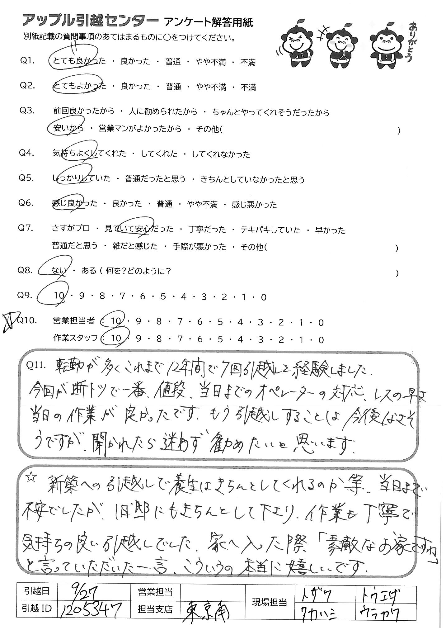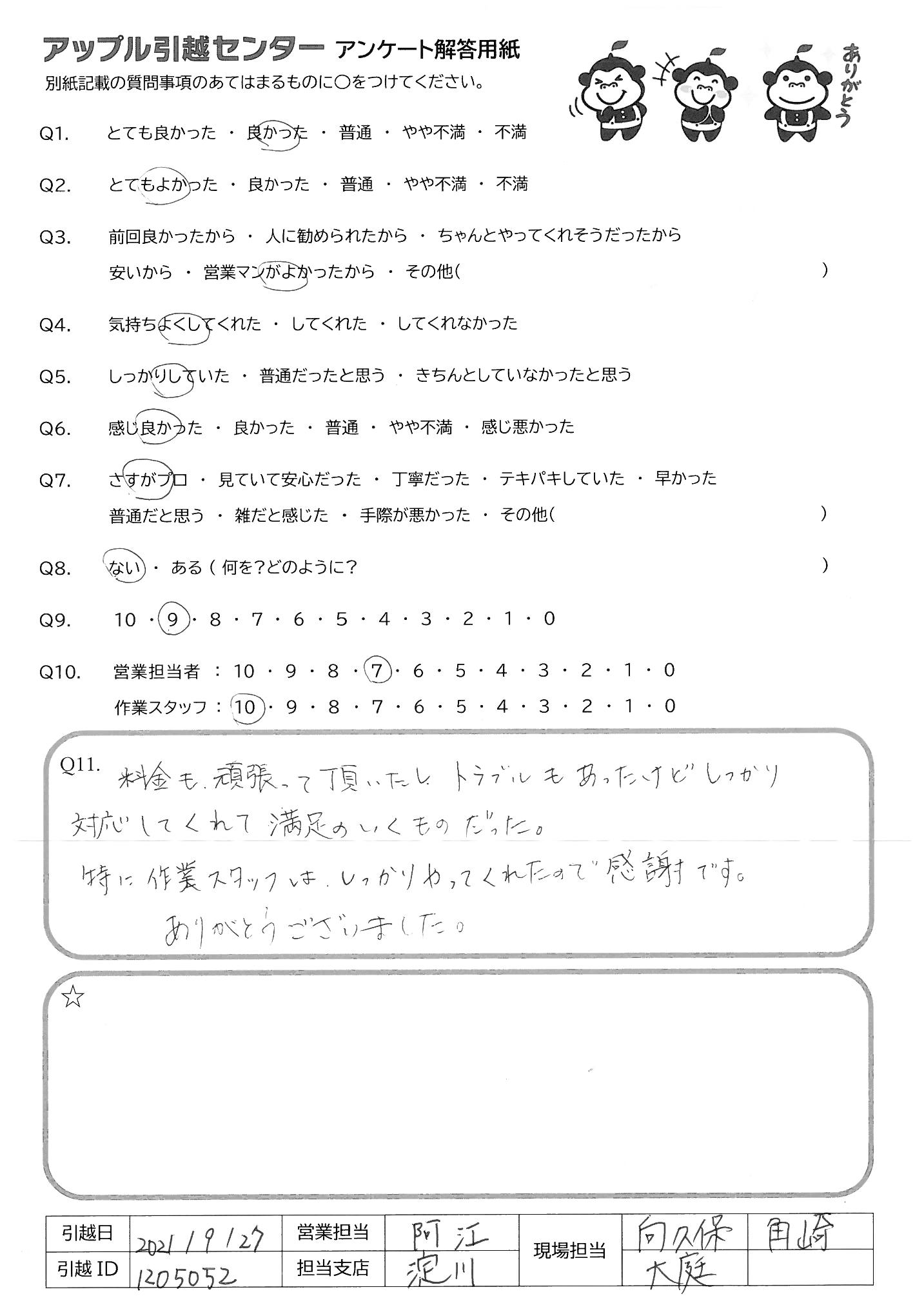 A.前述(Q8)のようなポイントはあったものの、全体的に作業が早く、担当の方々の雰囲気も良かったので満足です。 ありがとうございました。