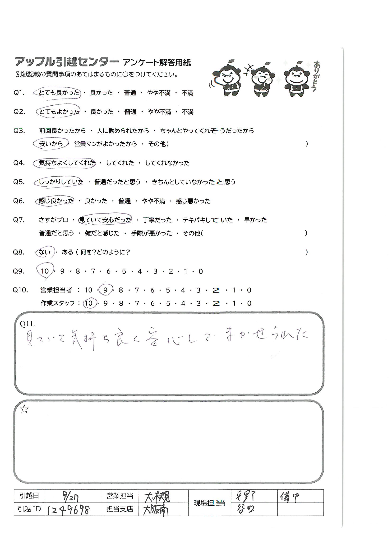 引越し日:2021年09月27日 エリア:大阪府大阪市中央区