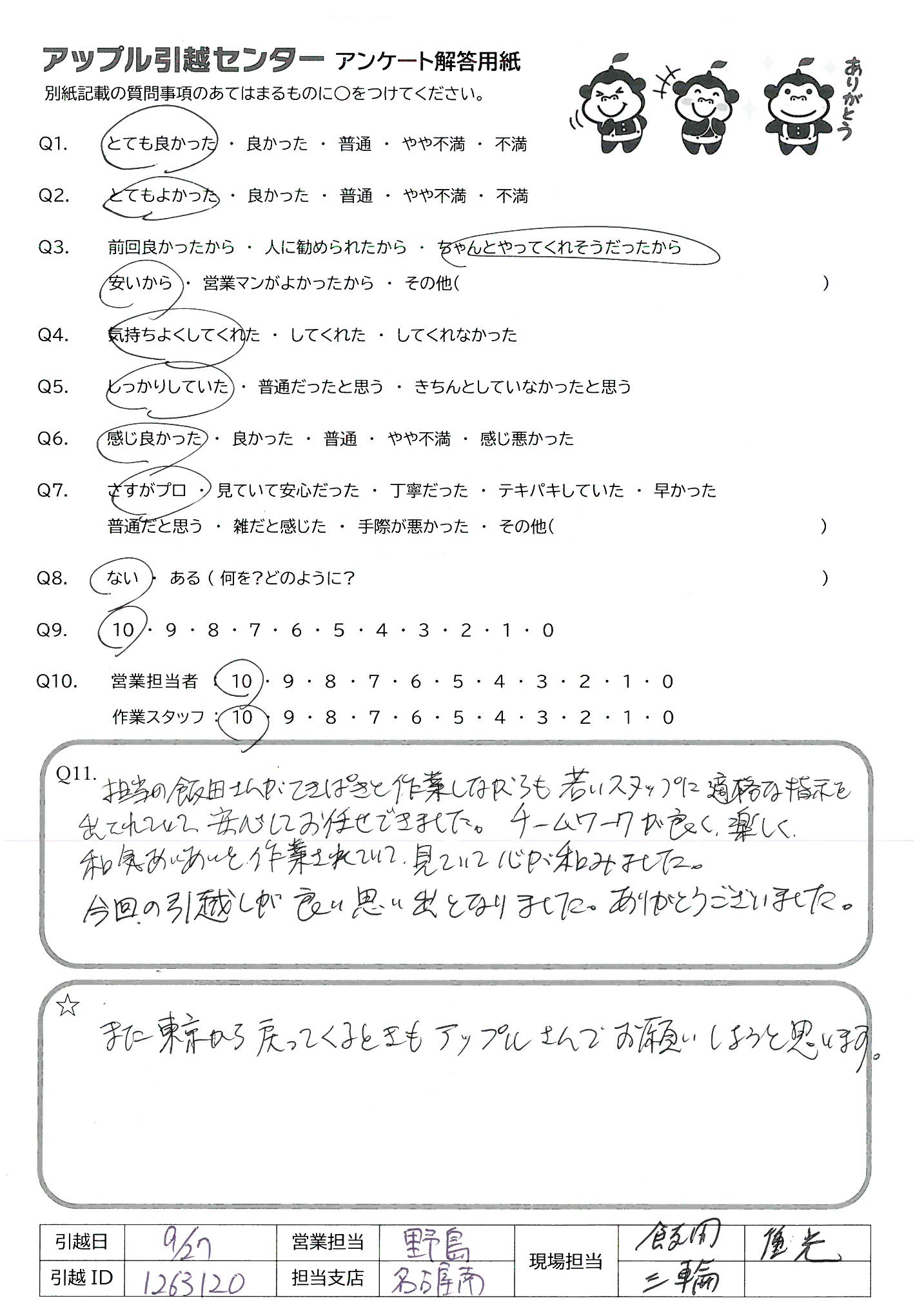 A.アンケートが遅くなってすみません。 今回担当していただいたのが若い方でしたが、教育がしっかりされているのか、印象が非常によかったです。作業も早くて的確でした。 もう一度引越しがあるので、またアップルさんにお願いしようと思ってます。