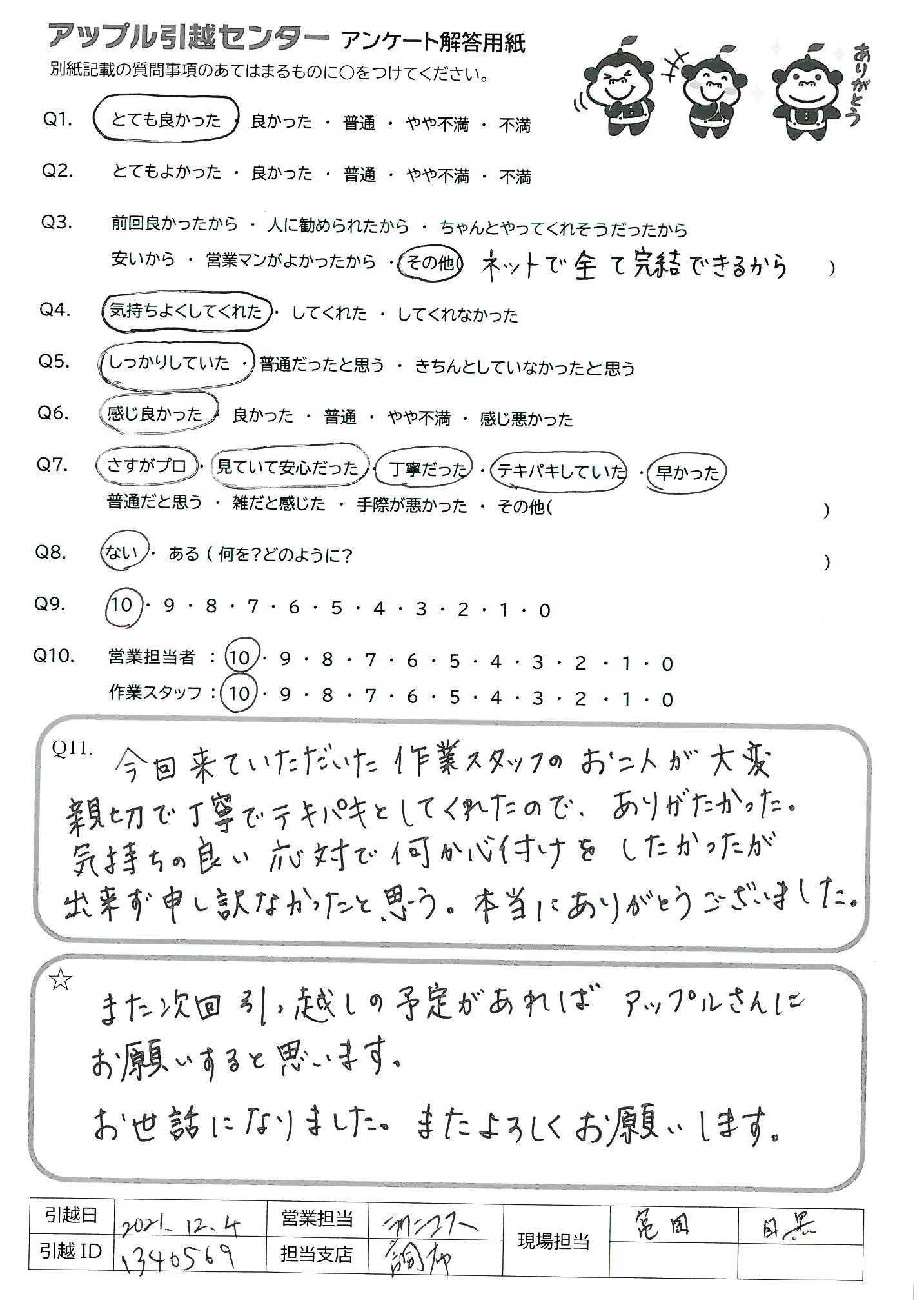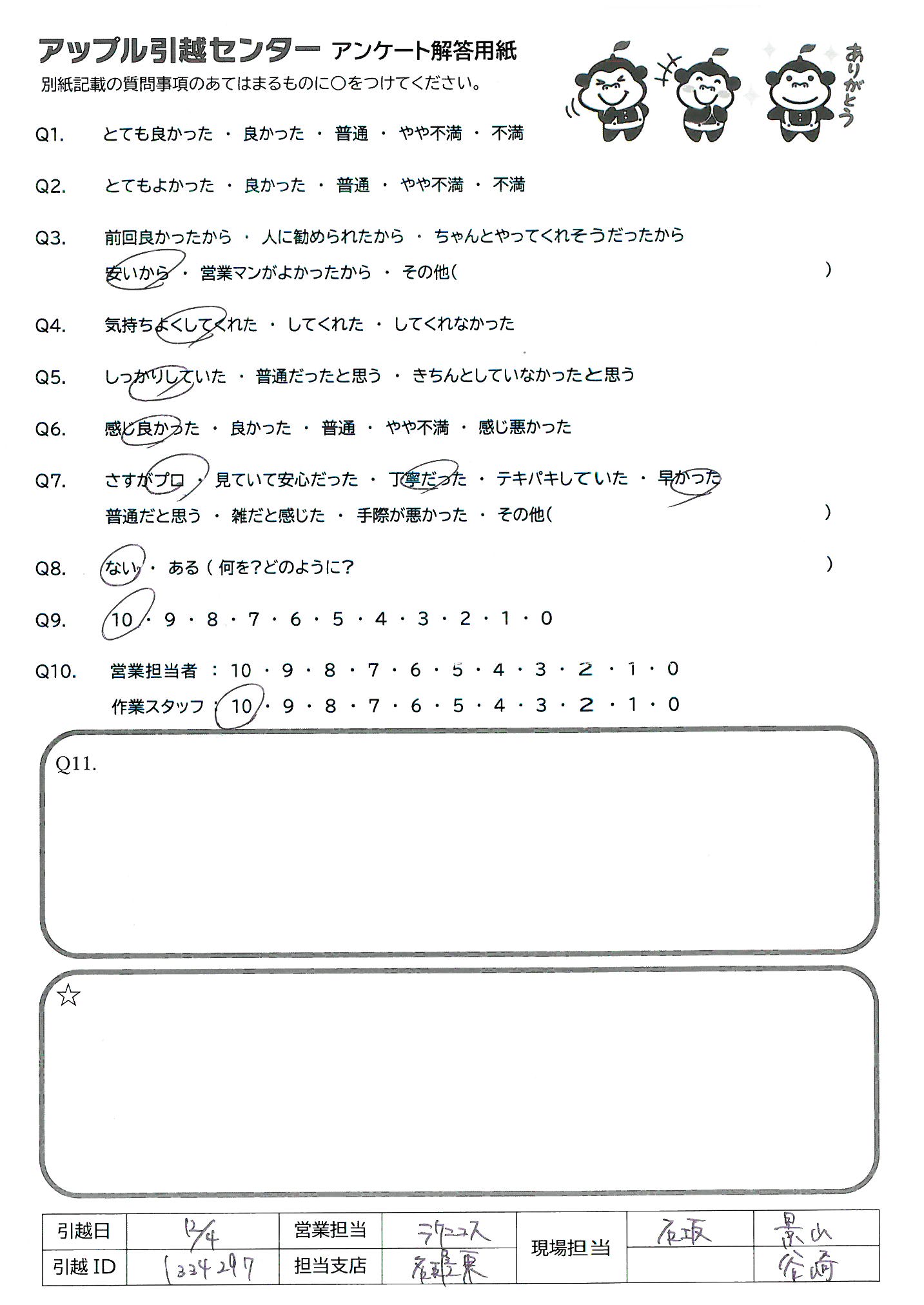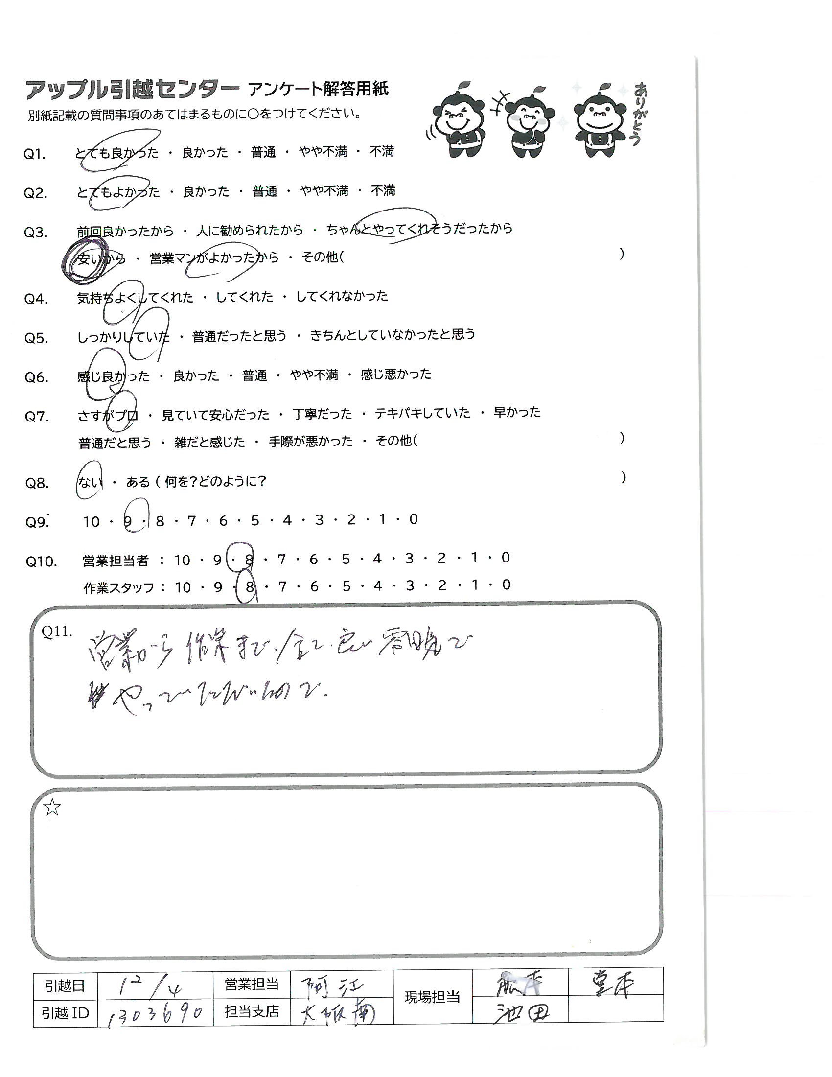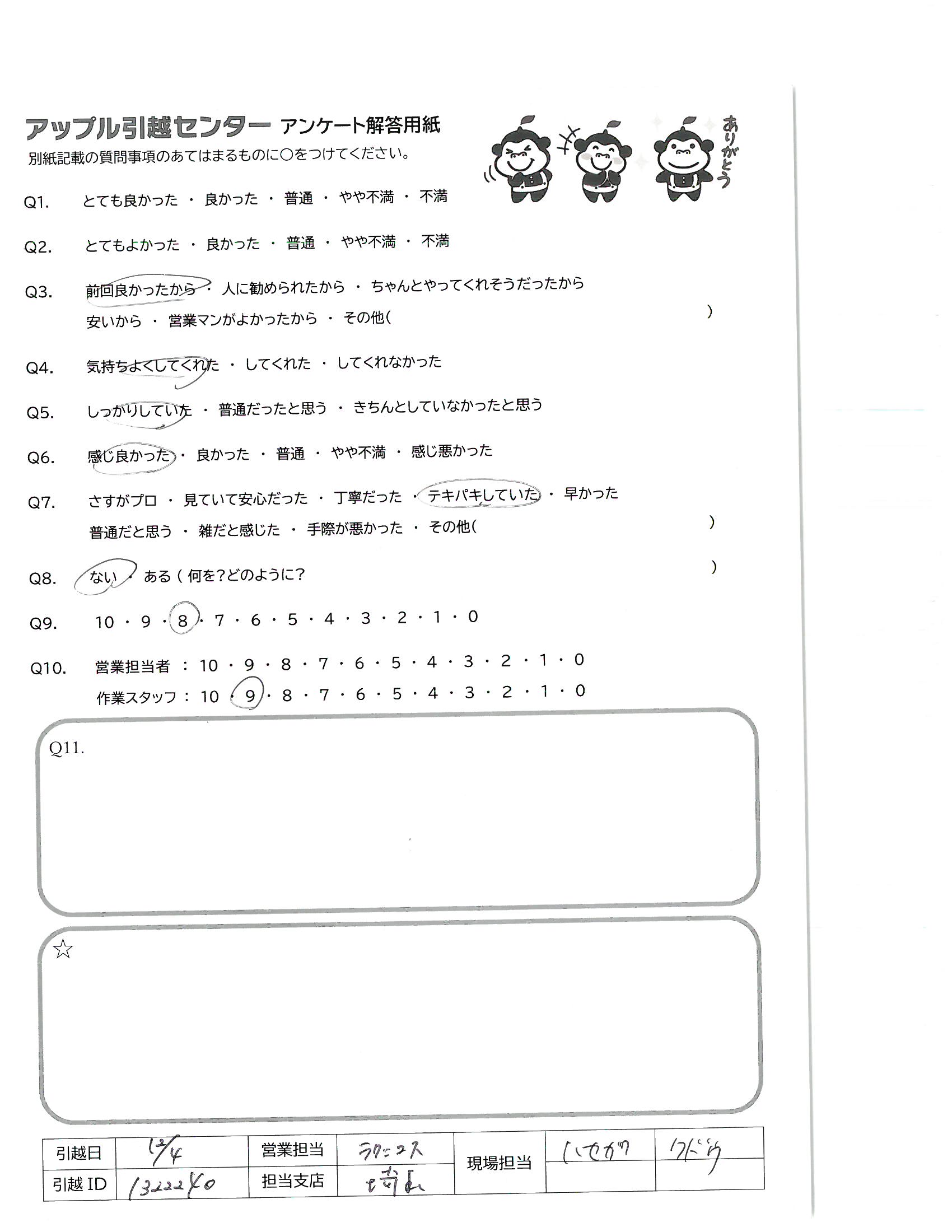 A.また引越す機会があればまたアップルさんにお願いしたいと思います。 有難とうございました。