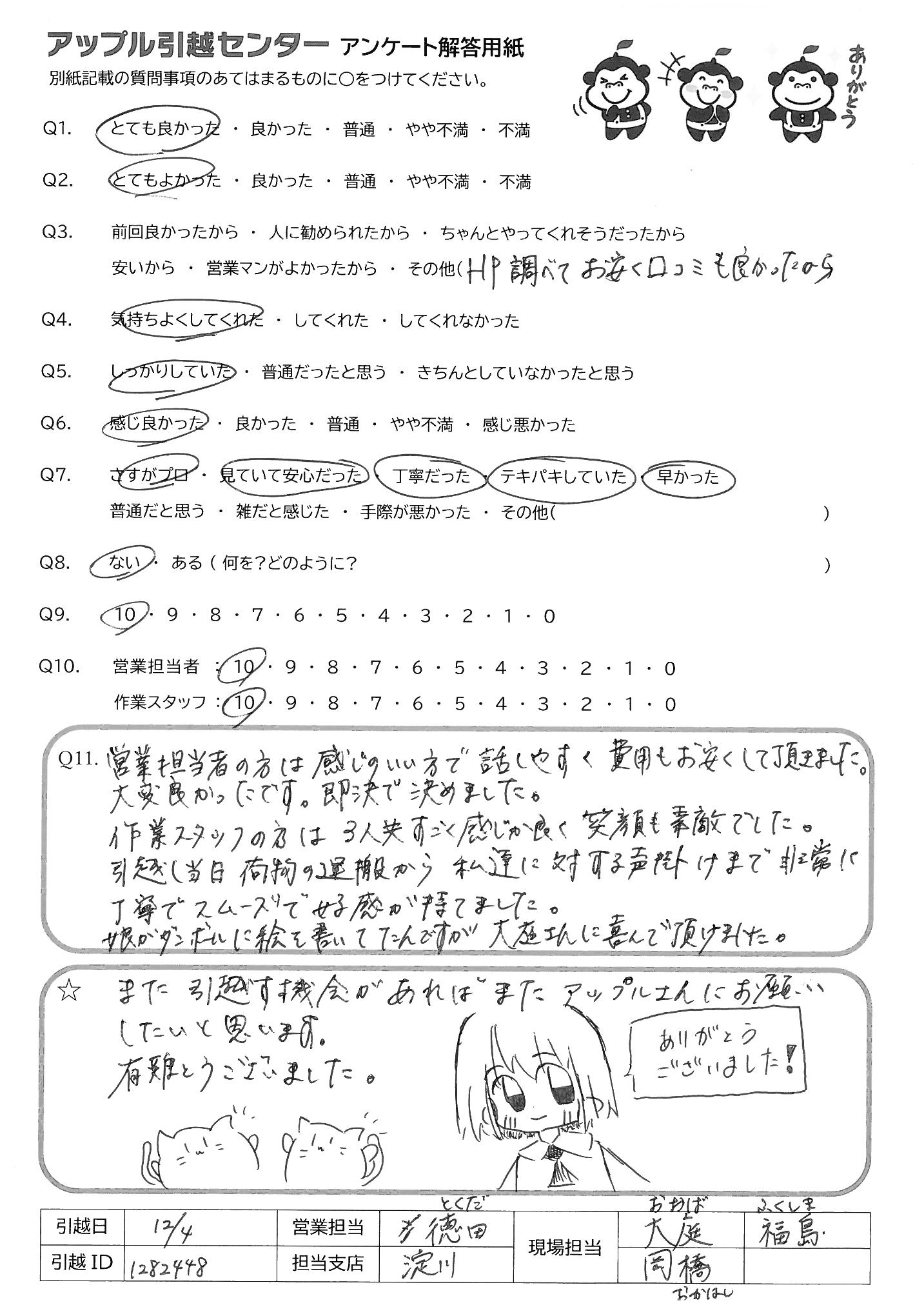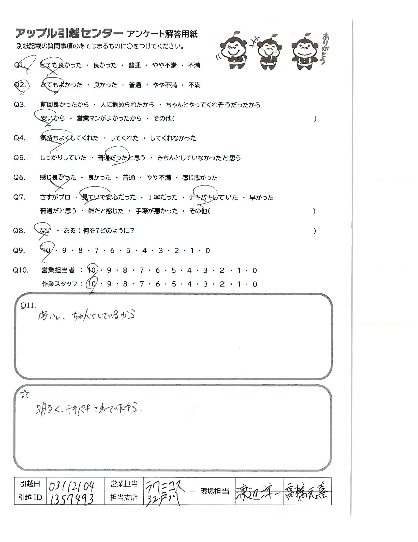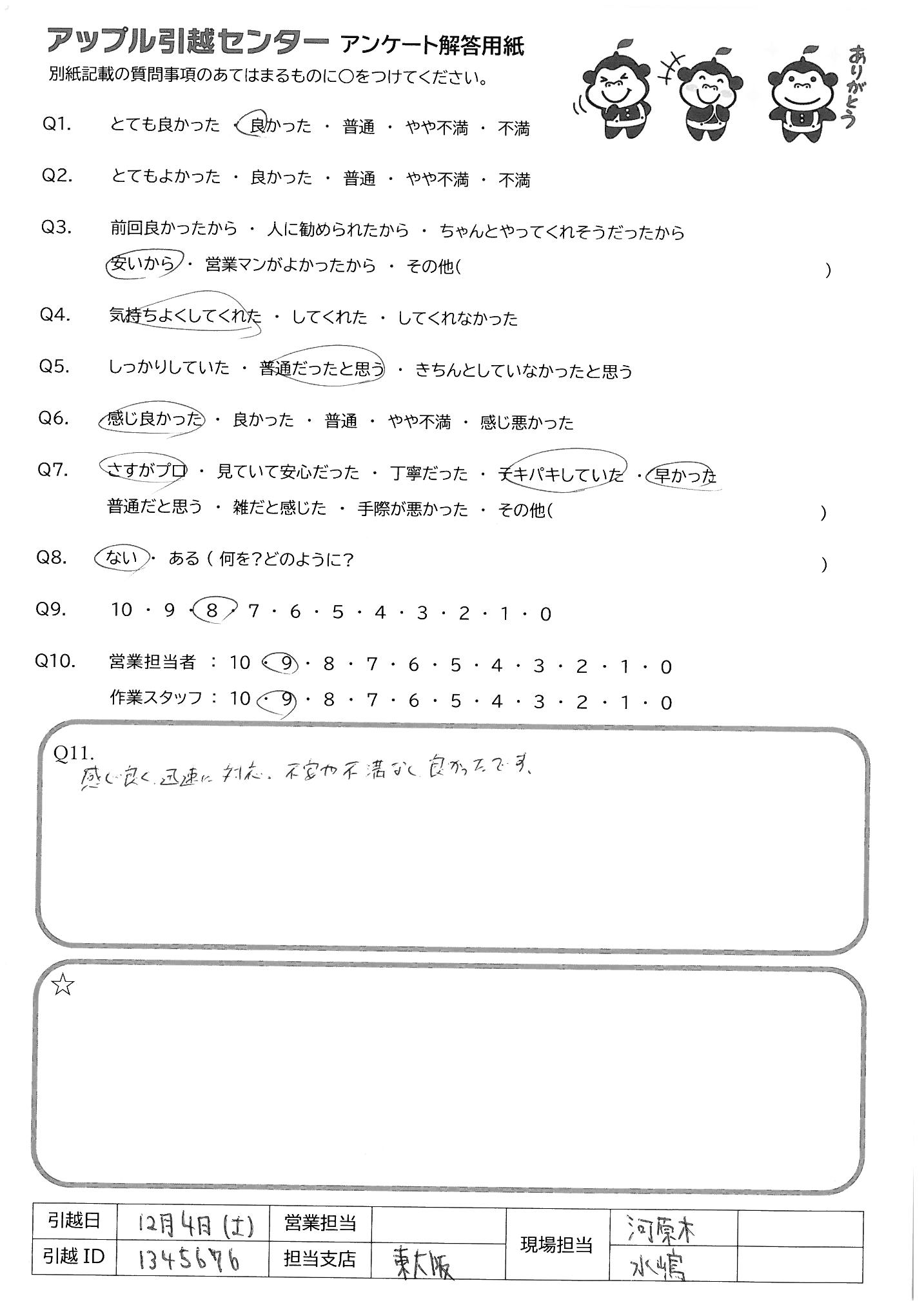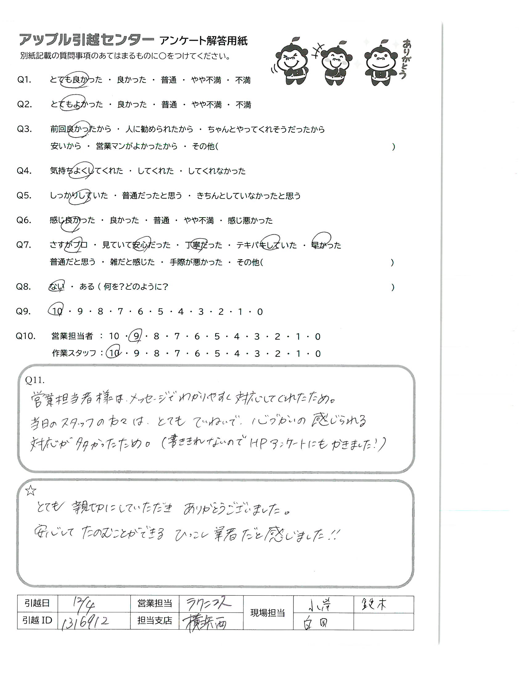 A.また引越す機会があればまたアップルさんにお願いしたいと思います。 有難とうございました。
